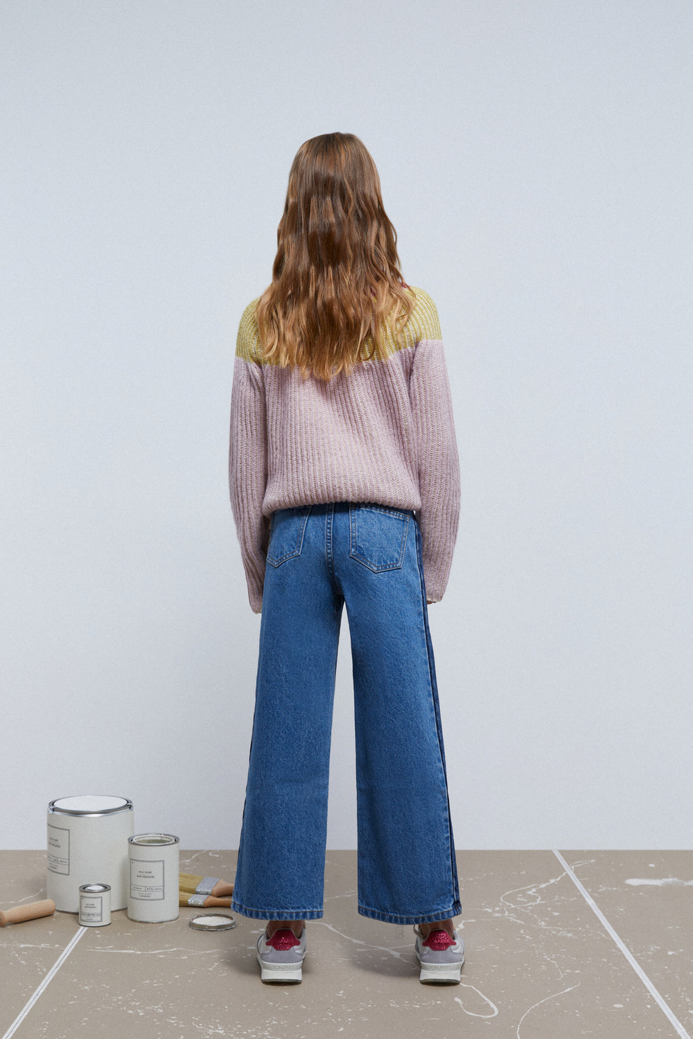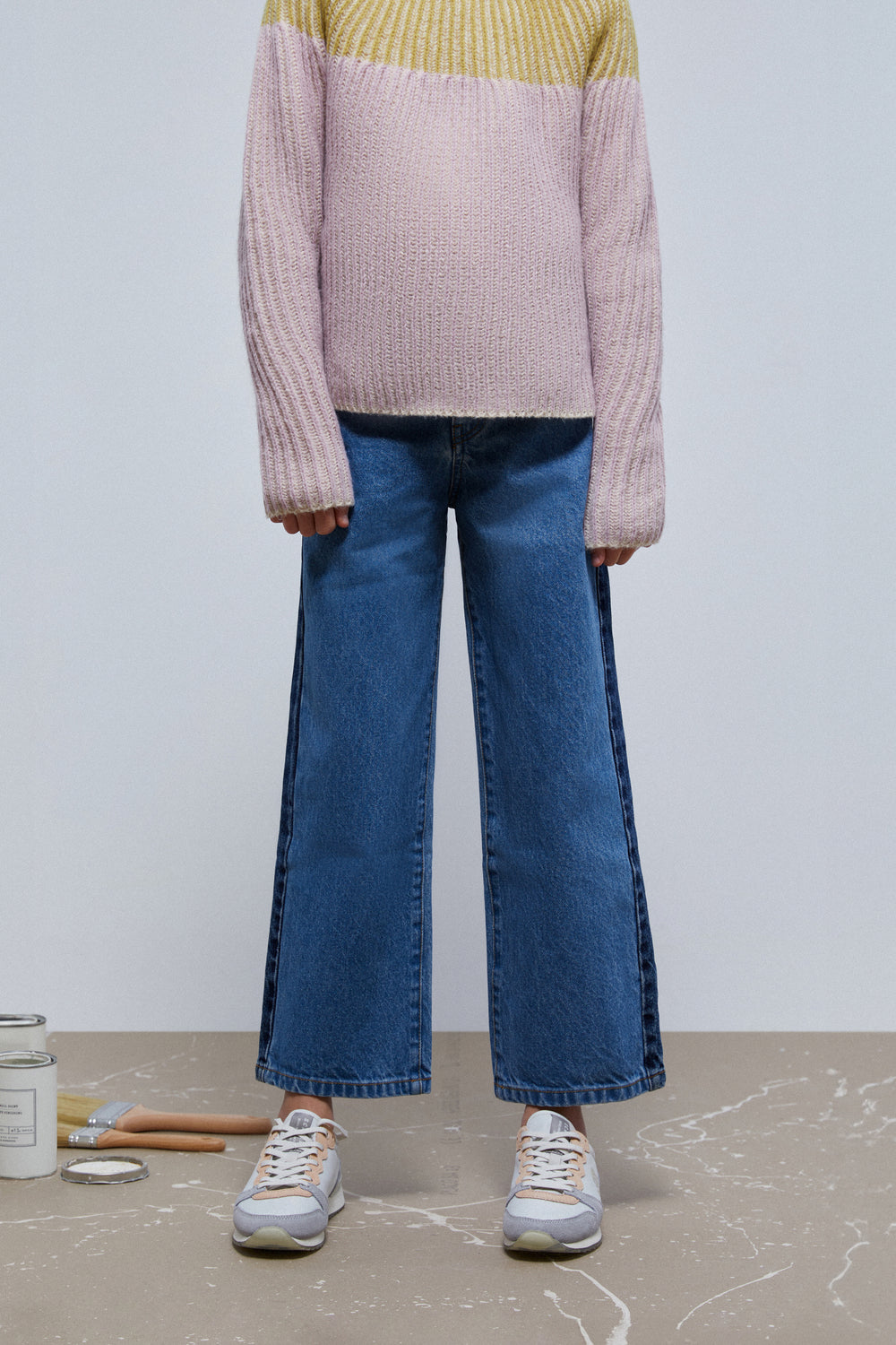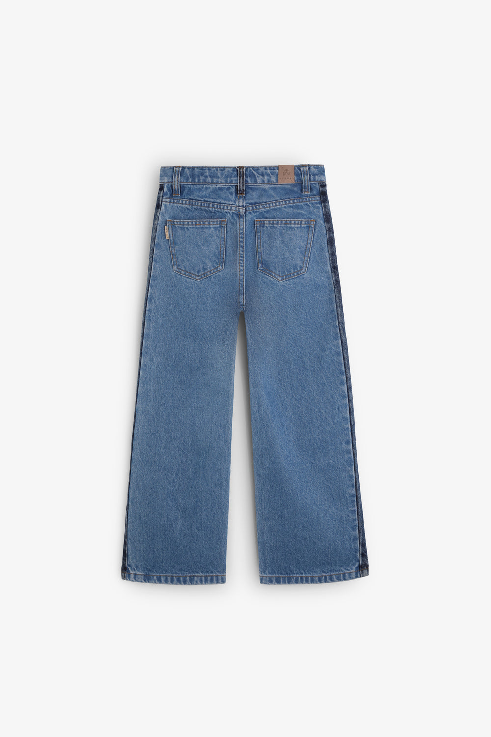 Pantalón vaquero con franja lateral oscura.