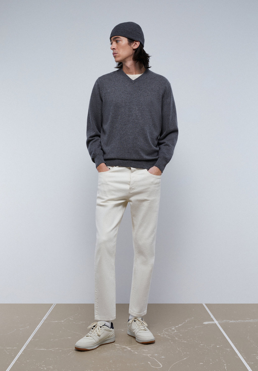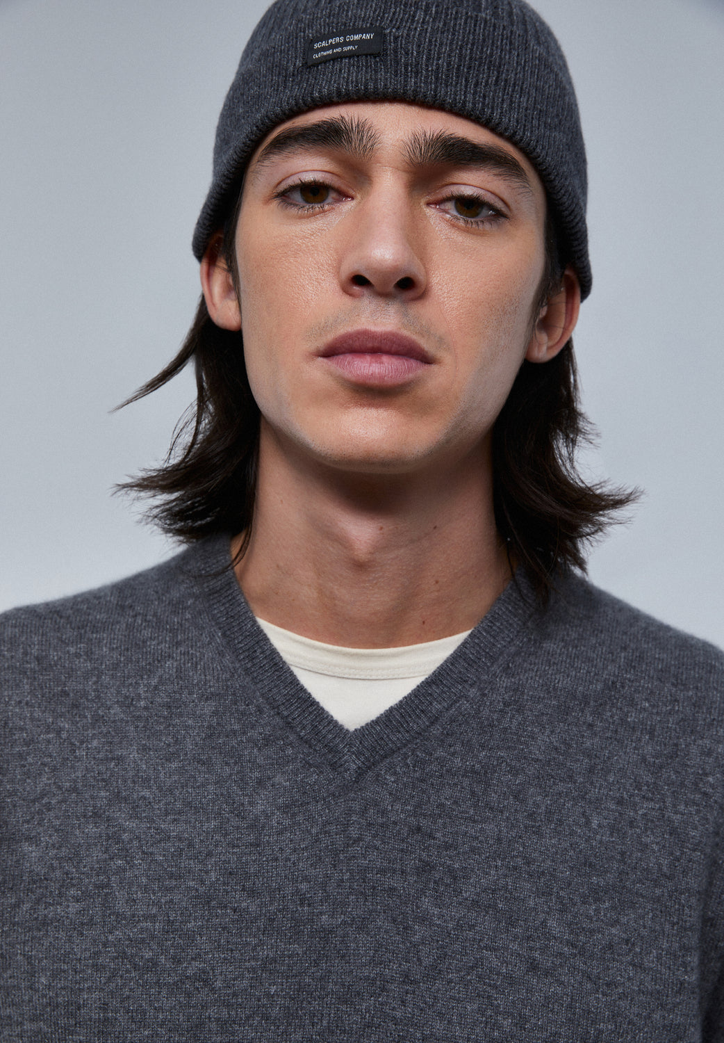 Jersey confeccionado en cachemira 100%. Corte Regular Fit. Cuello de pico. Manga larga.