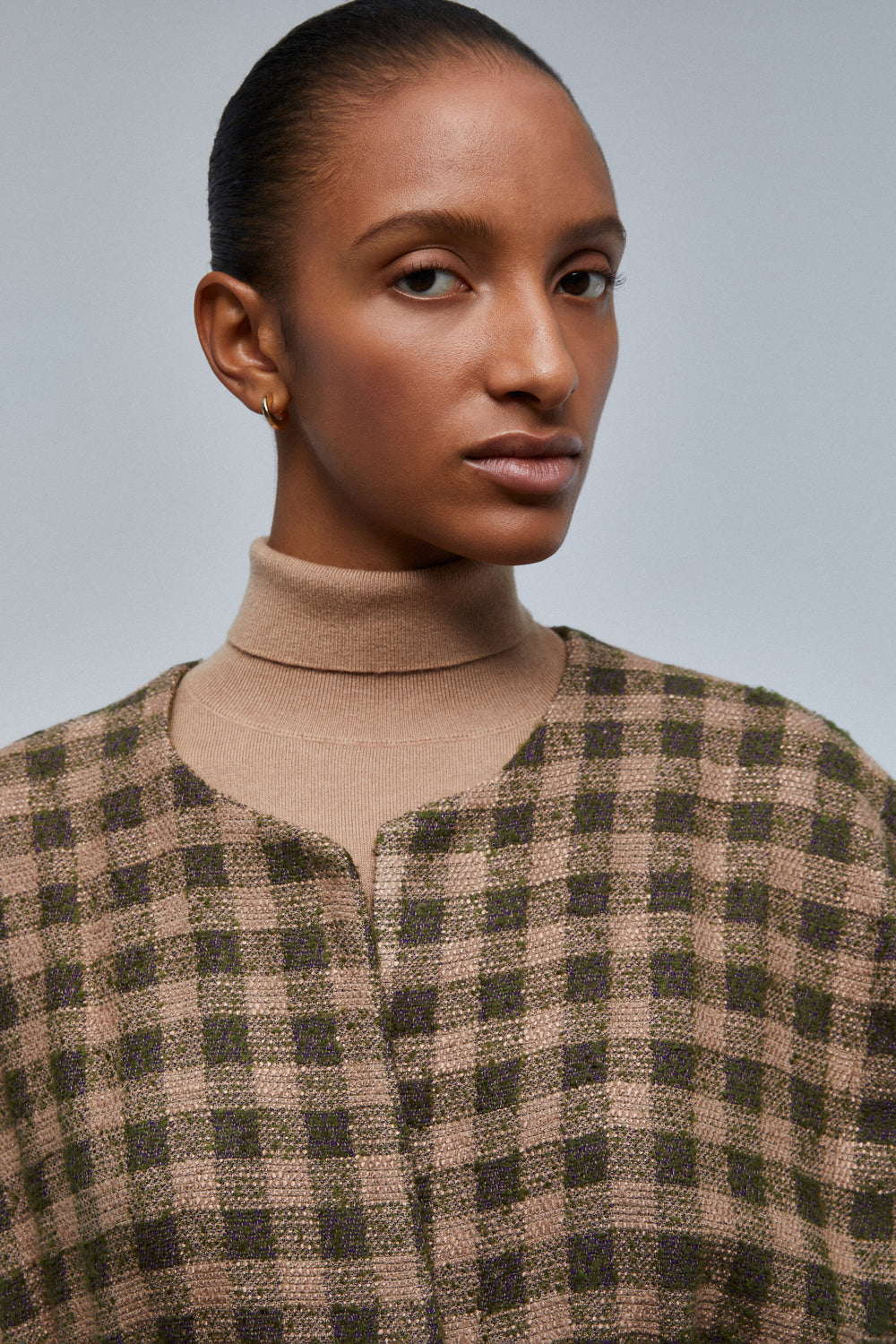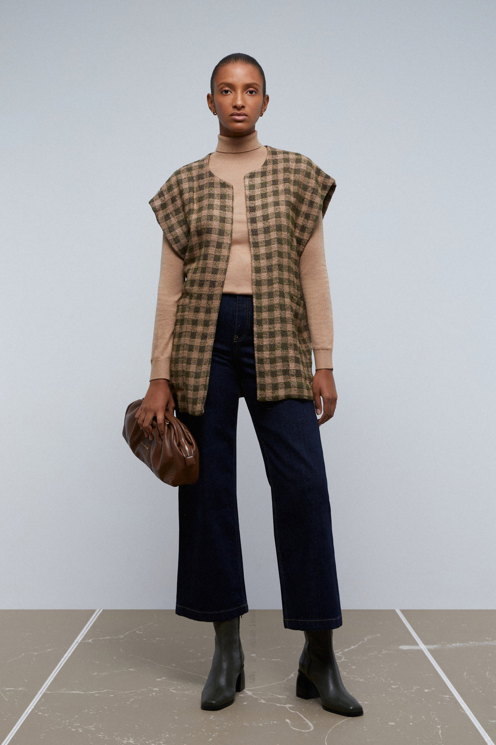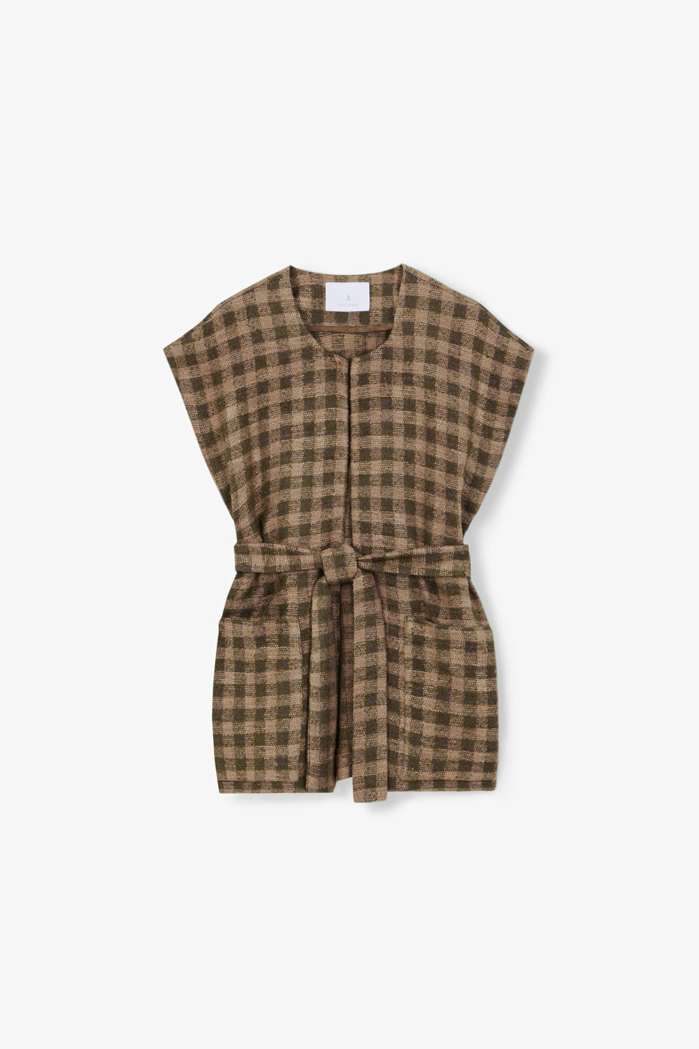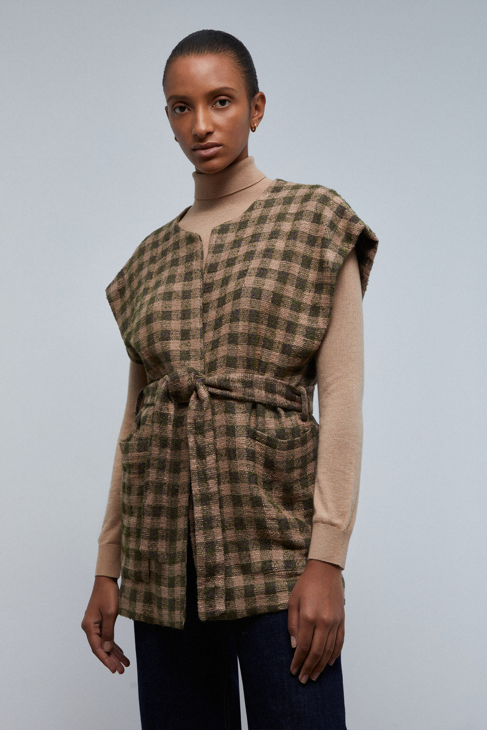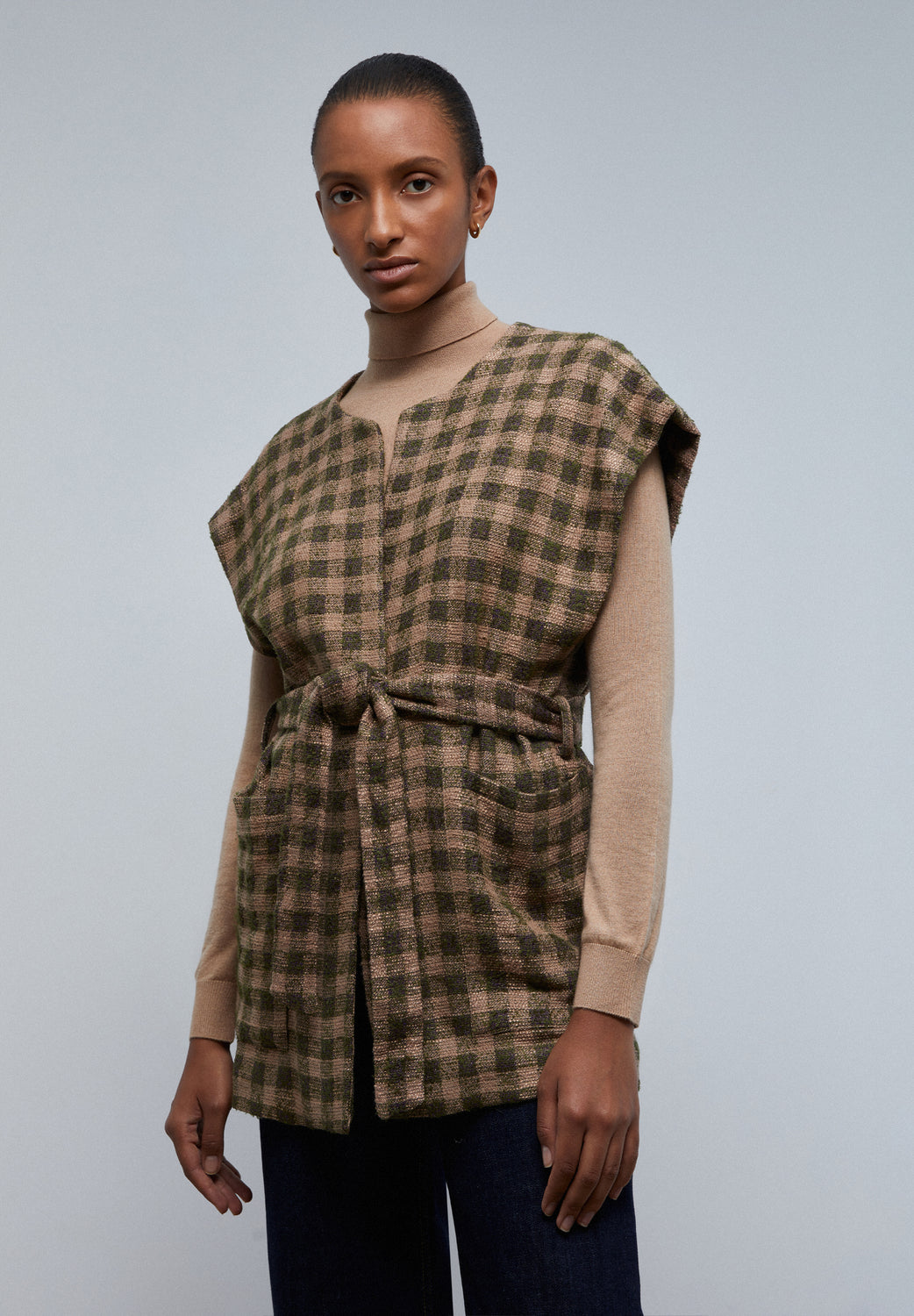 Chaleco de cuadros con lazada en cintura.