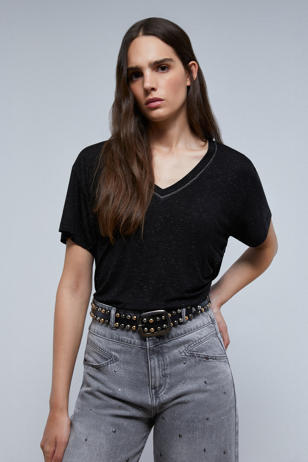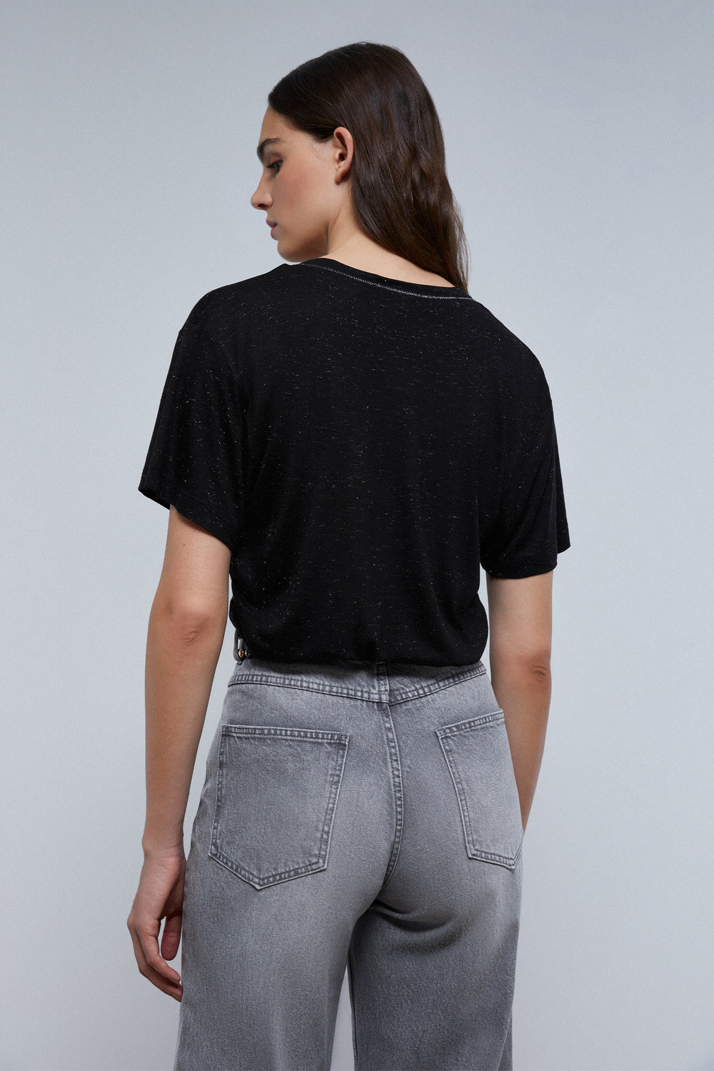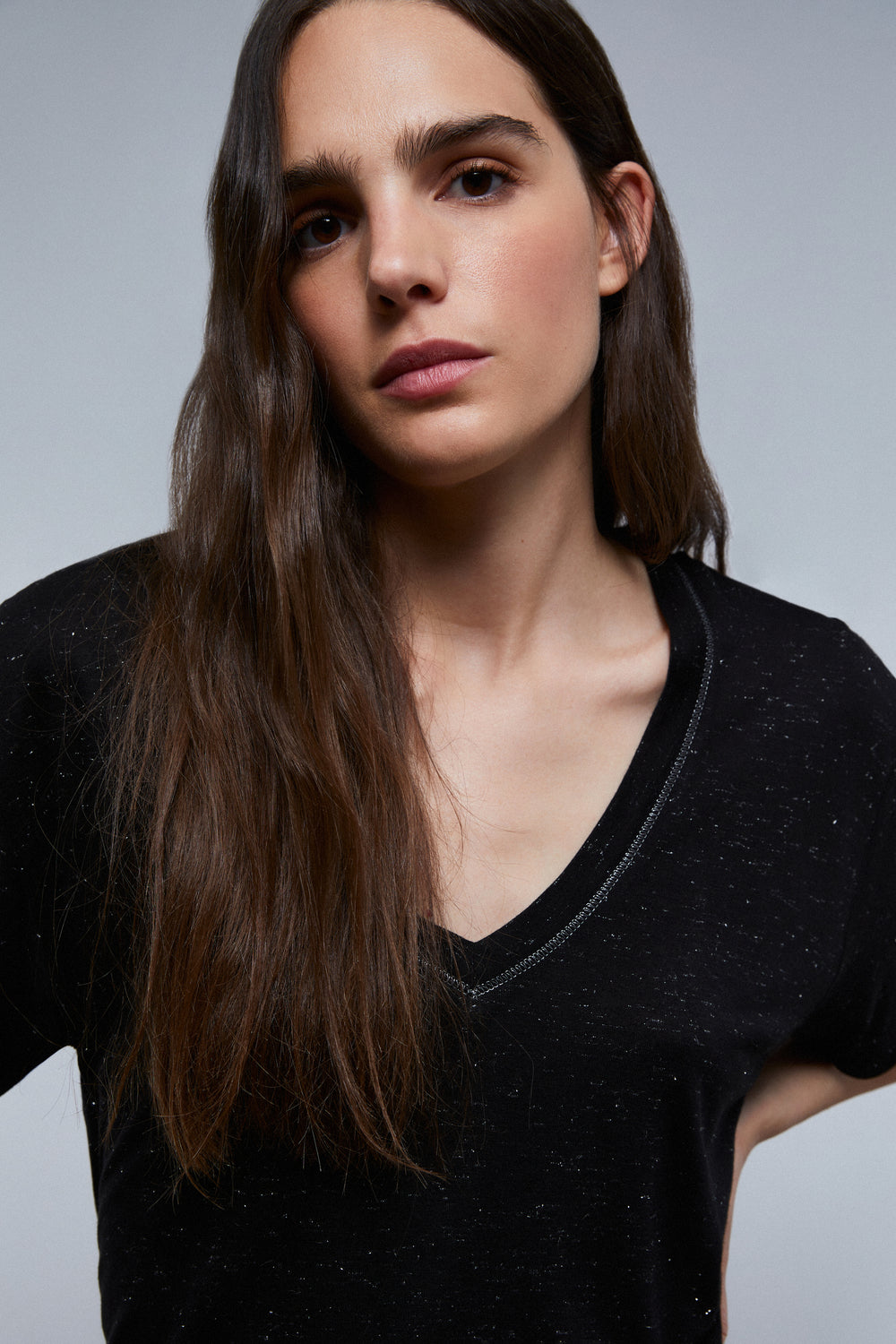 - Confeccionada en mezcla de fibras con detalle de hilatura metalizada