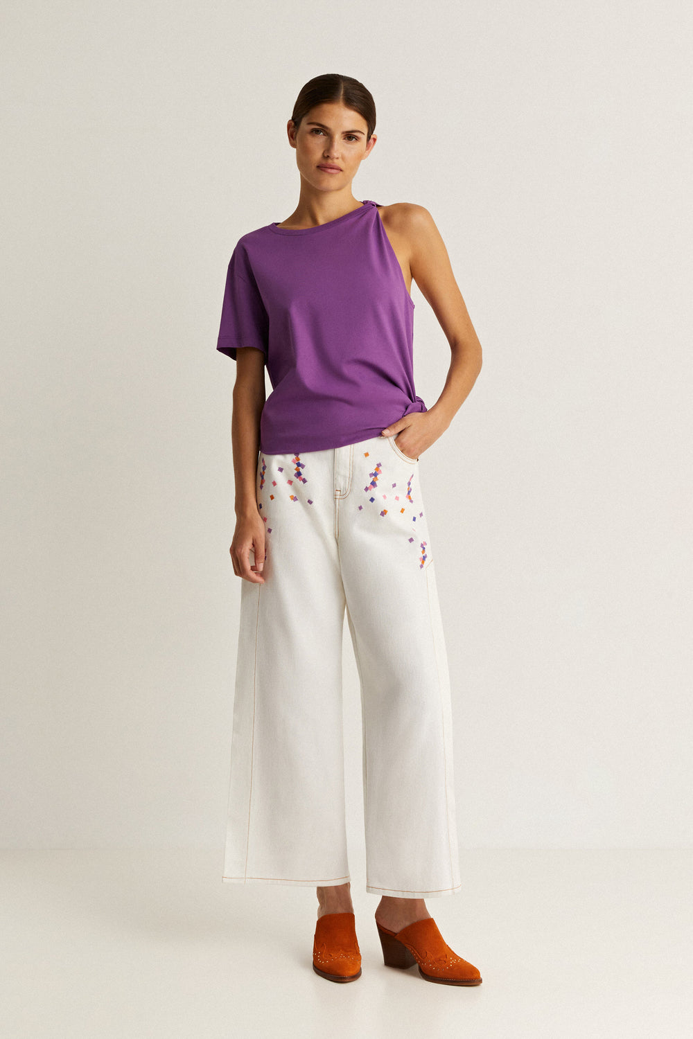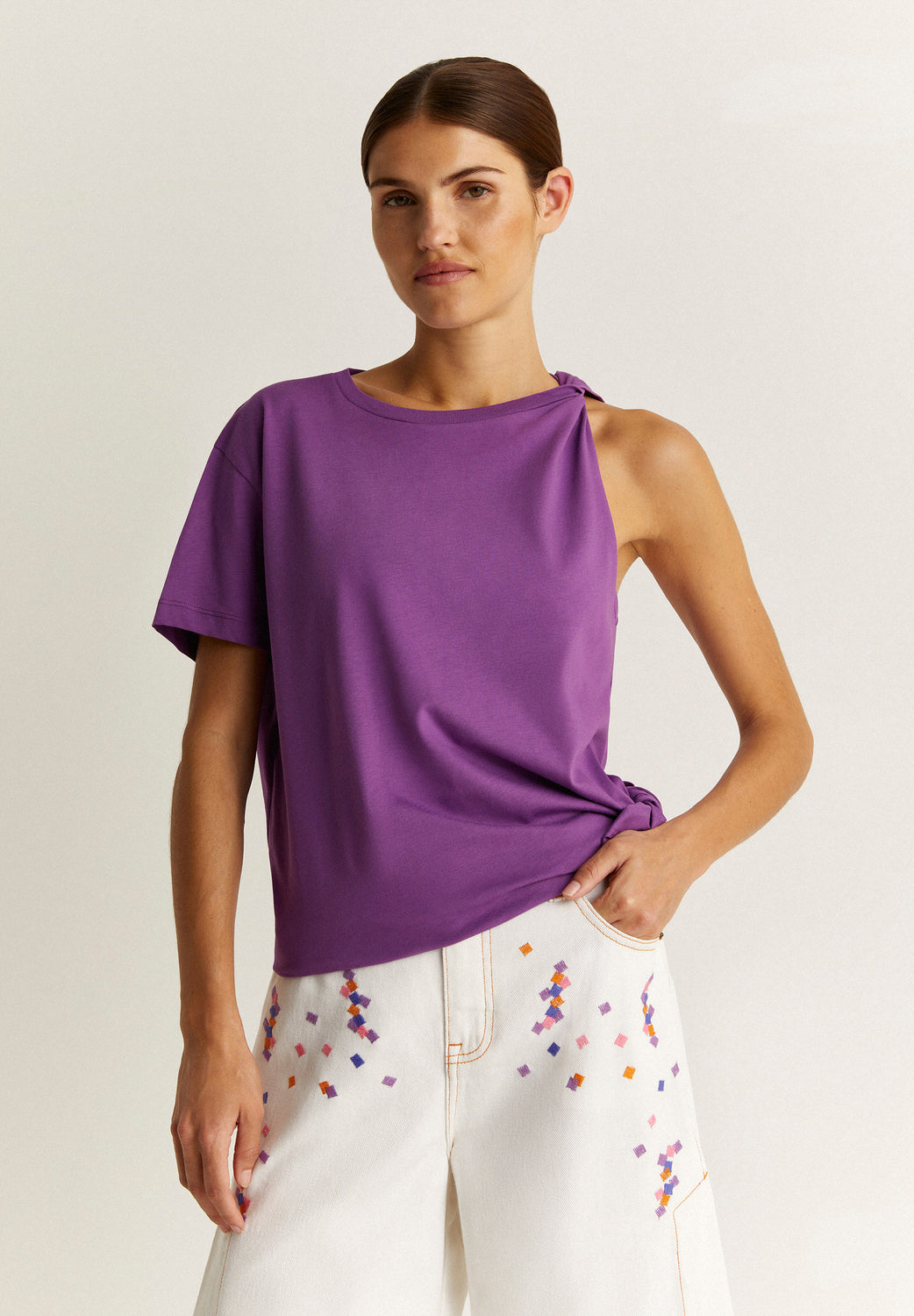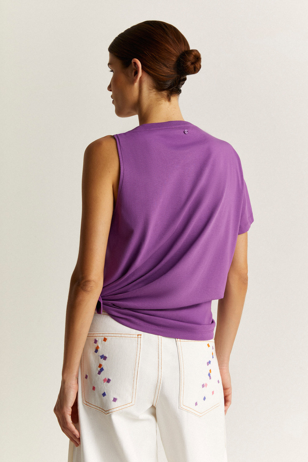 Camiseta con detalle de nudo en hombro.