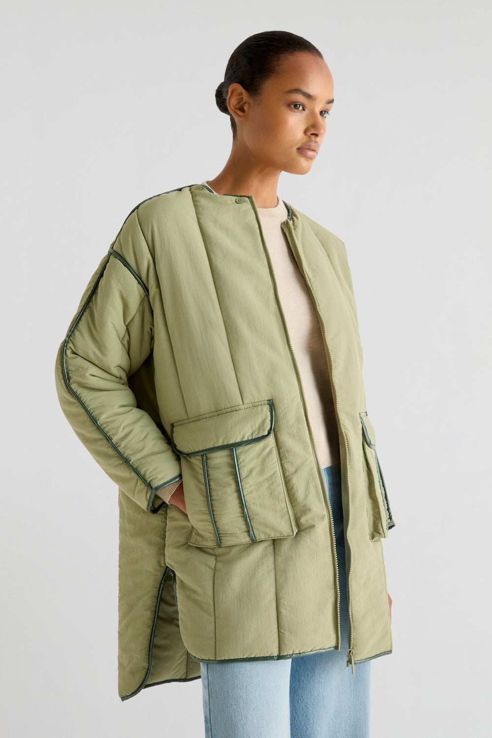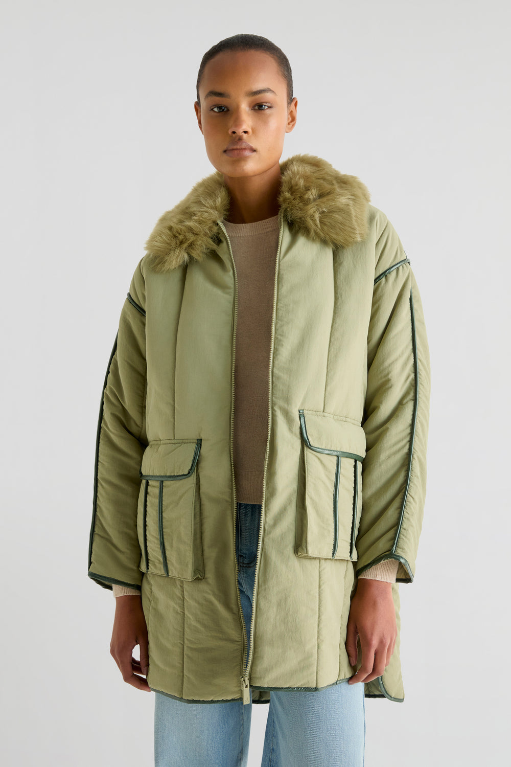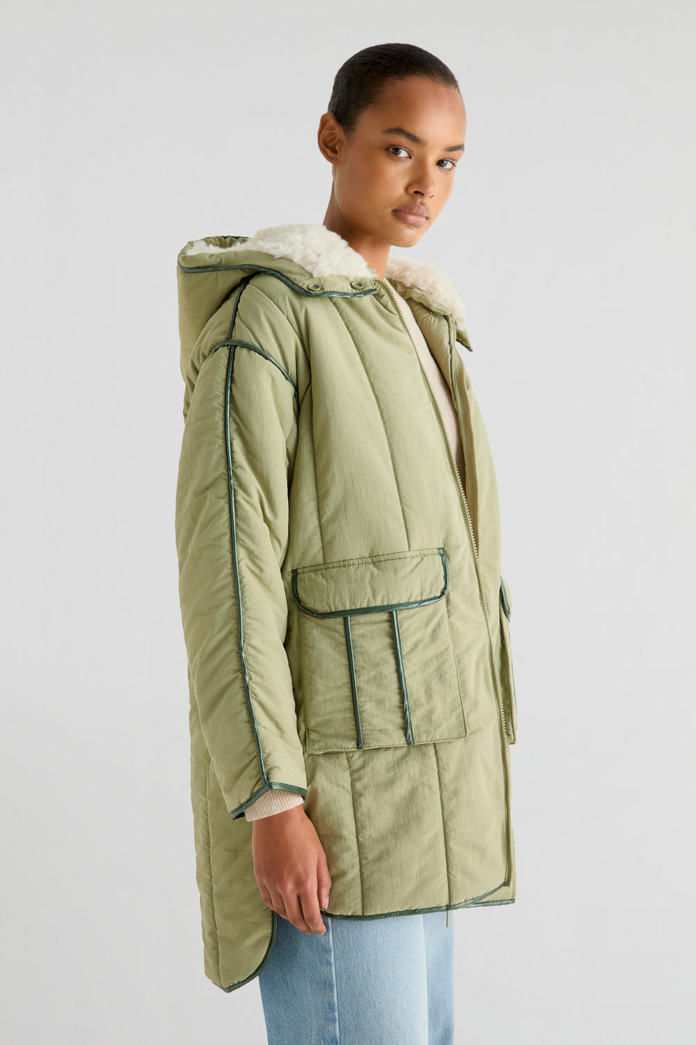 Abrigo acolchado confeccionado en tejido técnico. Regular fit, cuello con capucha desmontable y con pelo desmontable y cierre con cremallera. Manga larga e interior de borrego. Bajo redondeado y aberturas laterales y detalle de pipping en costuras.