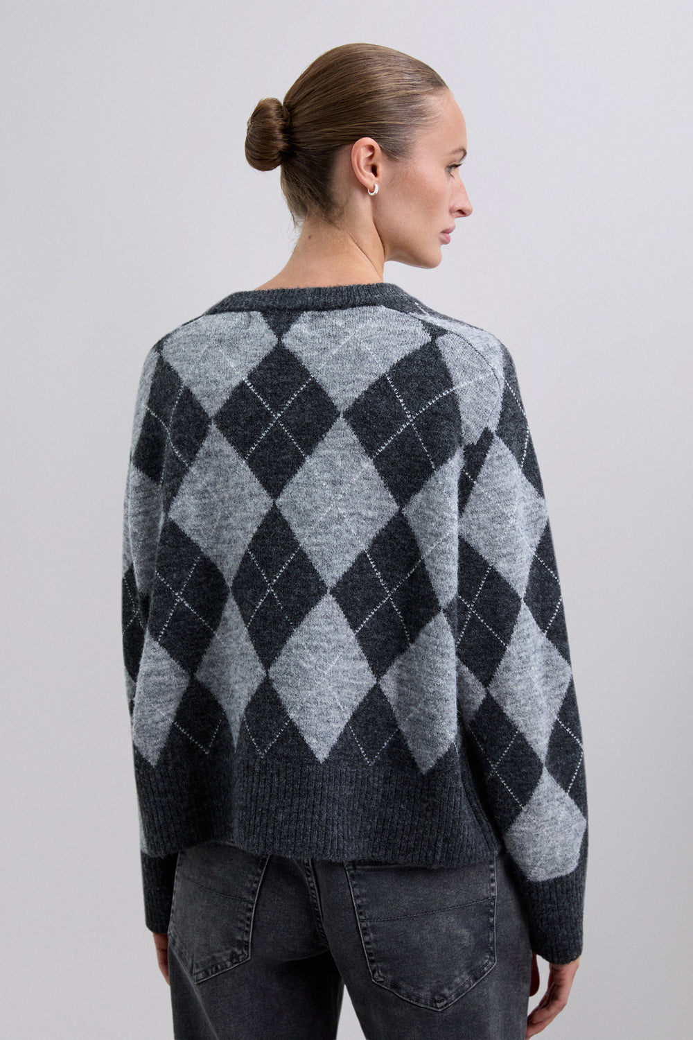 Jersey de rombos confeccionado en mezcla con lana. Regular fit. Cuello redondo y manga larga con acabados en rib.