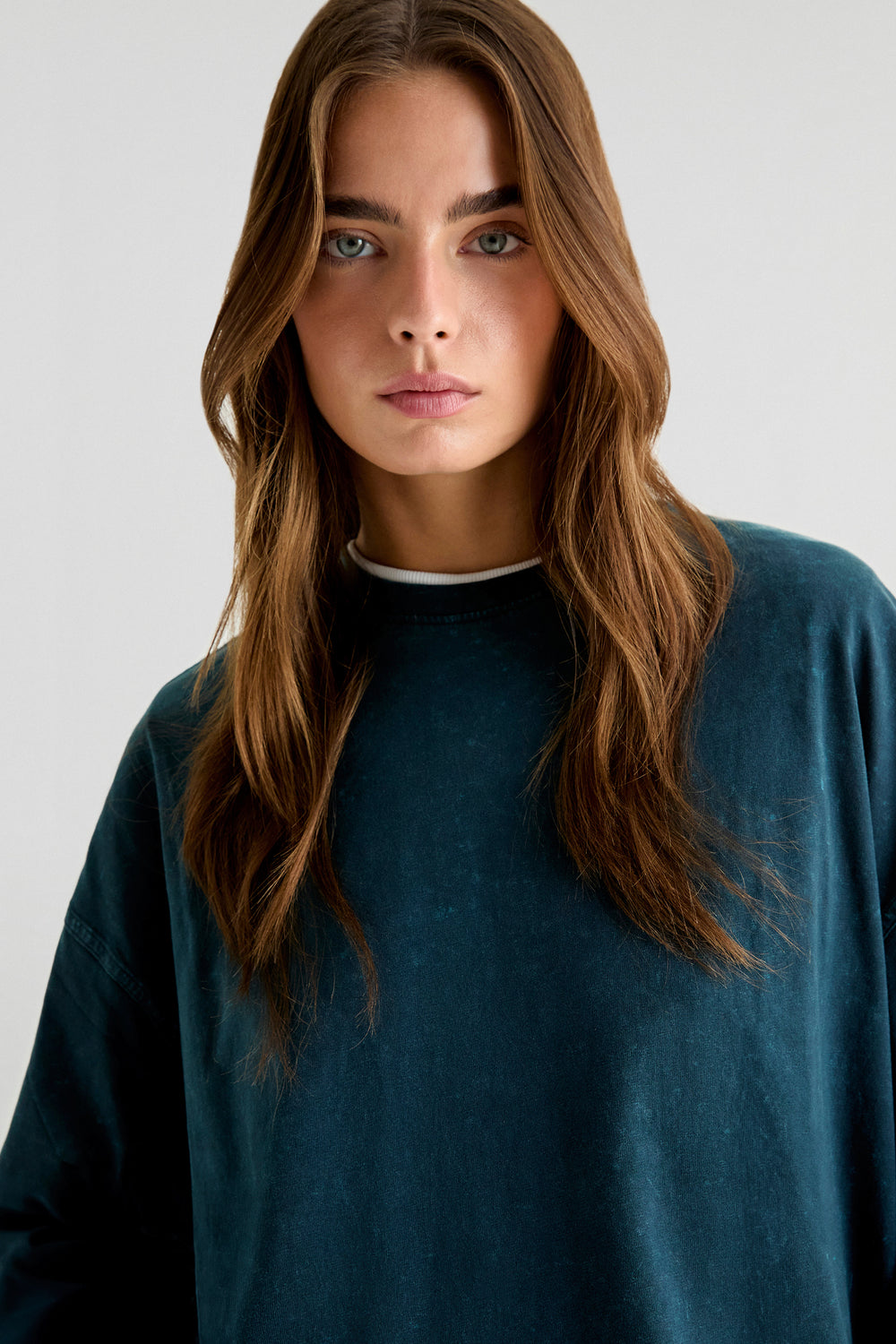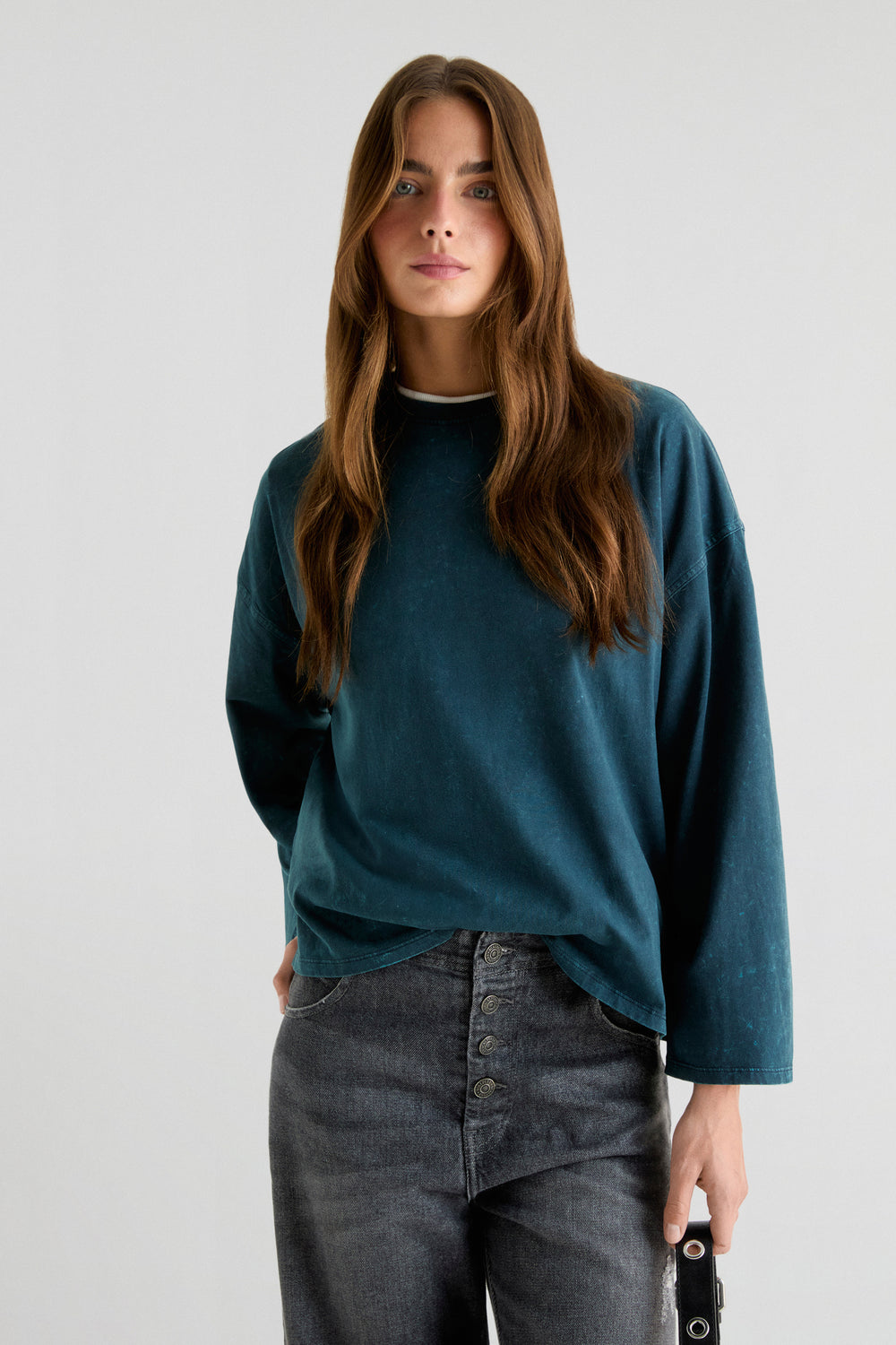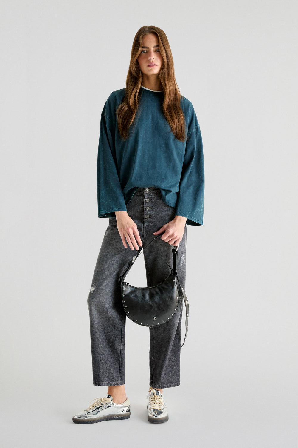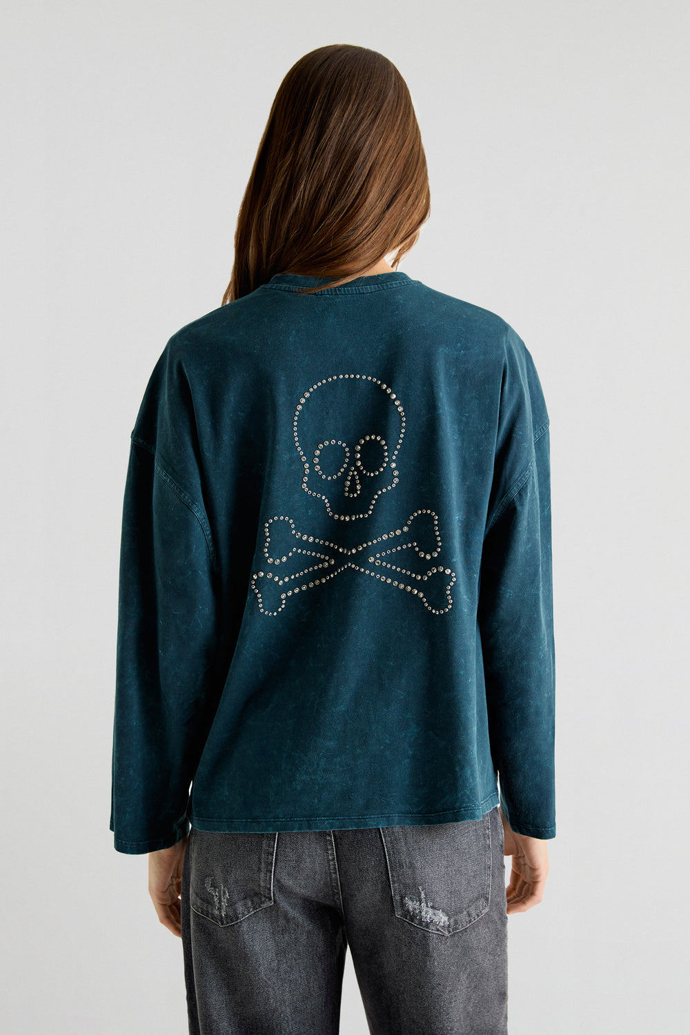 Camiseta lavada confeccionada en 100% algodón BCI. Fit ligeramente oversize, cuello redondo y manga larga. Calavera trasera de tachuelas.