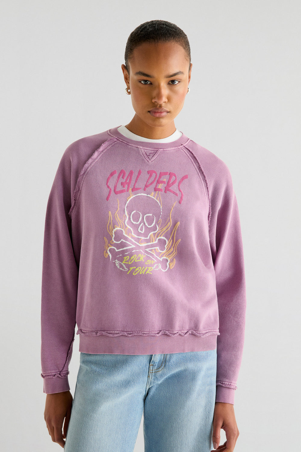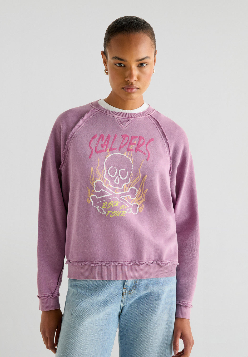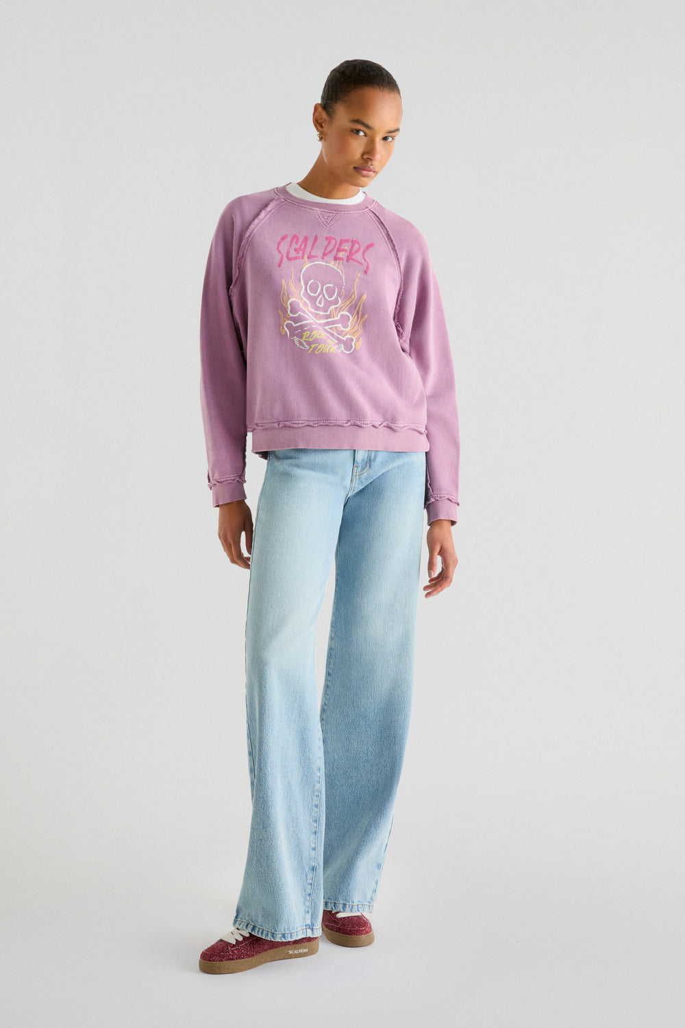 Sudadera lavada confeccionada en 100% algodón BCI. Regular fit, cuello redondo y manga larga. Detalle de print frontal de calavera.