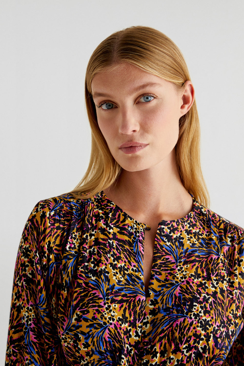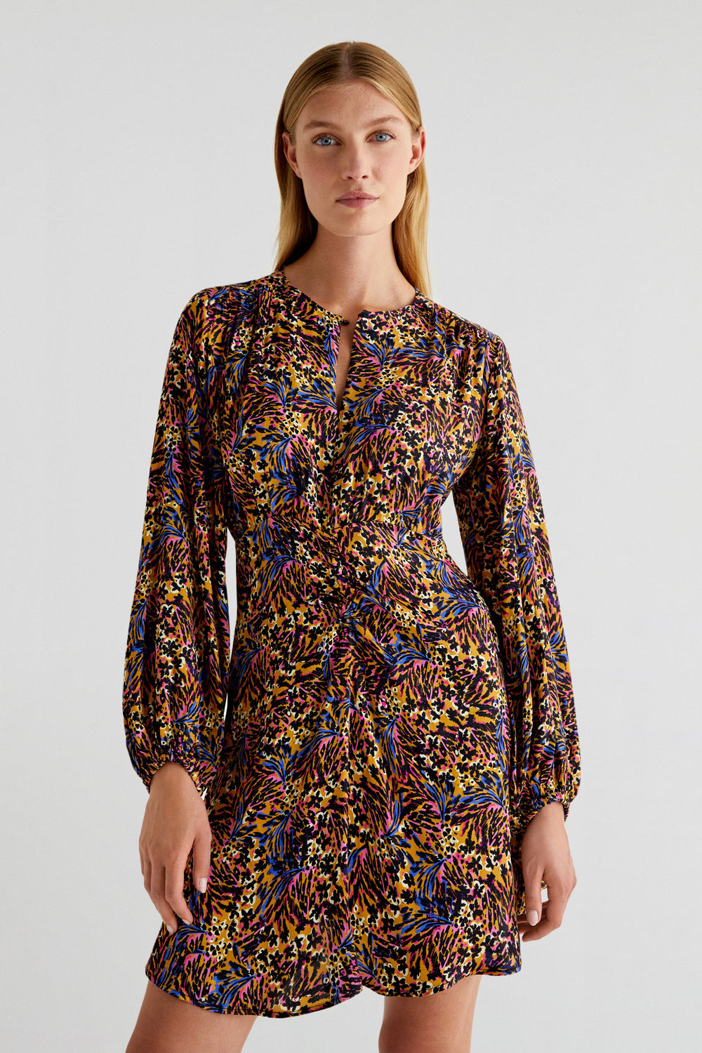 Vestido mini print confeccionado en tejido fluido. Regular fit, cierre con botón trasero y manga larga.