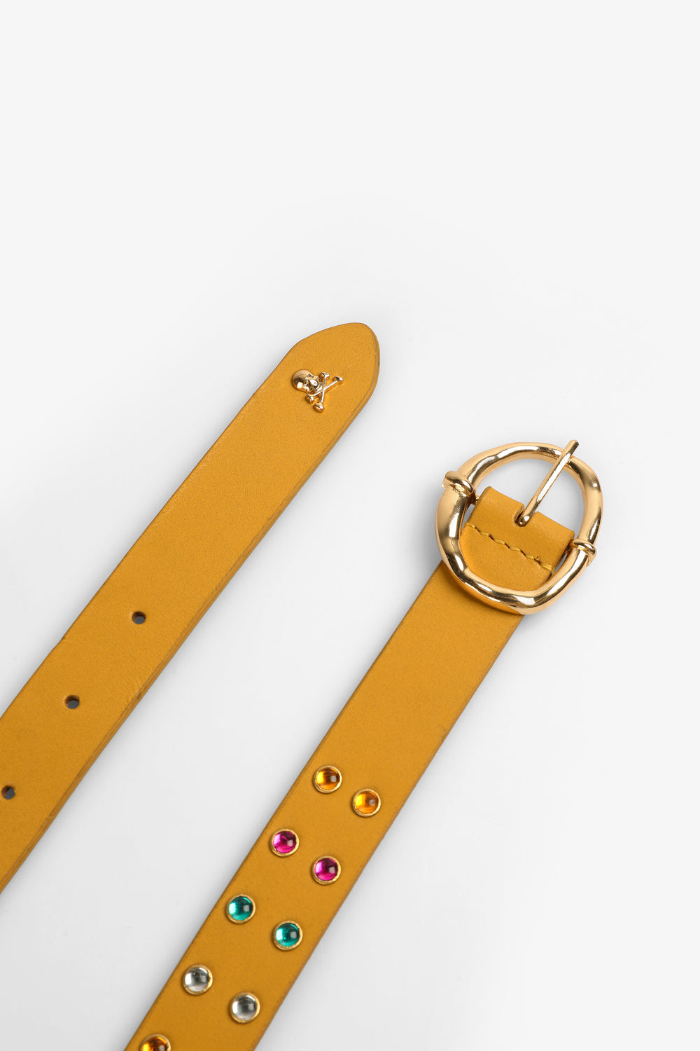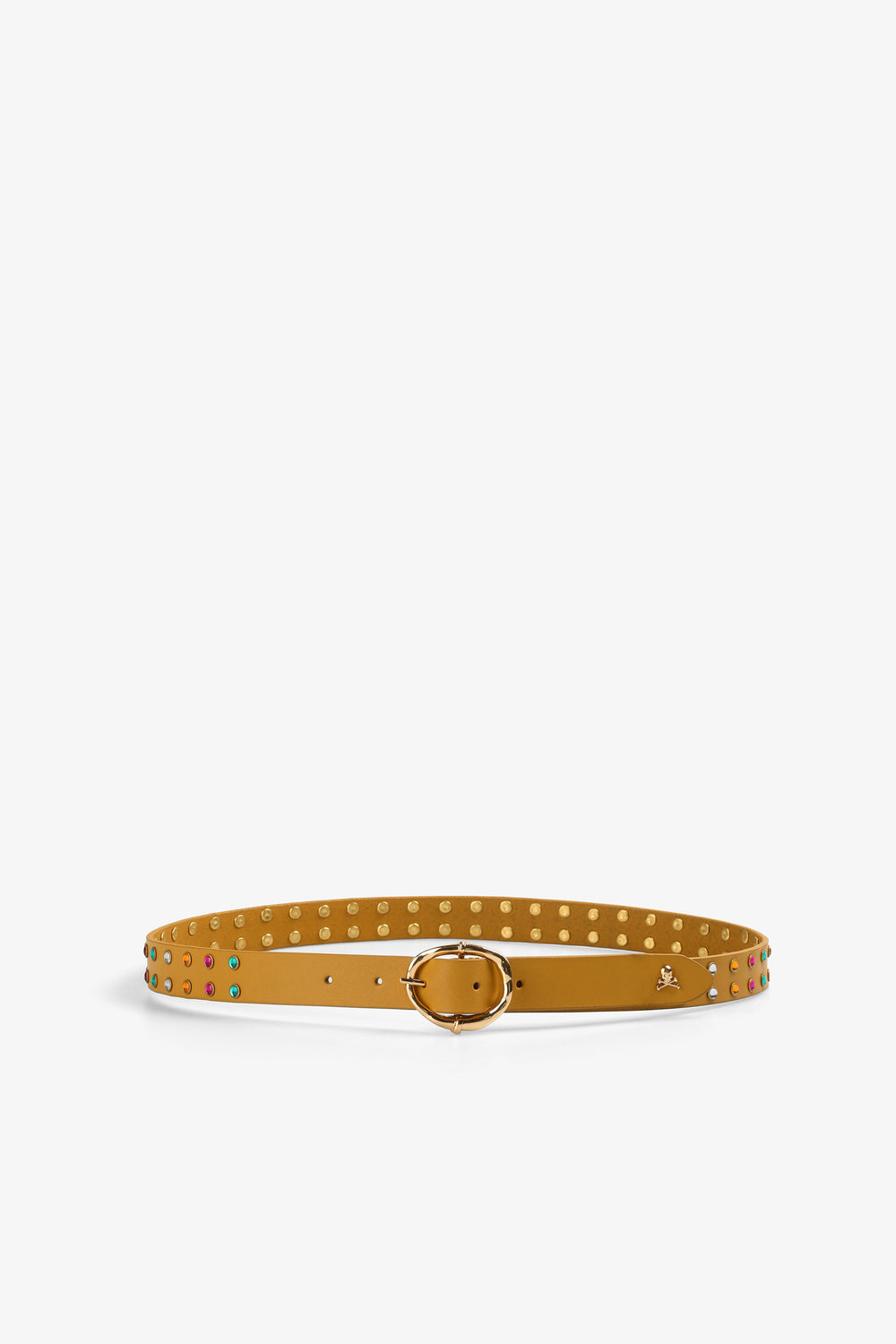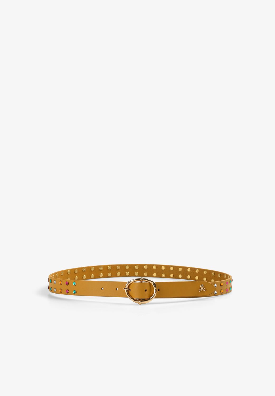 Cinturón con detalle de tachas multicolor. Confeccionado en piel. Cierre con hebilla. Detalle de calavera metálica.