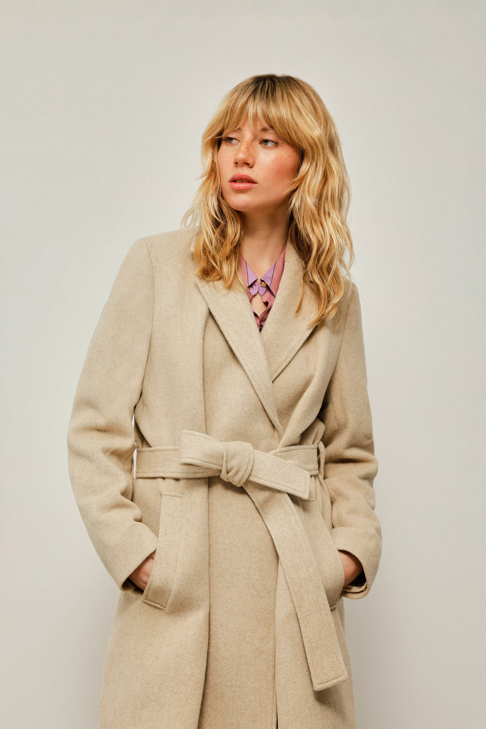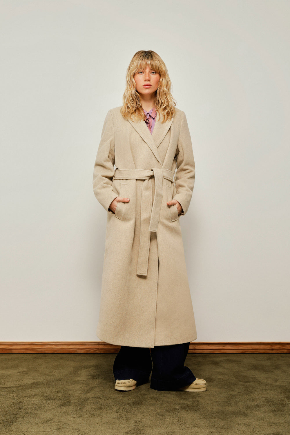Abrigo largo Samsoe confeccionado en tejido mezcla lana reciclada, poliéster y poliamida.