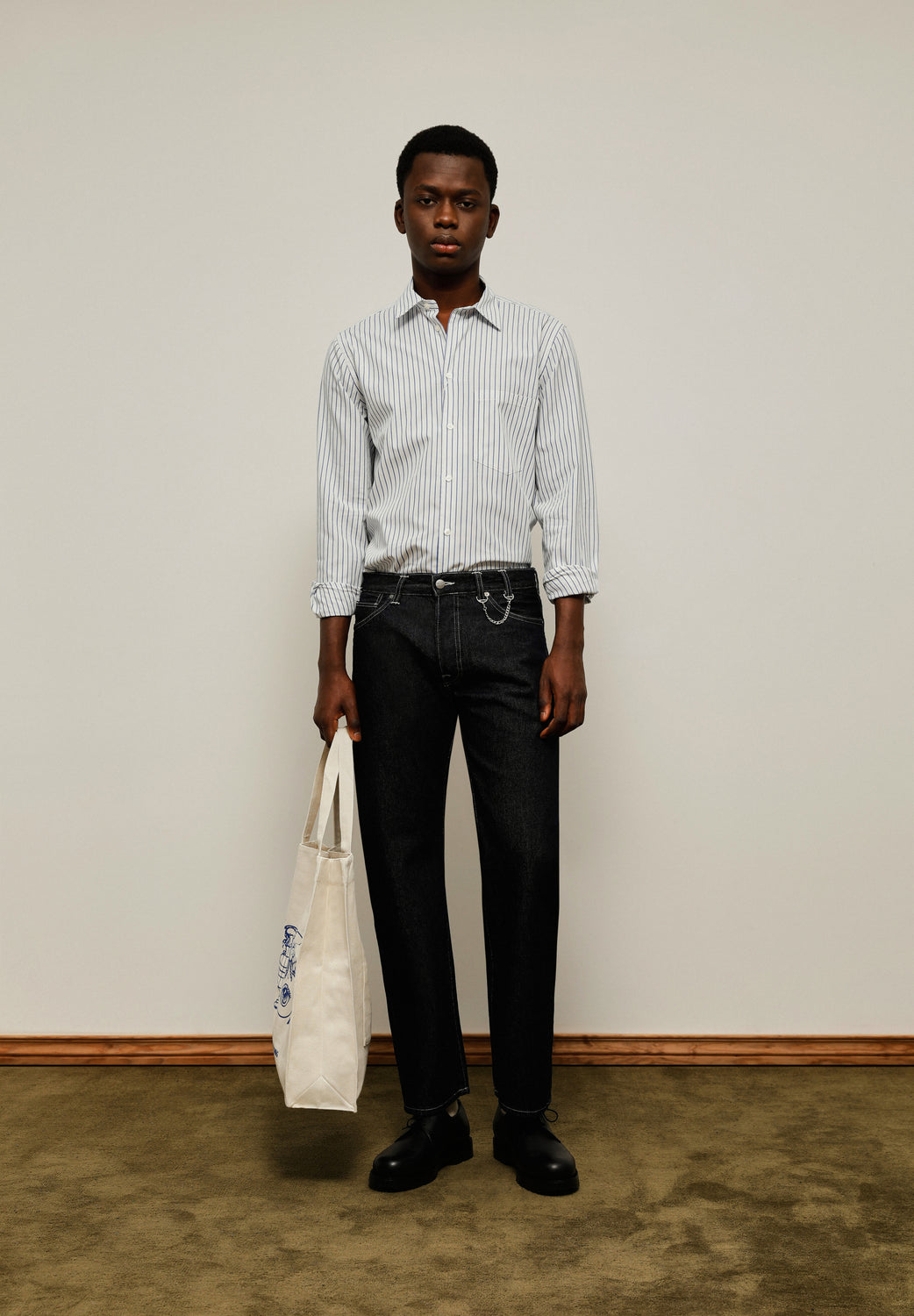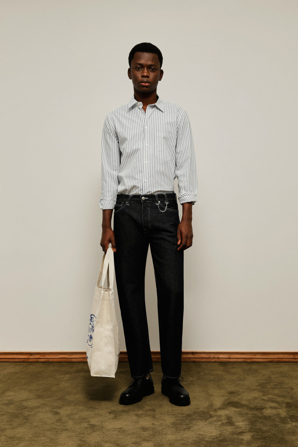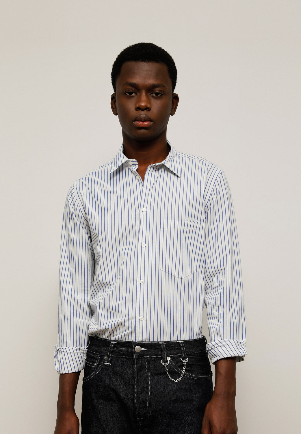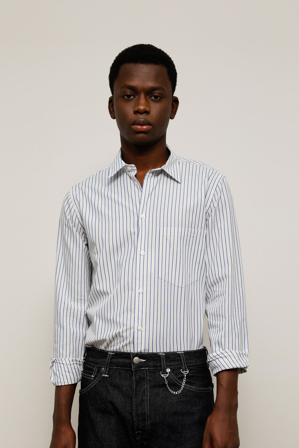 - Detalle bolsillo pecho y costura lateral curvada.