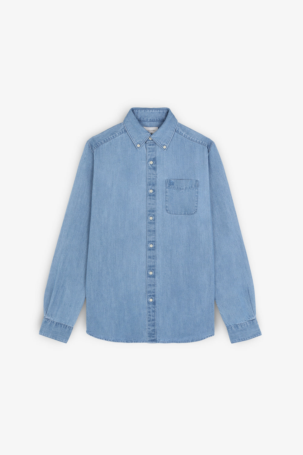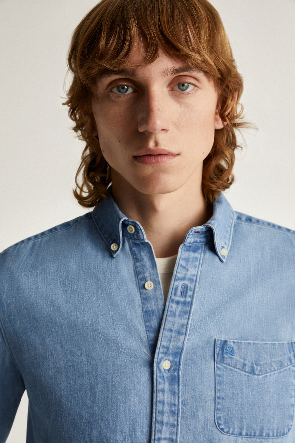 Camisa denim con detalle de calavera bordada a tono en pecho.