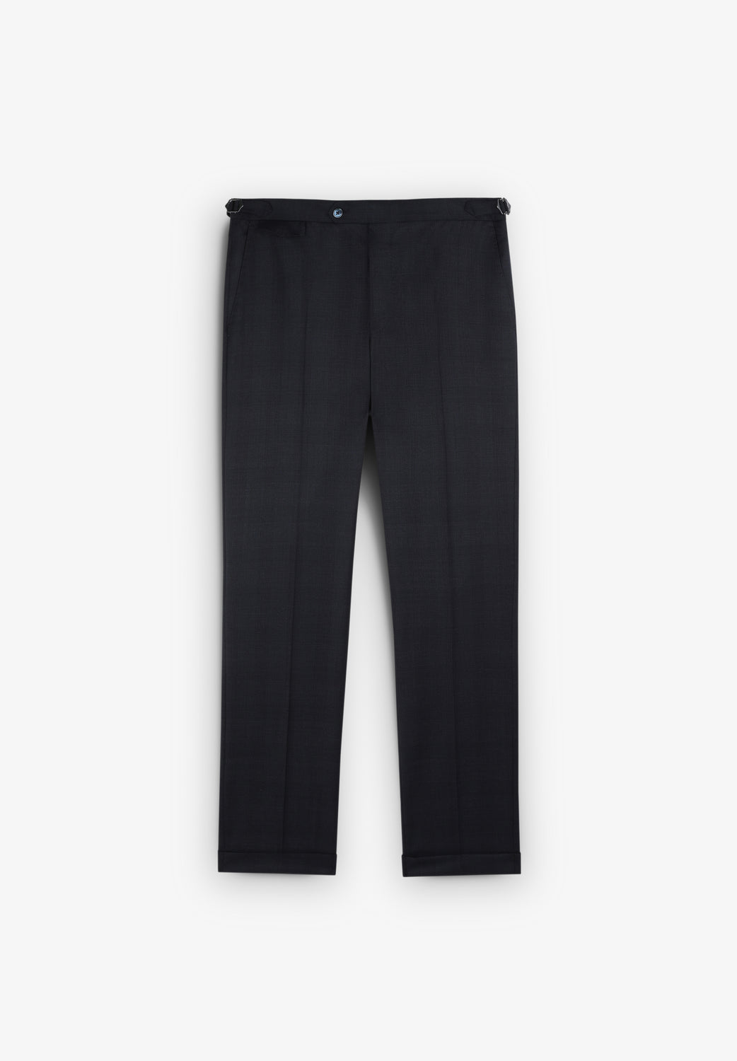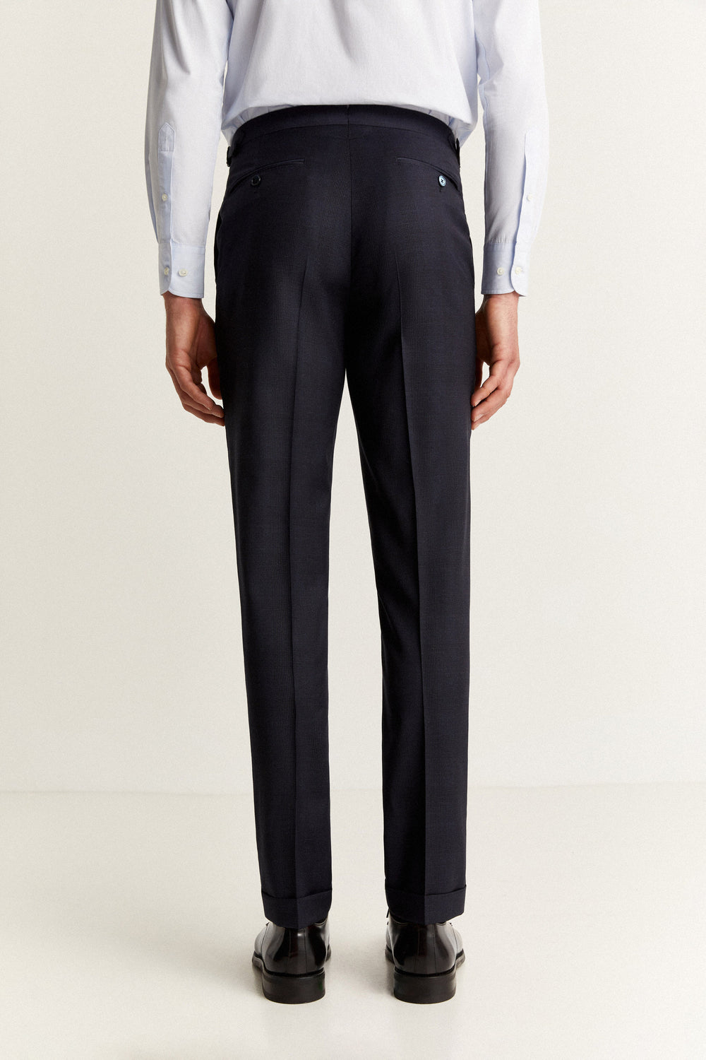 - Pantalón con cierre prologado con corchete y botones. Ceñidores laterales. Botón interior para tirantes. Bajo con vuelta. Bolsillos laterales y traseros de vivo con botón