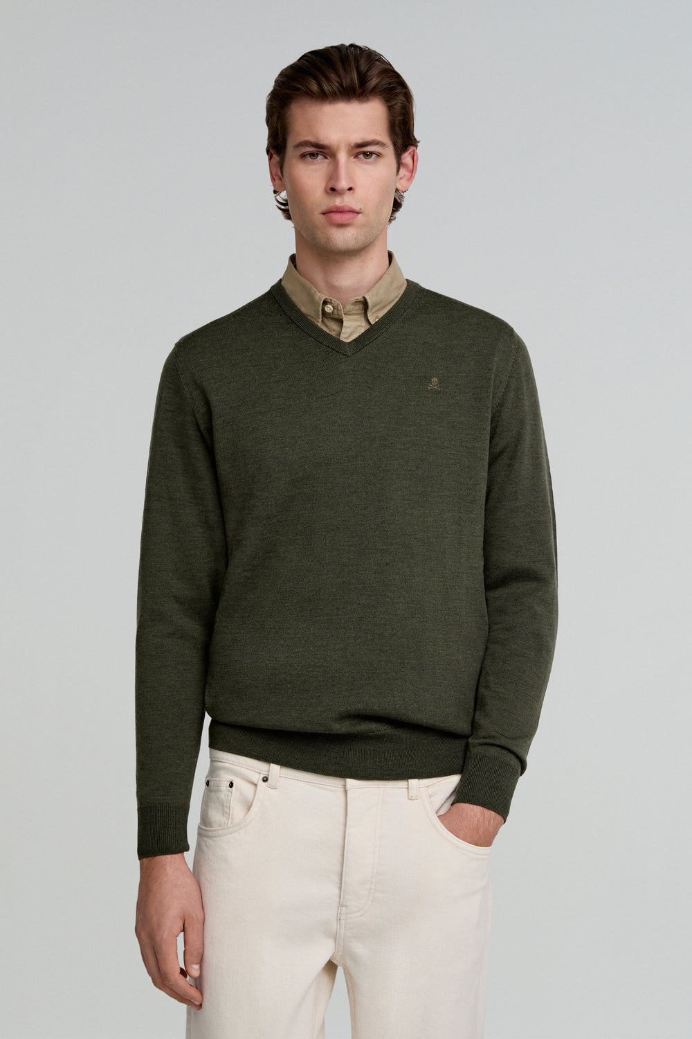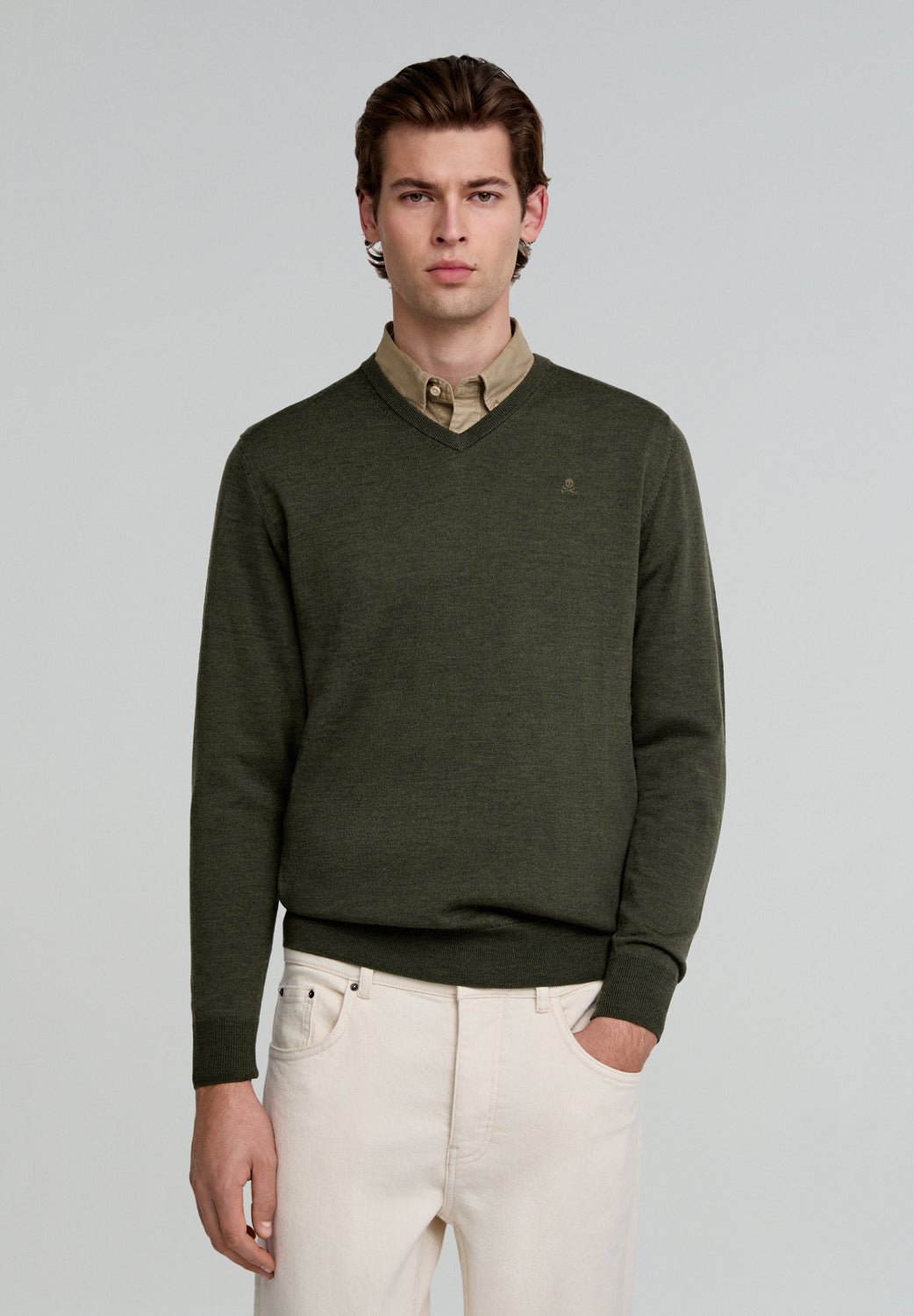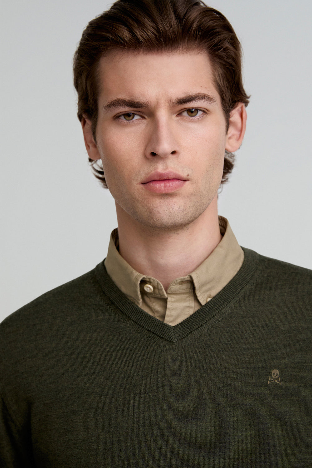 Jersey confeccionado en 100% lana merino. Regular fit, cuello de pico y manga larga. Calavera bordada a tono.