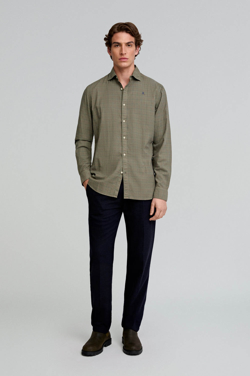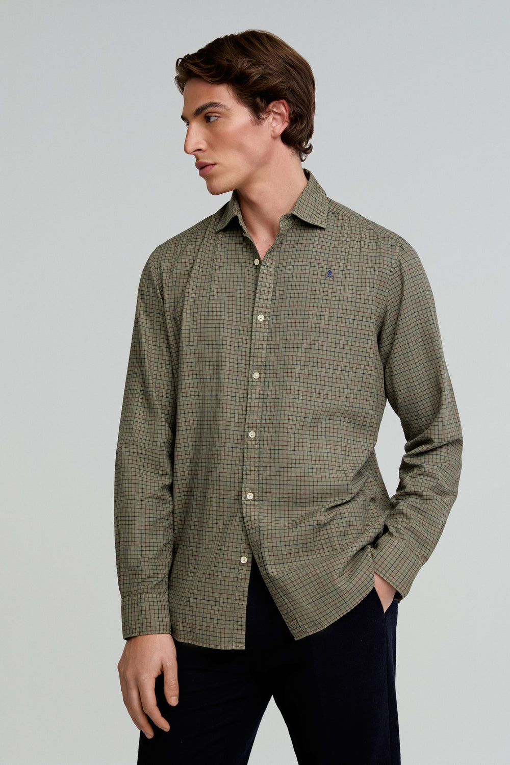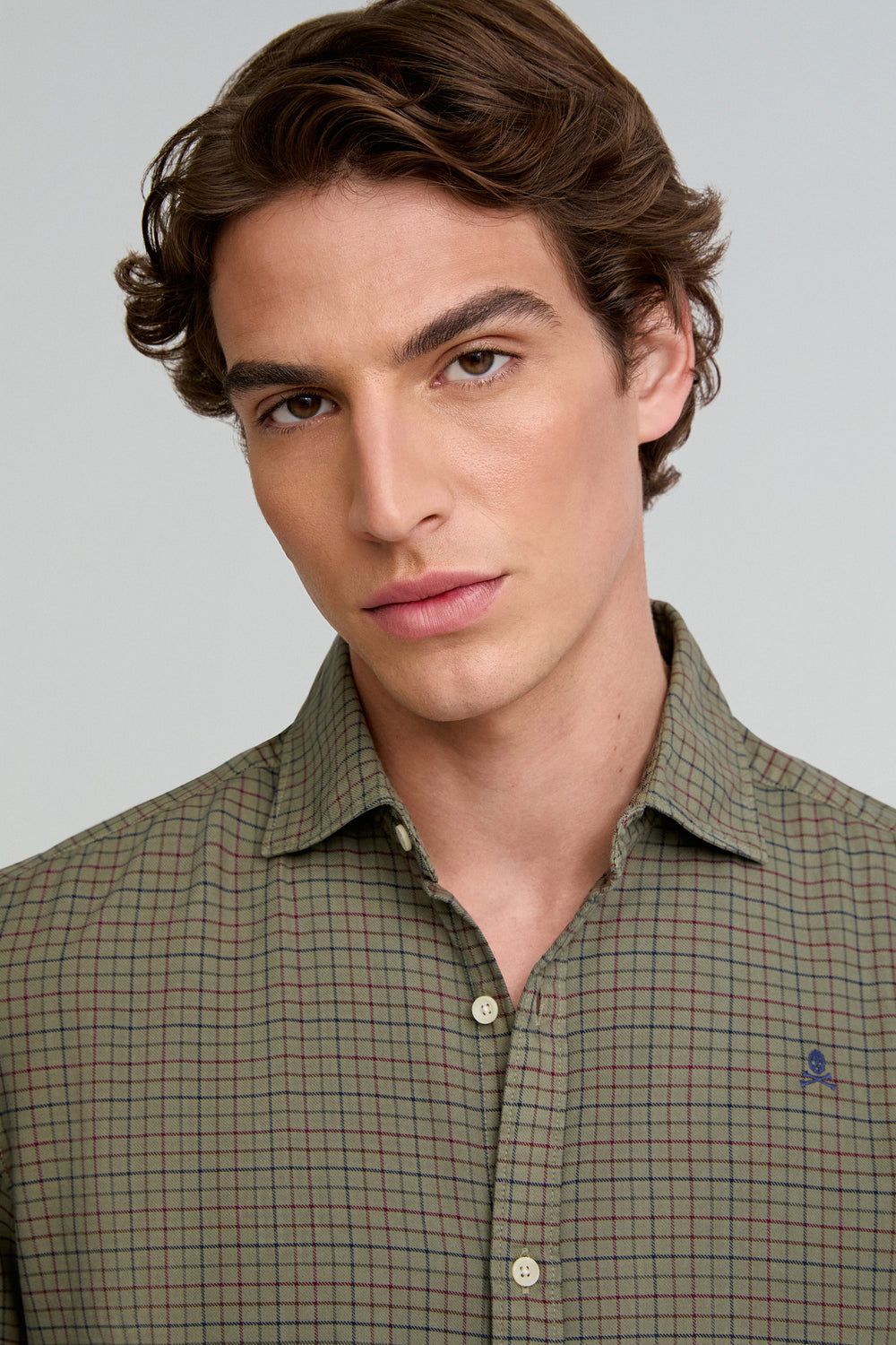 Camisa de cuadros confeccionada en 100% algodón BCI. Regular fit, cuello clásico y cierre con botones. Manga larga terminada en puño con botones. Calavera bordada.