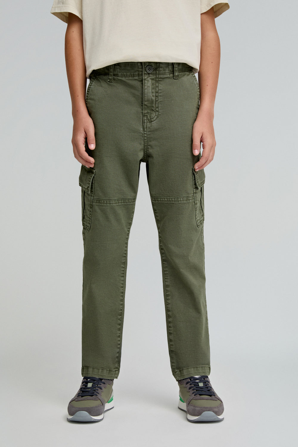Pantalón cargo confeccionado en algodón BCI ligeramente elástico. Regular fit, cierre con botón y cremallera y bolsillos laterales. Trabillas en cintura y bolsillos en pernera con tapeta.