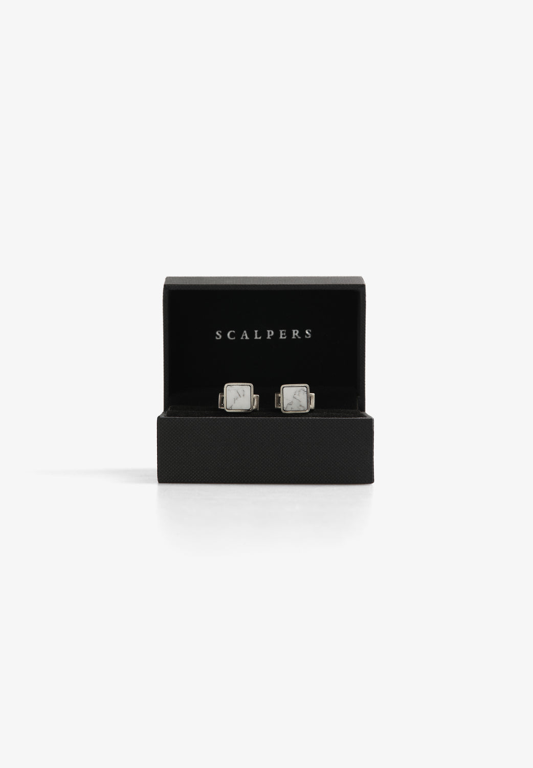 Gemelos cuadrados hechos en latón y piedra. Detalle de logotipo en posterior.