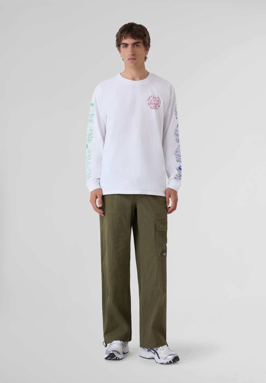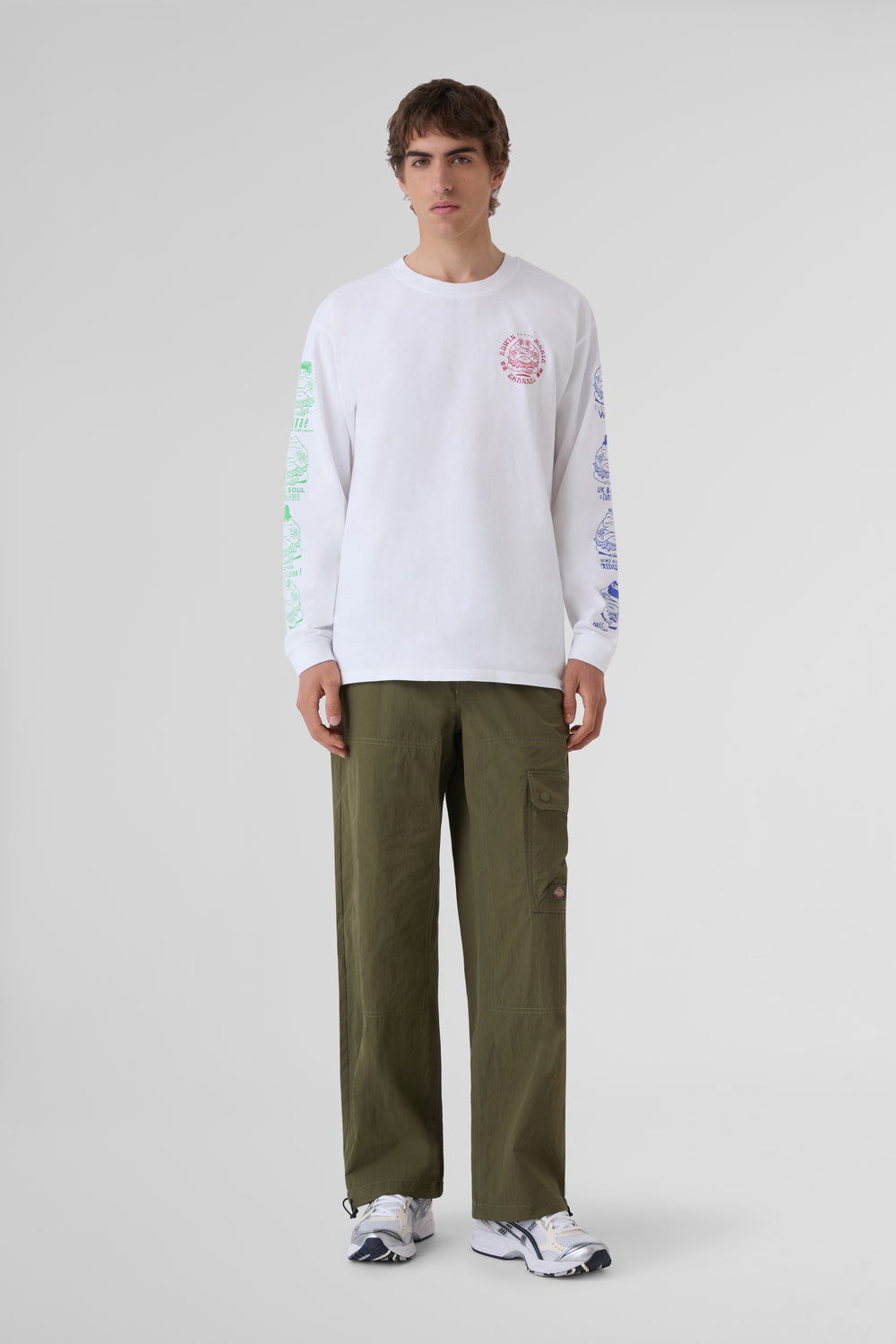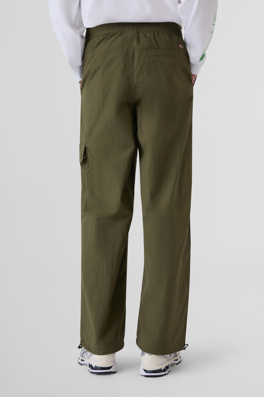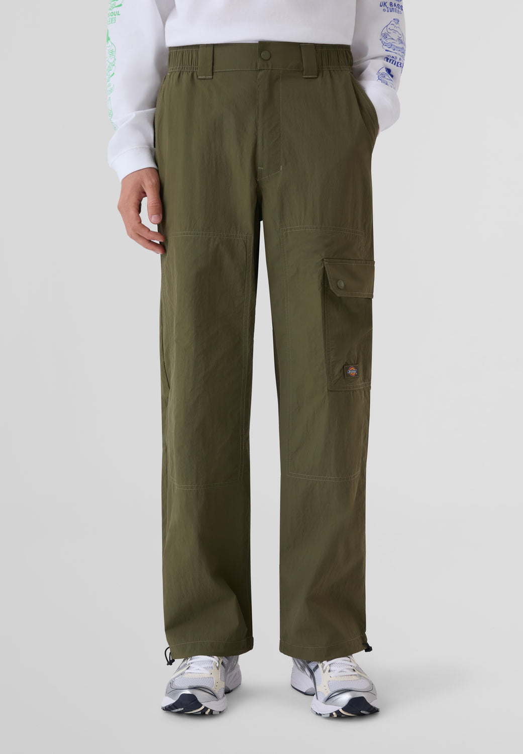 Pantalón Dickies confeccionado en tejido 100% nailon transpirable y repelente al agua con refuerzos dobles en rodillas, cinturilla elástica y bajos ajustables con topes.