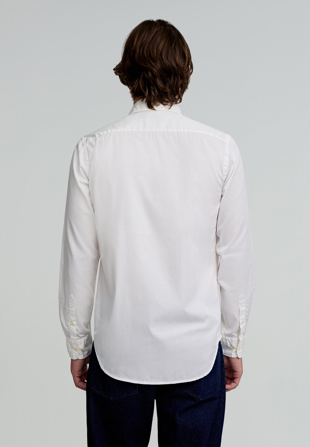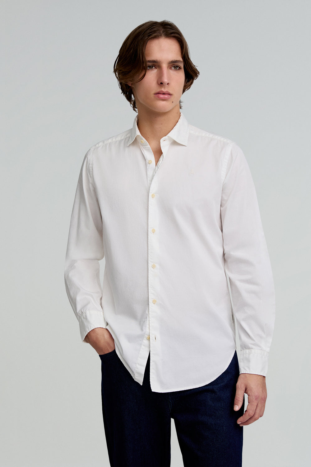 Camisa confeccionada en 100% algodón. Regular fit, cuello cutaway y cierre con botones. Manga larga terminada en puño con botón y calavera bordada a tono.