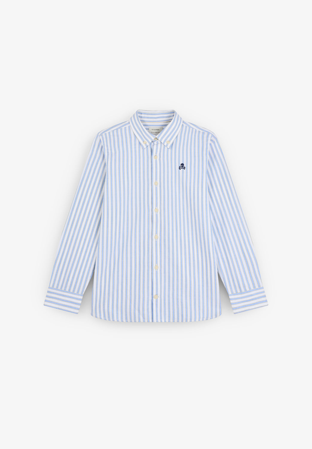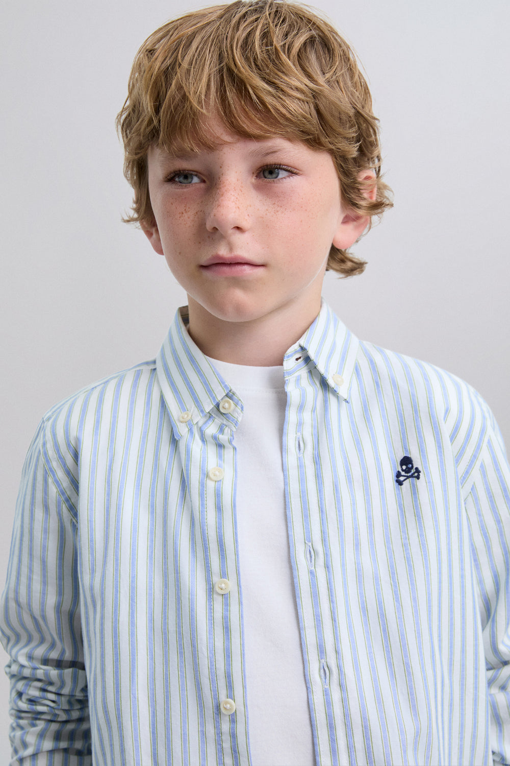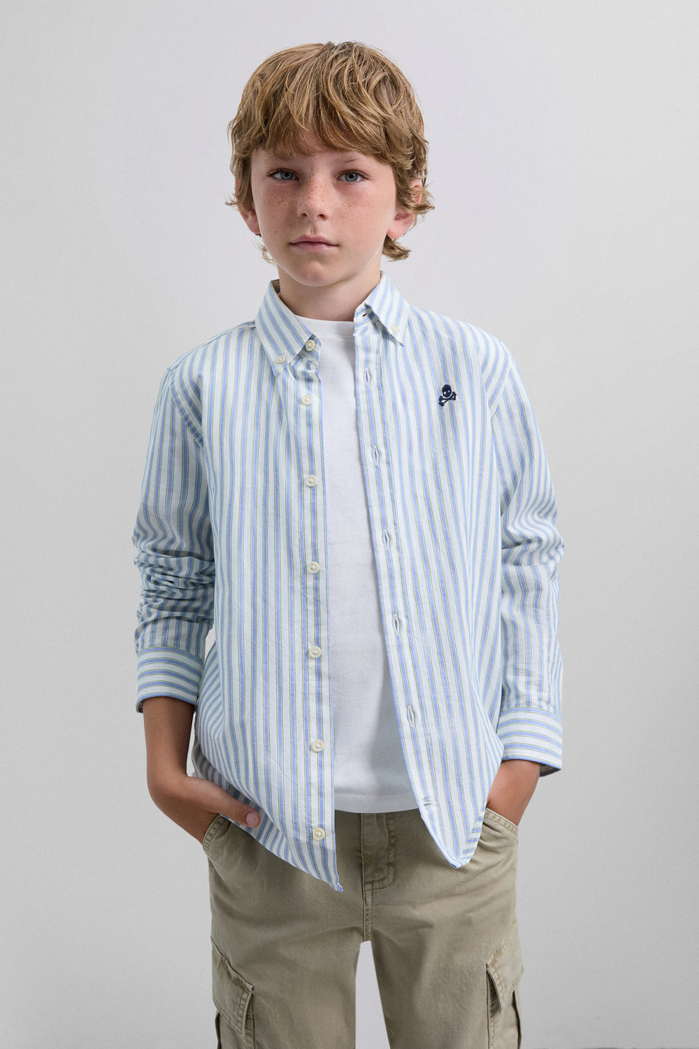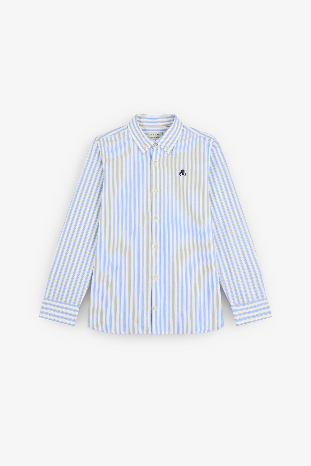 Camisa Oxford confeccionada en 100% algodón BCI. Regular fit. Estampado de rayas. Detalle calavera bordada a contraste en pecho.