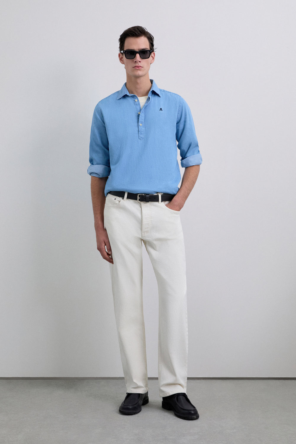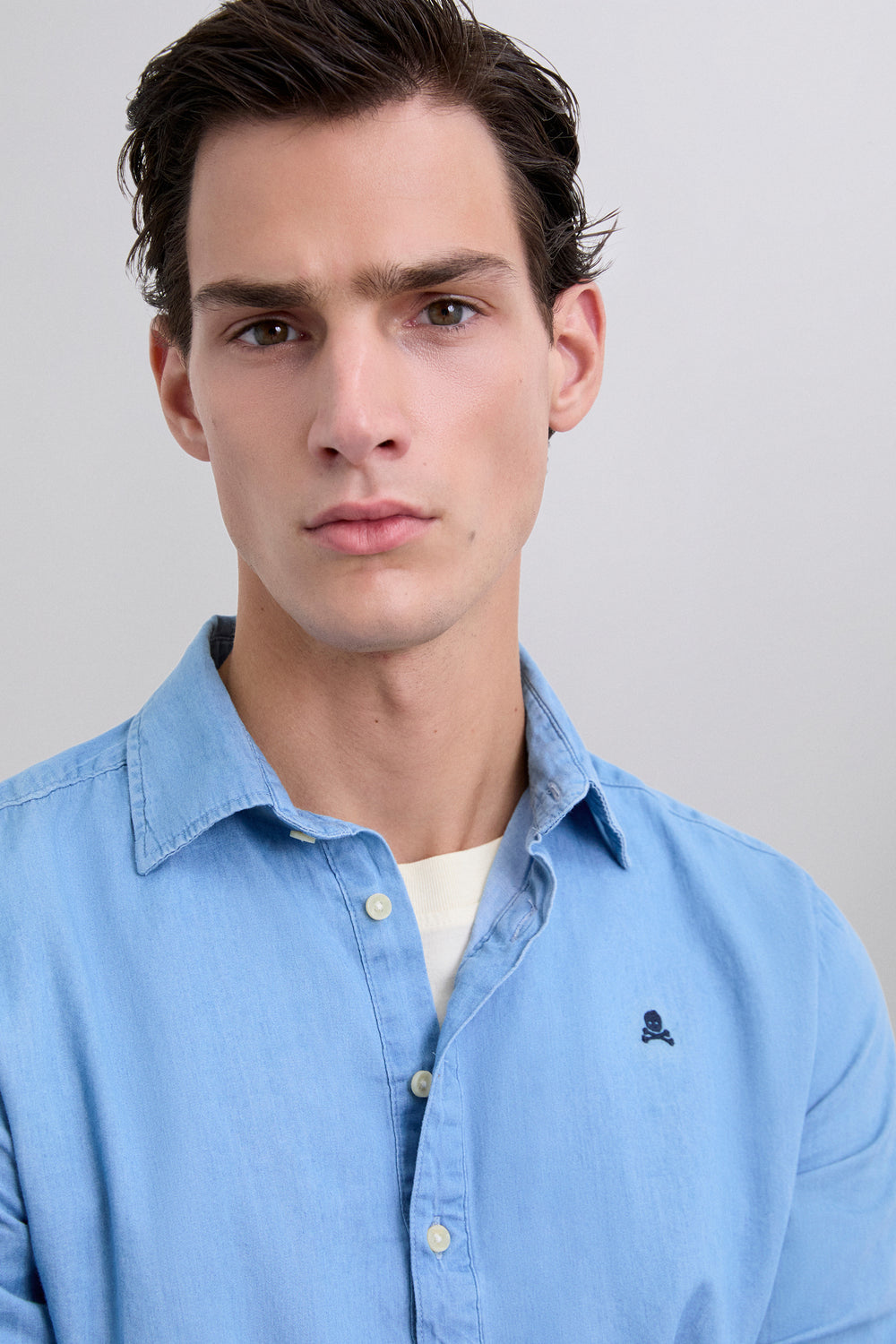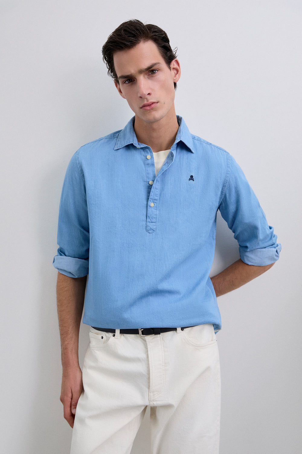 Camisa estilo polera. Confeccionada en tejido 100% algodón BCI. Corte Regular Fit, cuello siena y cierre con botones. Manga larga terminada en puño simple. Presenta como detalle la calavera a contraste.