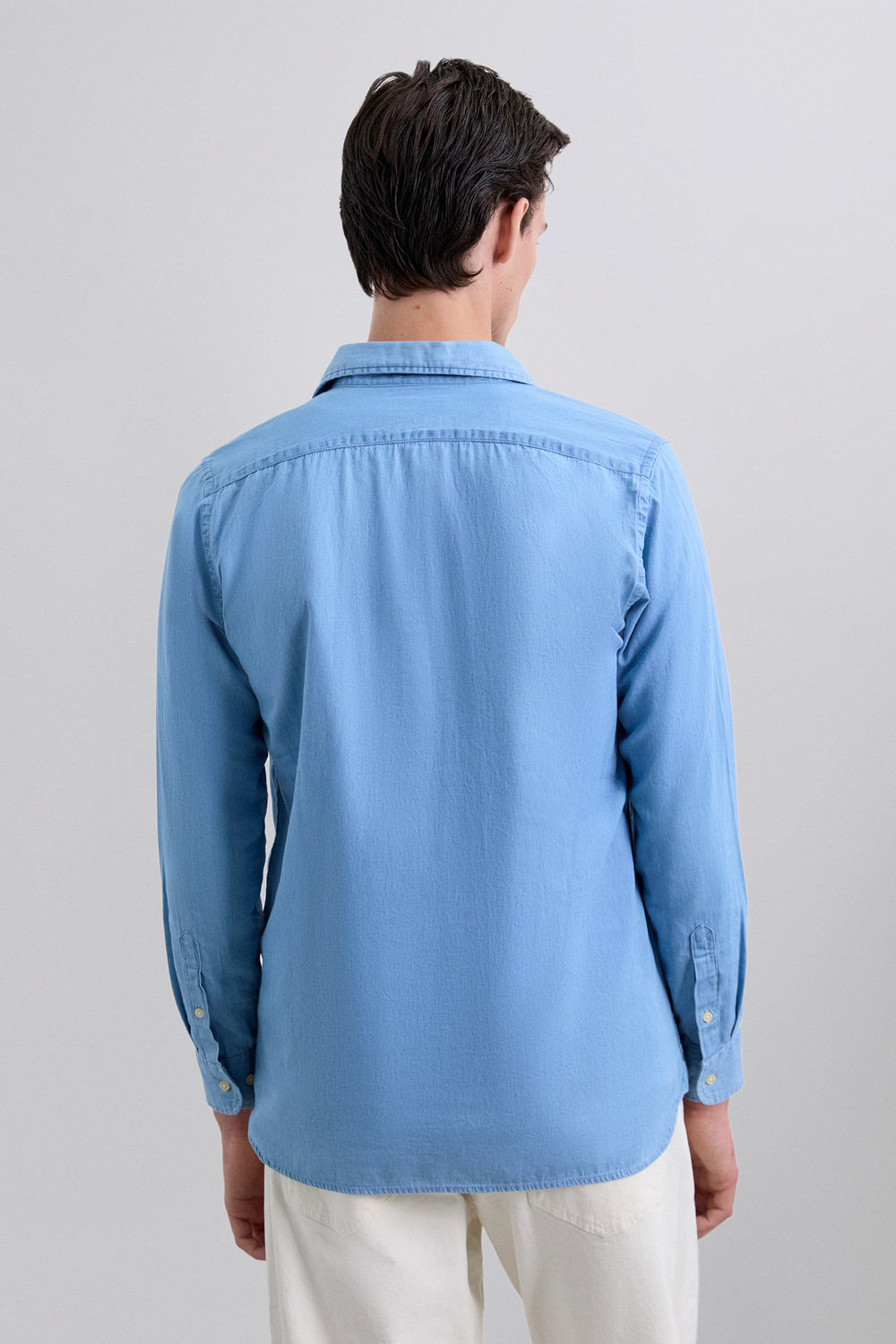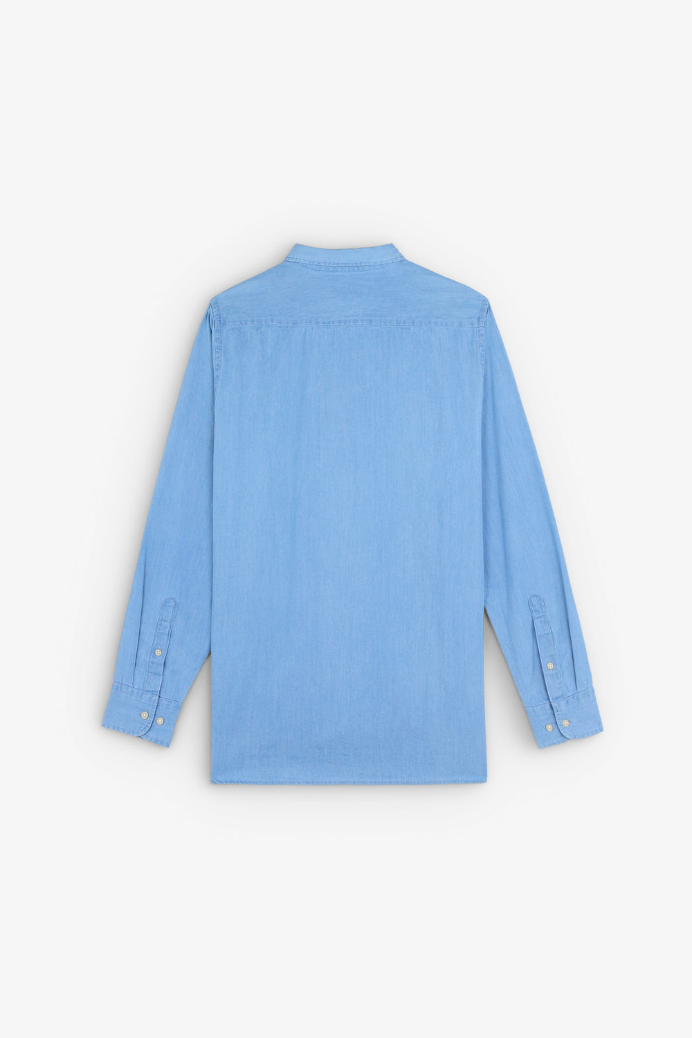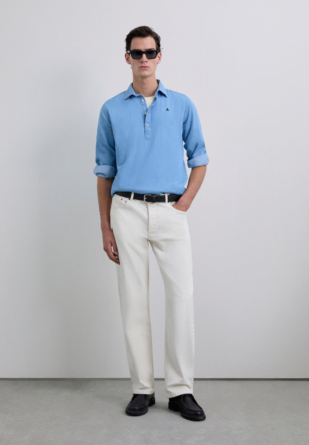 Camisa estilo polera. Confeccionada en tejido 100% algodón BCI. Corte Regular Fit, cuello siena y cierre con botones. Manga larga terminada en puño simple. Presenta como detalle la calavera a contraste.