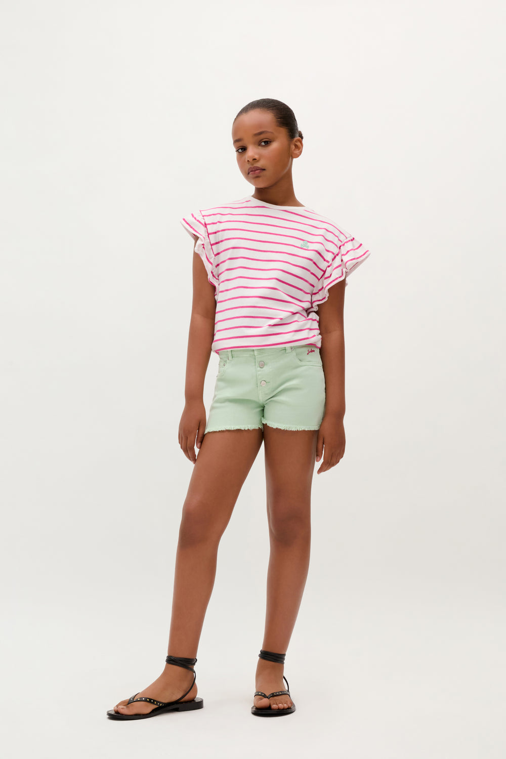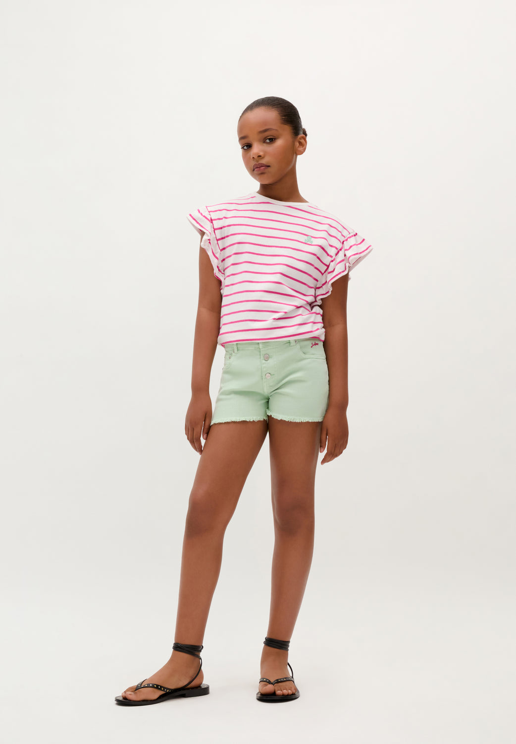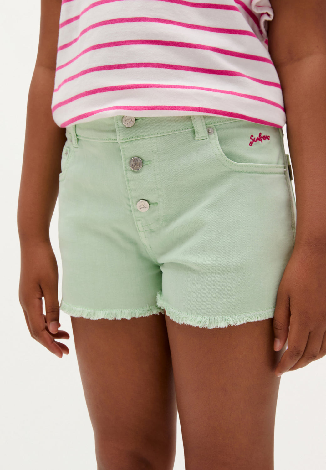 Bermuda confeccionada en algodón BCI con cierre botones de tipo presión frontal. Bolsillos delanteros y de tipo plastrón en espalda con detalle sol bordado. Bajo acabado desflecado. Detalle de logo en bolsillo delantero y cintura en espalda.