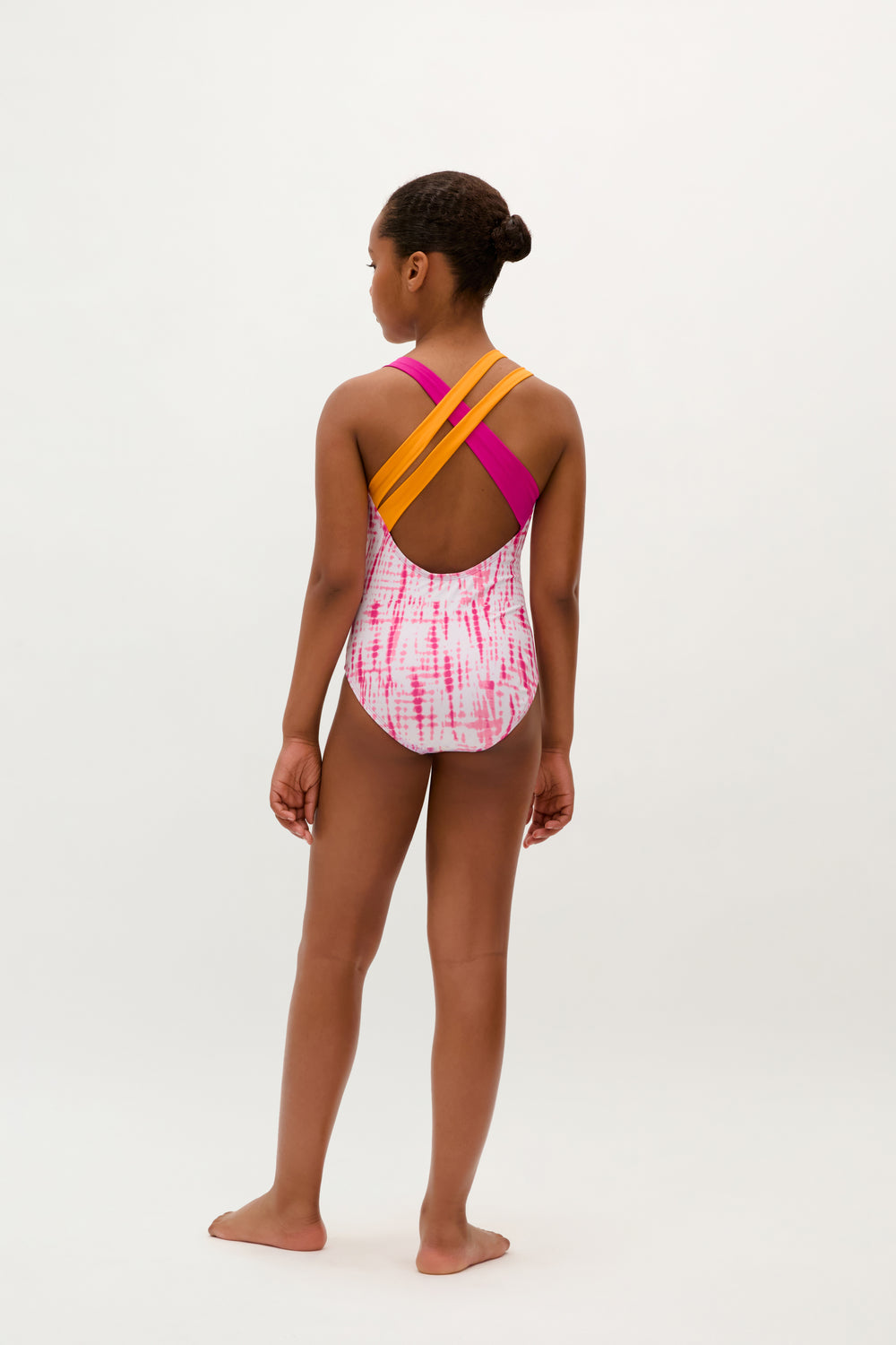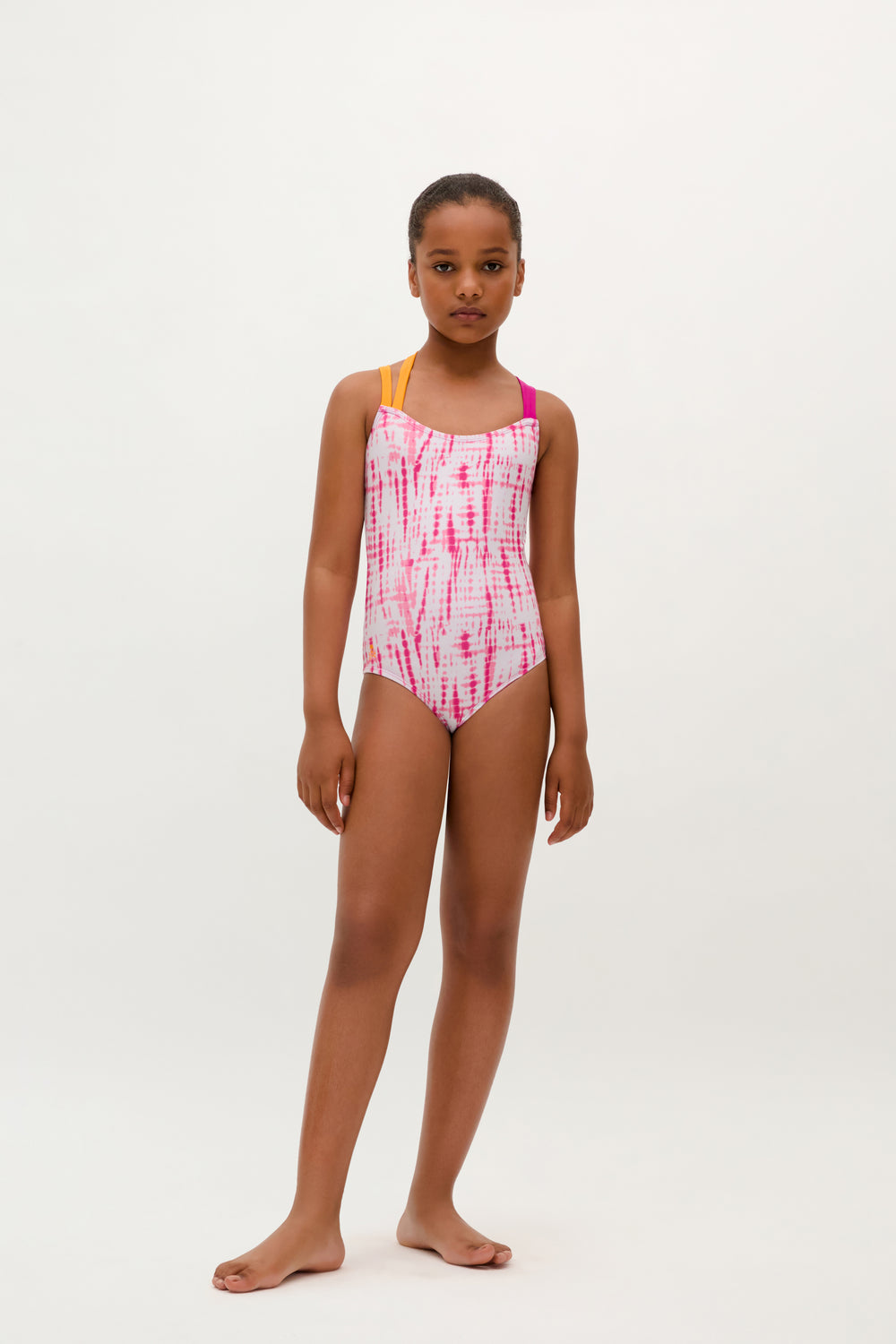 Bañador con cuello redondo y tirantes. Estampado a contraste.