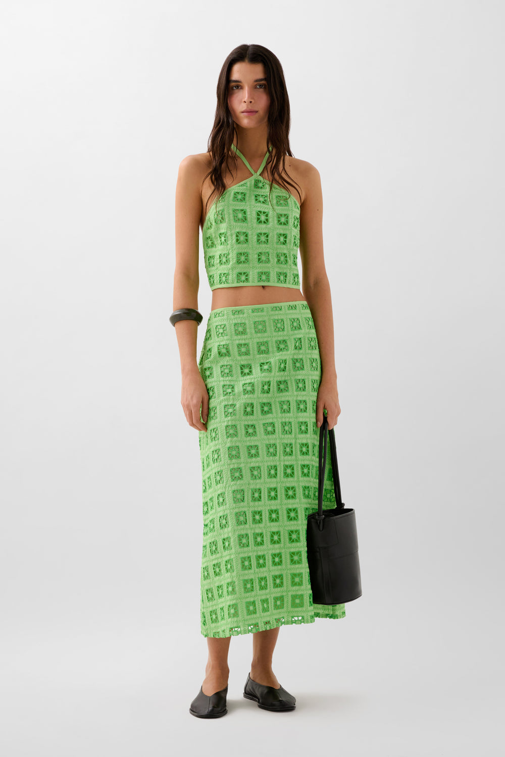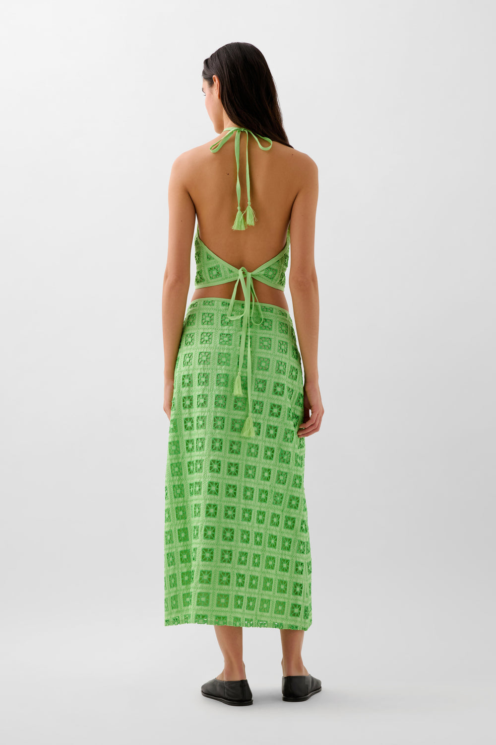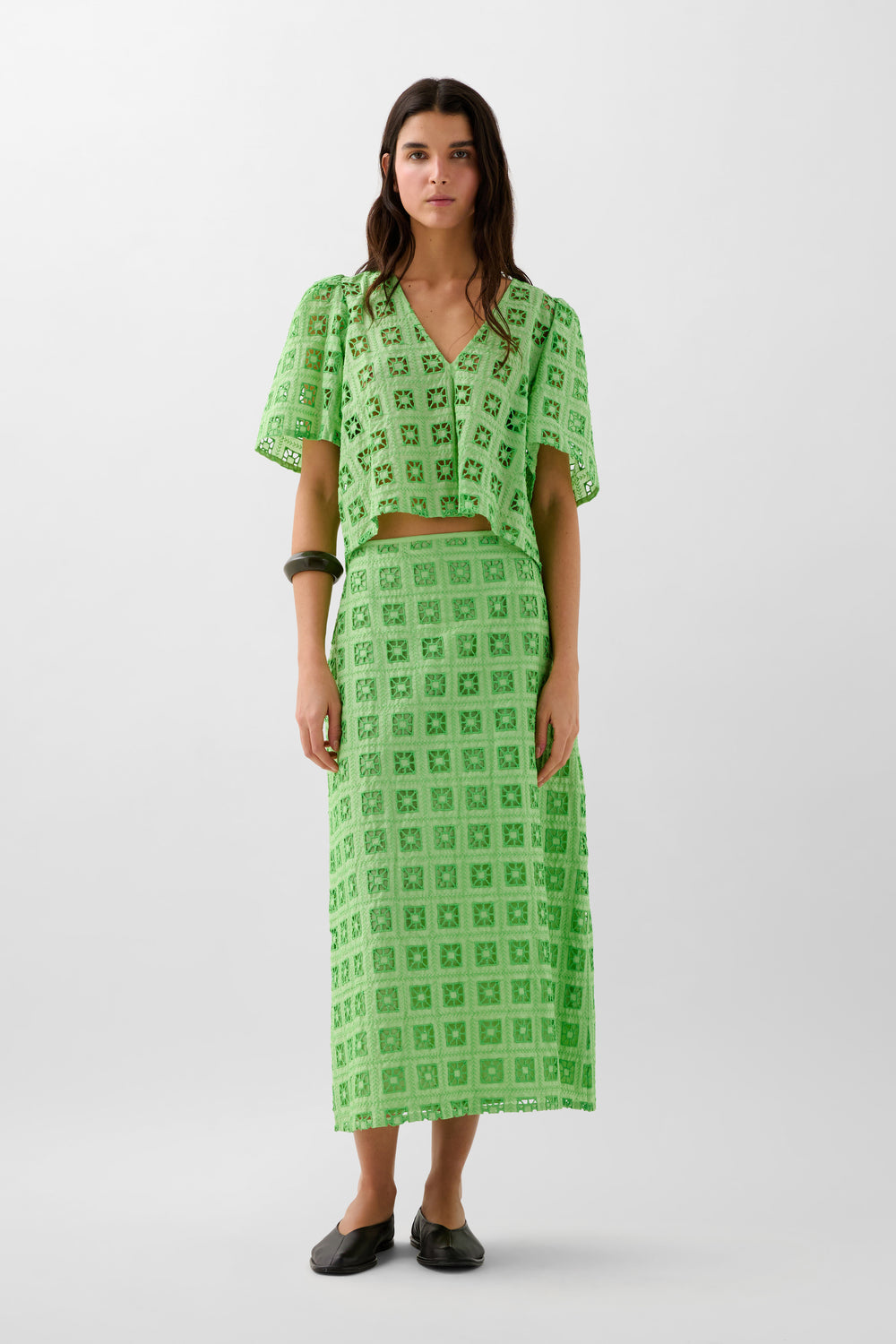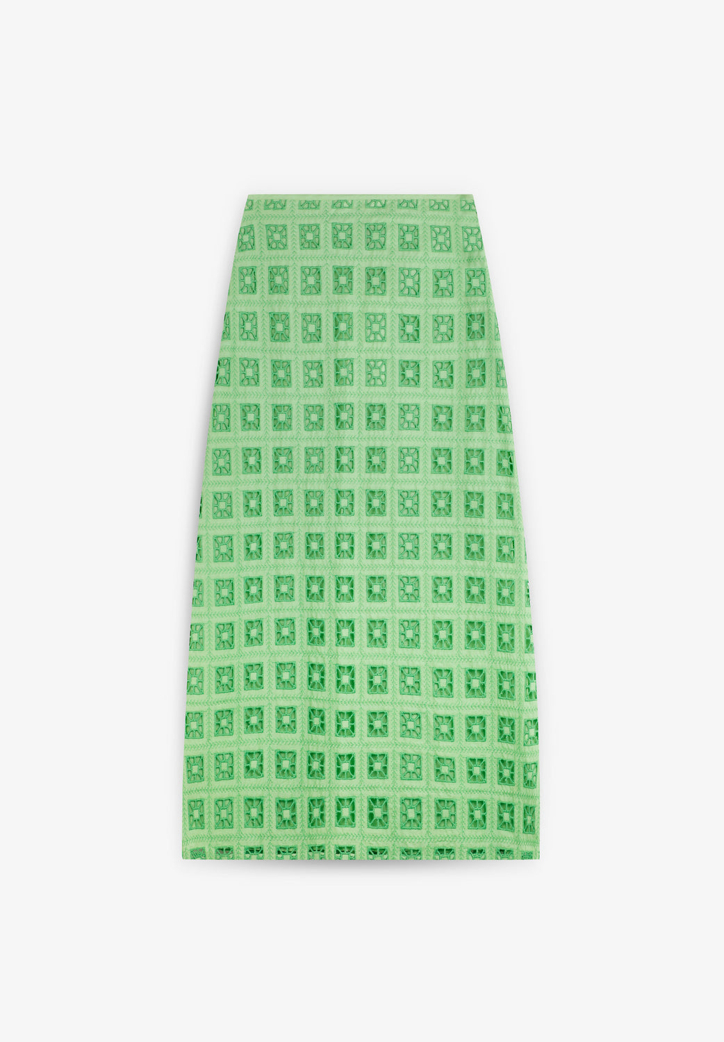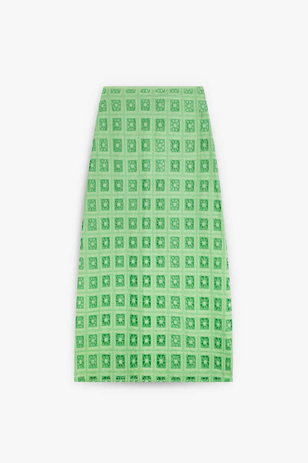 Falda confeccionada en 100% algodón con bordados. Corte midi con cierre de cremallera oculta.