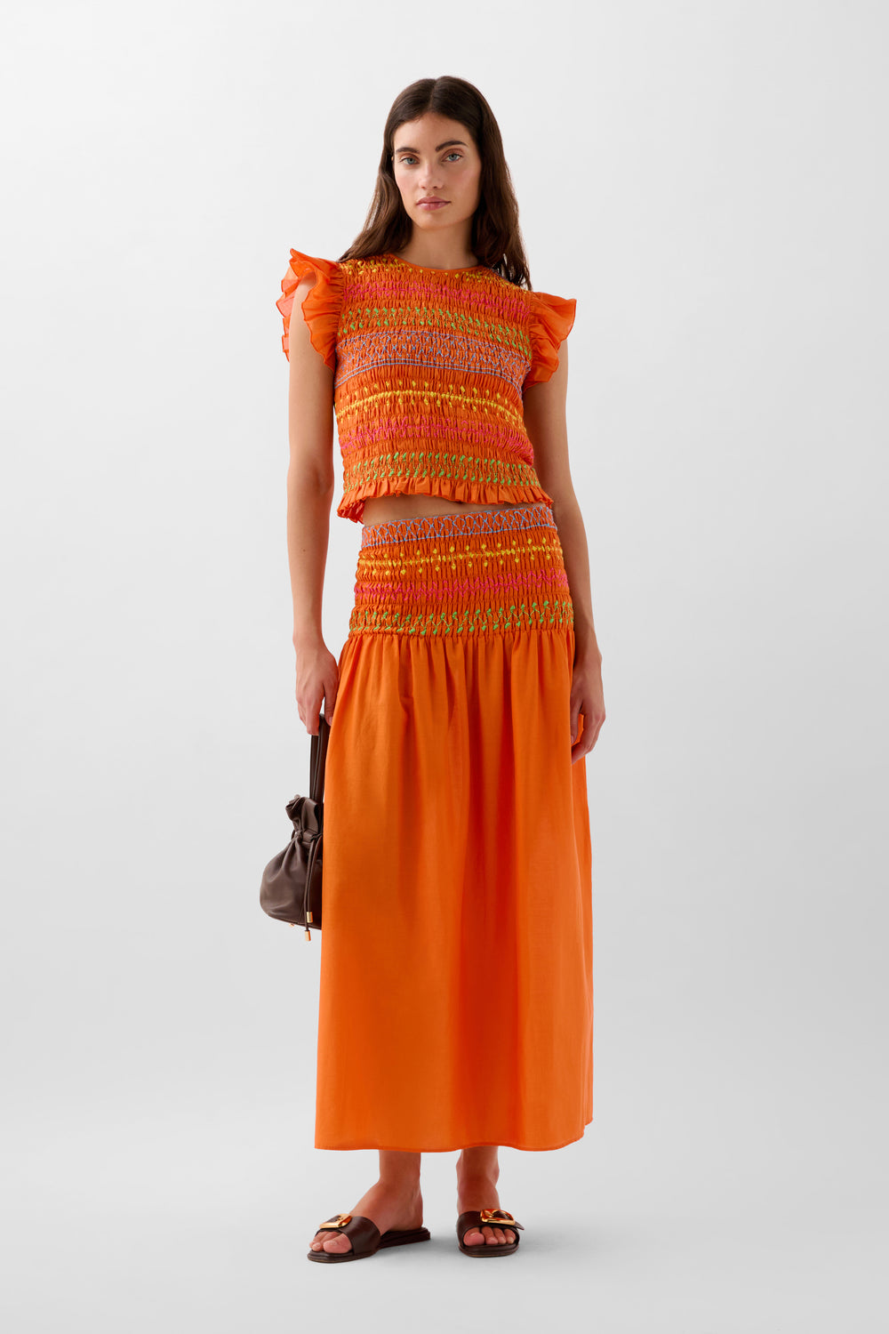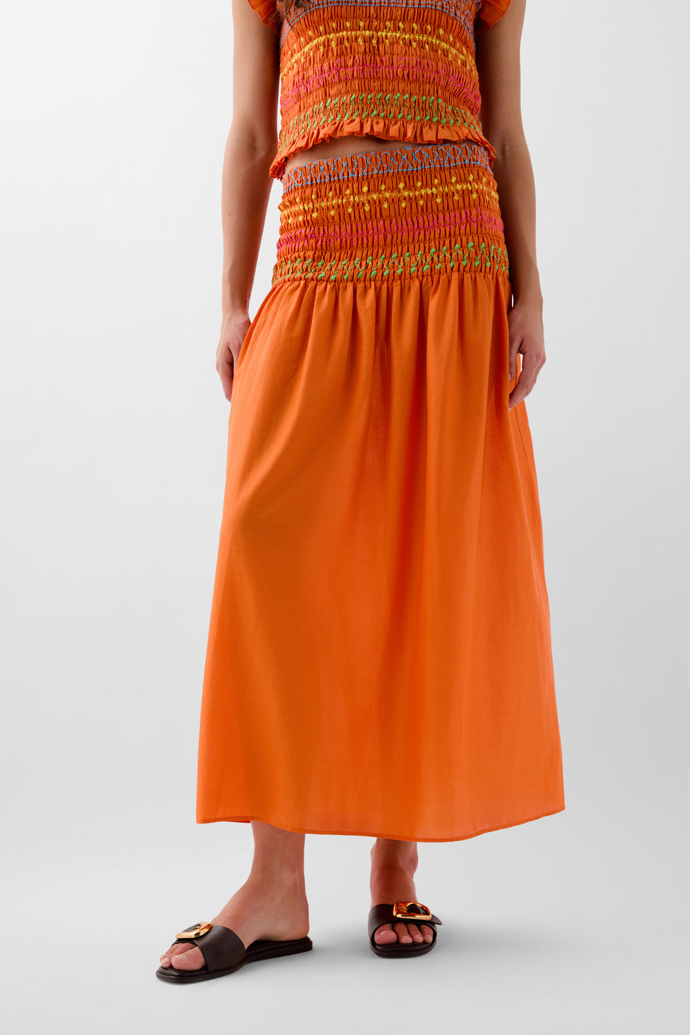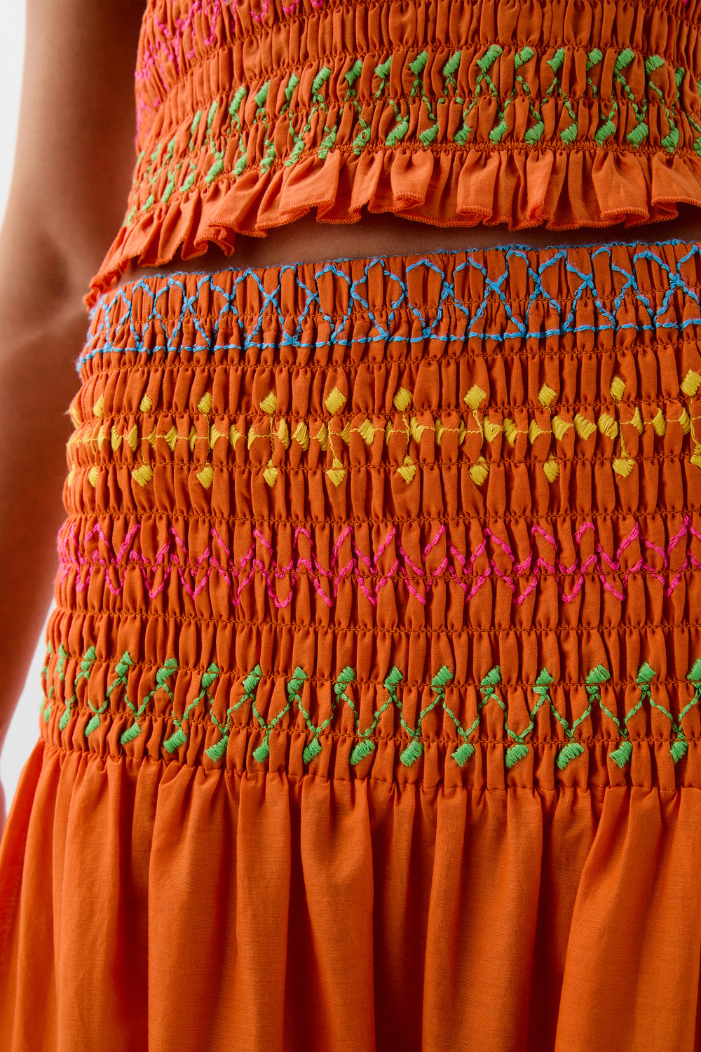 Falda confeccionada en algodón 100% con detalle de nido de abeja multicolor en cintura hasta la cadera. Corte midi con ligero vuelo.