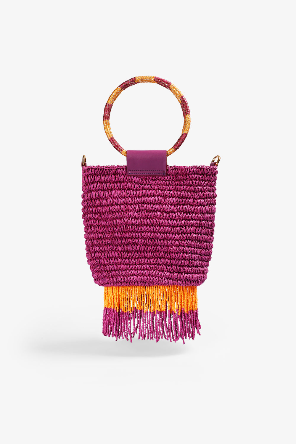 Bolso de mano confeccionado en rafia con detalle de flecos en la parte inferior. Asa corta de mano y opción de asa larga.