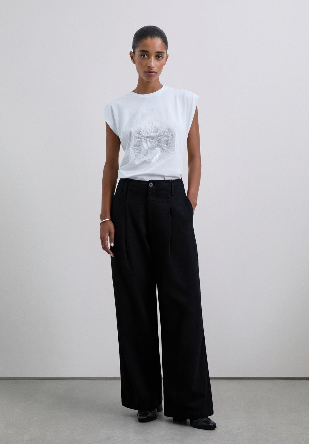 Camiseta confeccionada en 100% algodón. Corte regular fit, cuello redondo y manga en sisa con pliegues.