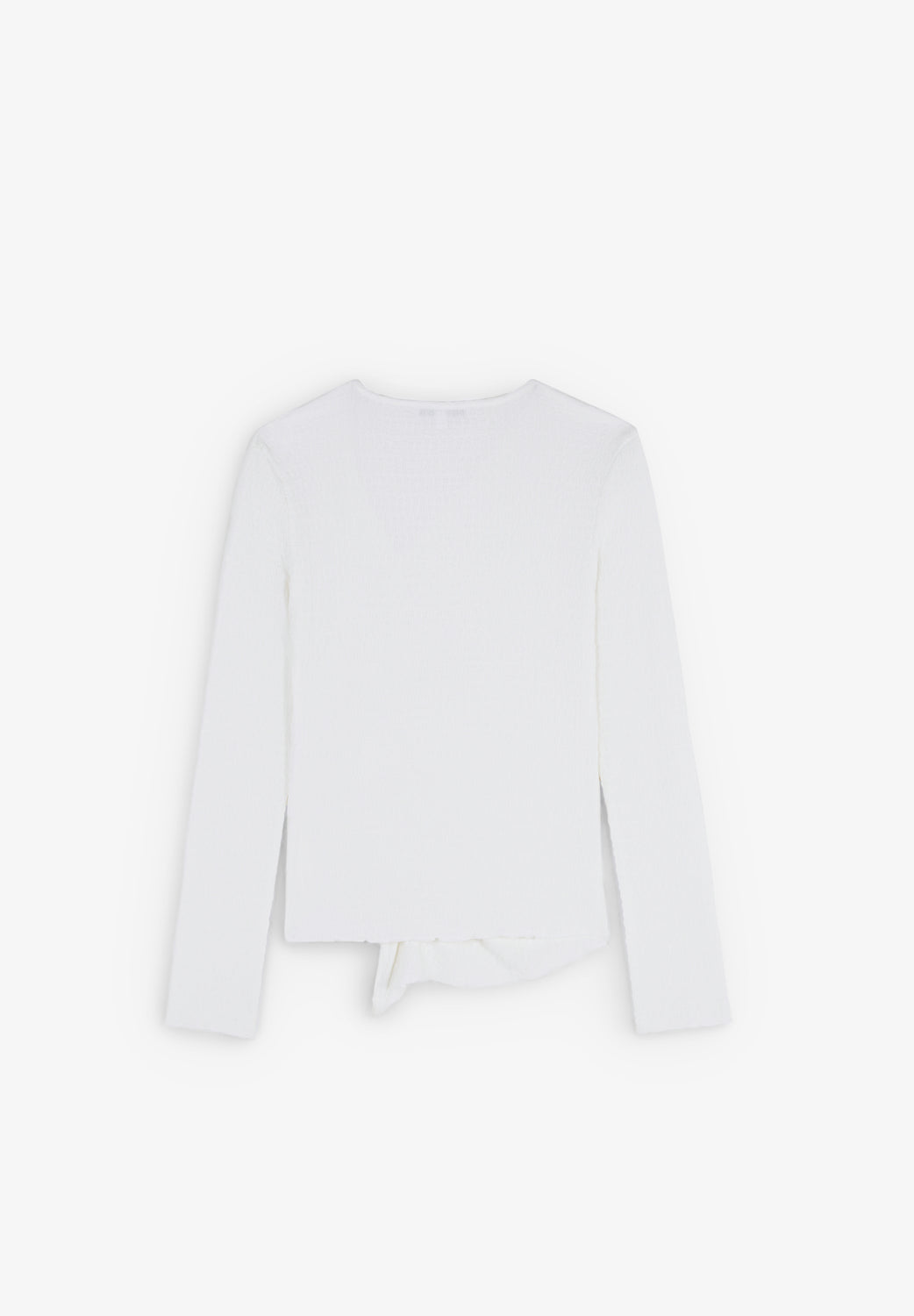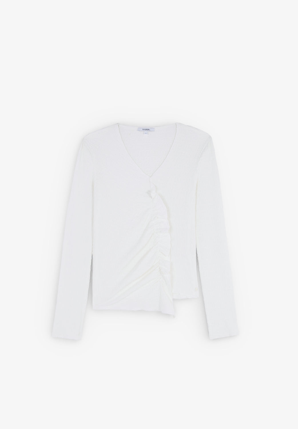 Top acabado textura de escote asimétrico en pico con volantes y manga larga.