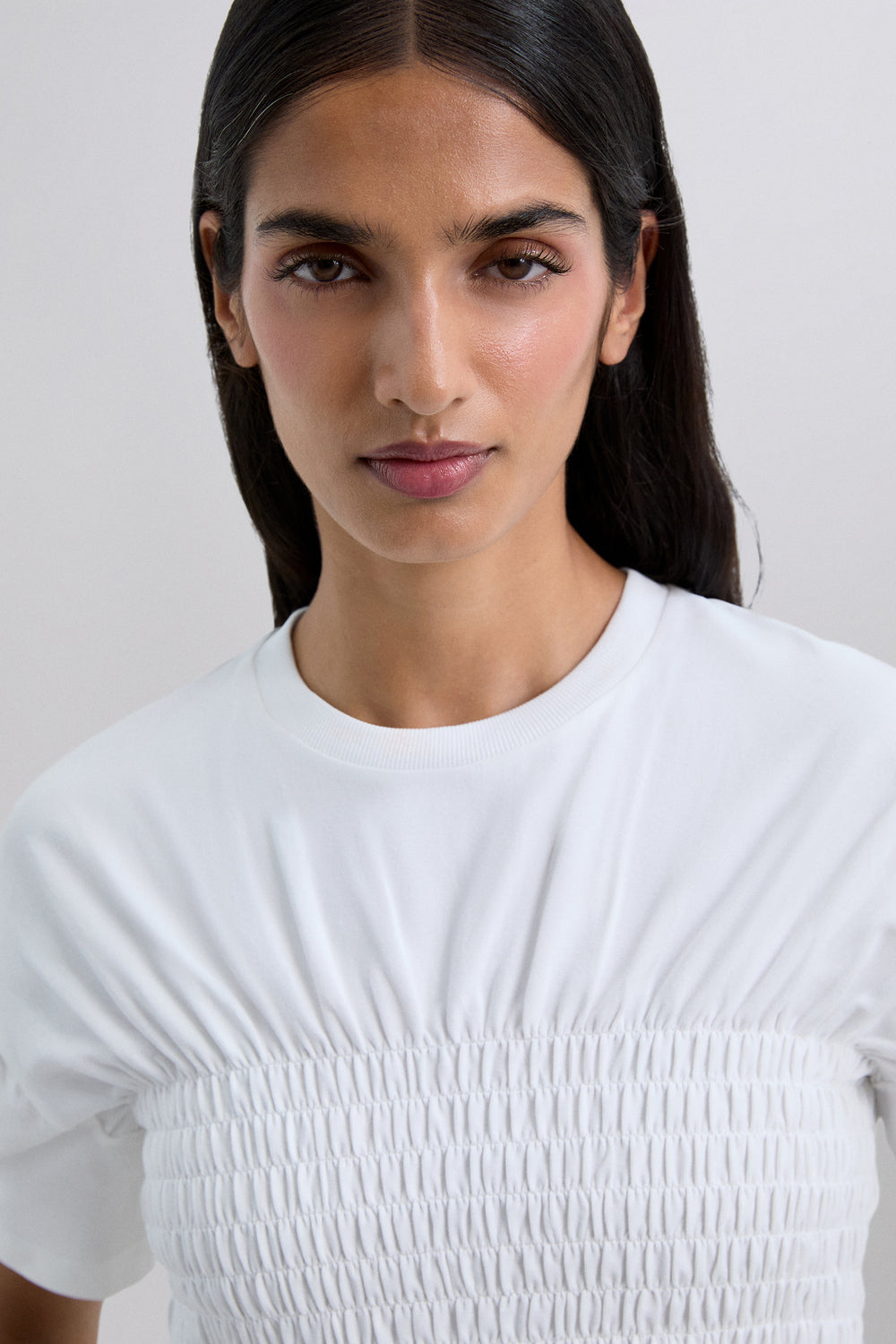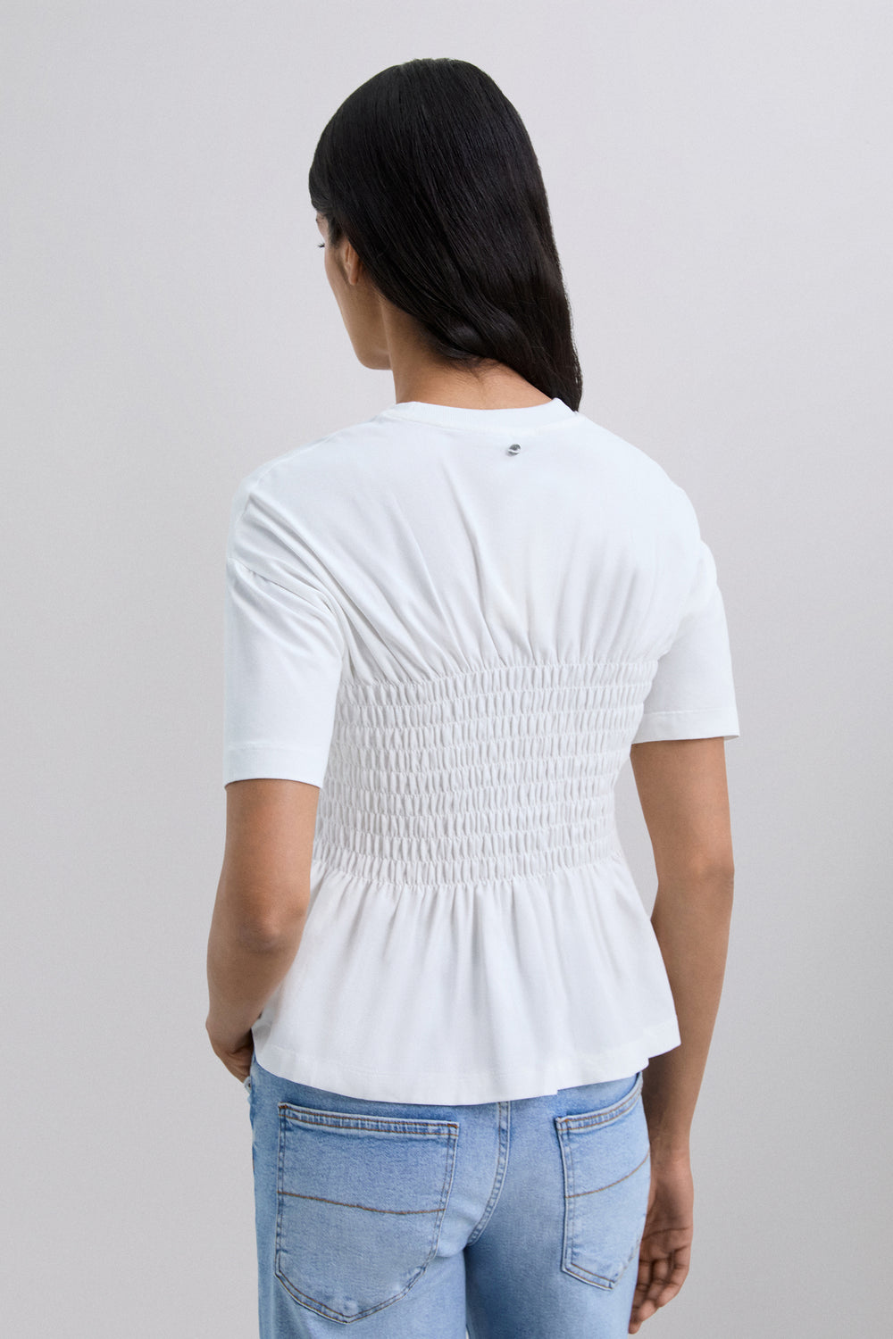 Camiseta de manga corta confeccionada en mezcla de algodón con volantes en las mangas. Cuello redondo. Volantes en la parte inferior. Fruncido en la parte frontal.