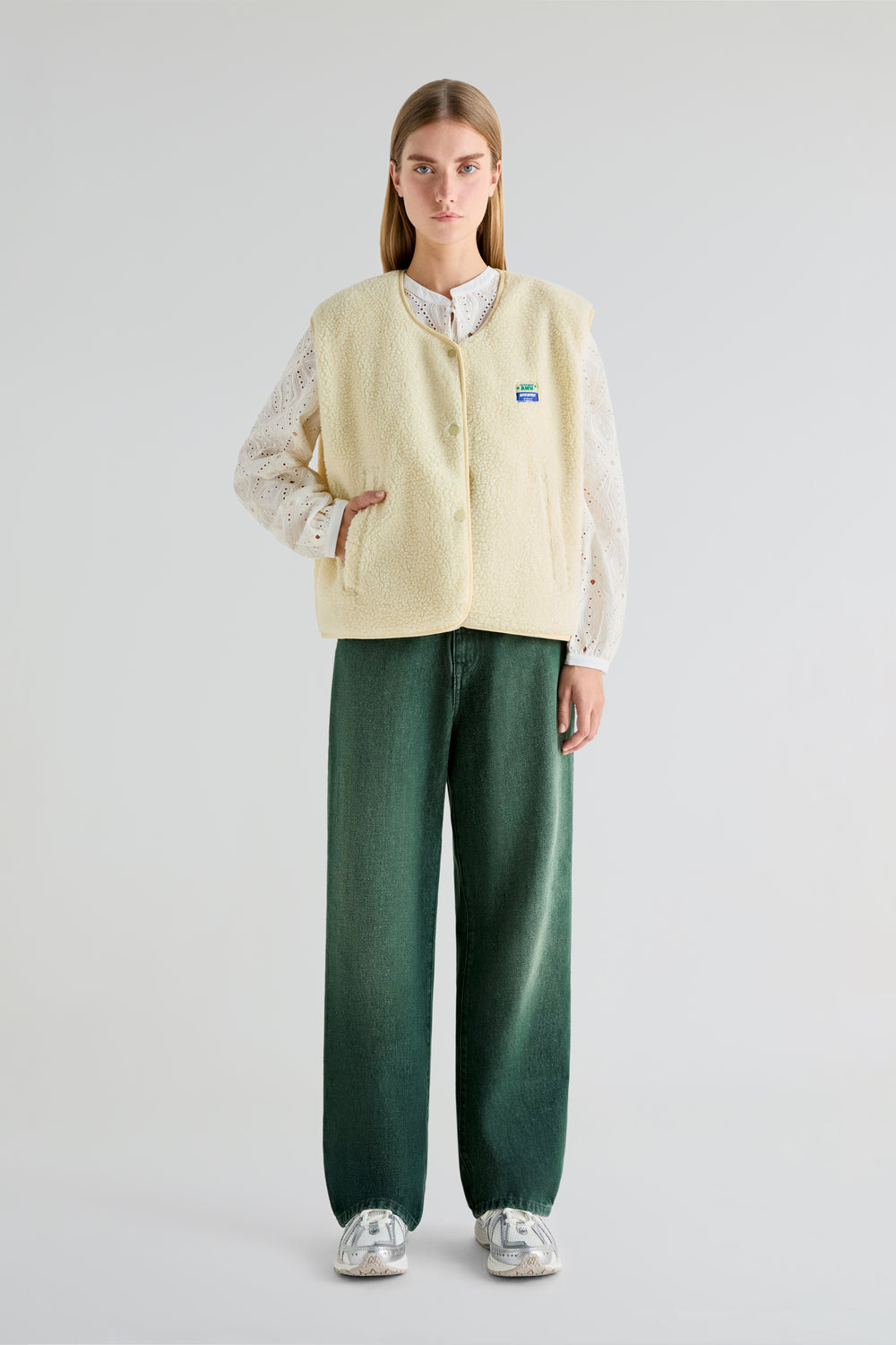 Chaleco American Vintage confeccionado en 100% poliéster reciclado. Presenta cierre de botones, bolsillos laterales y detalle etiqueta bordada.