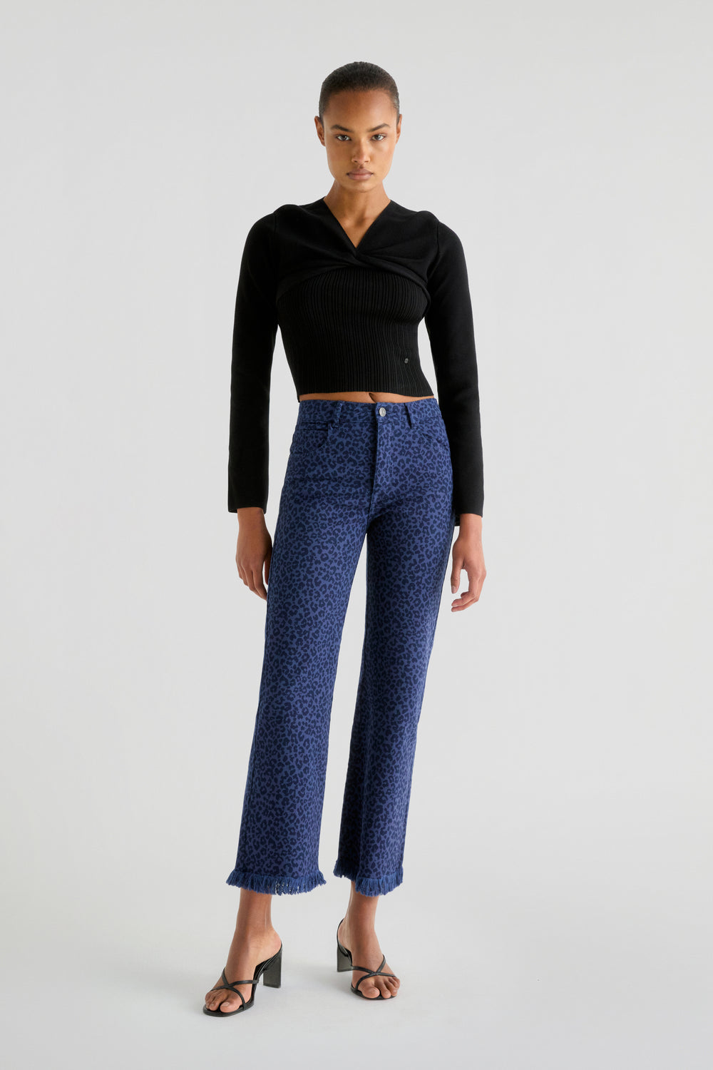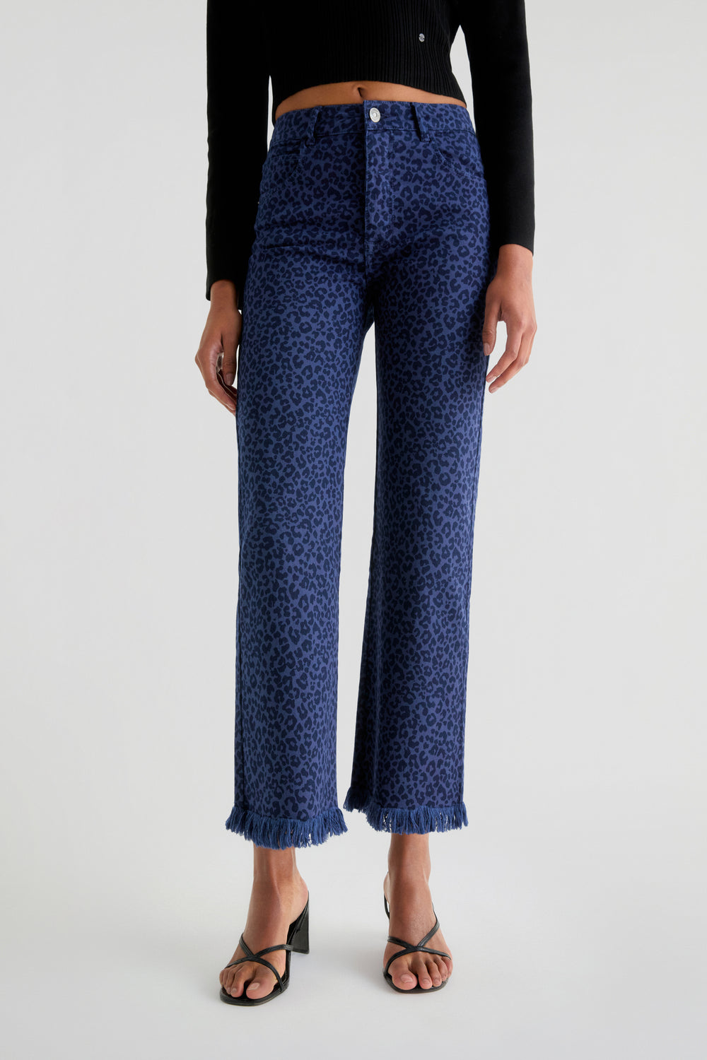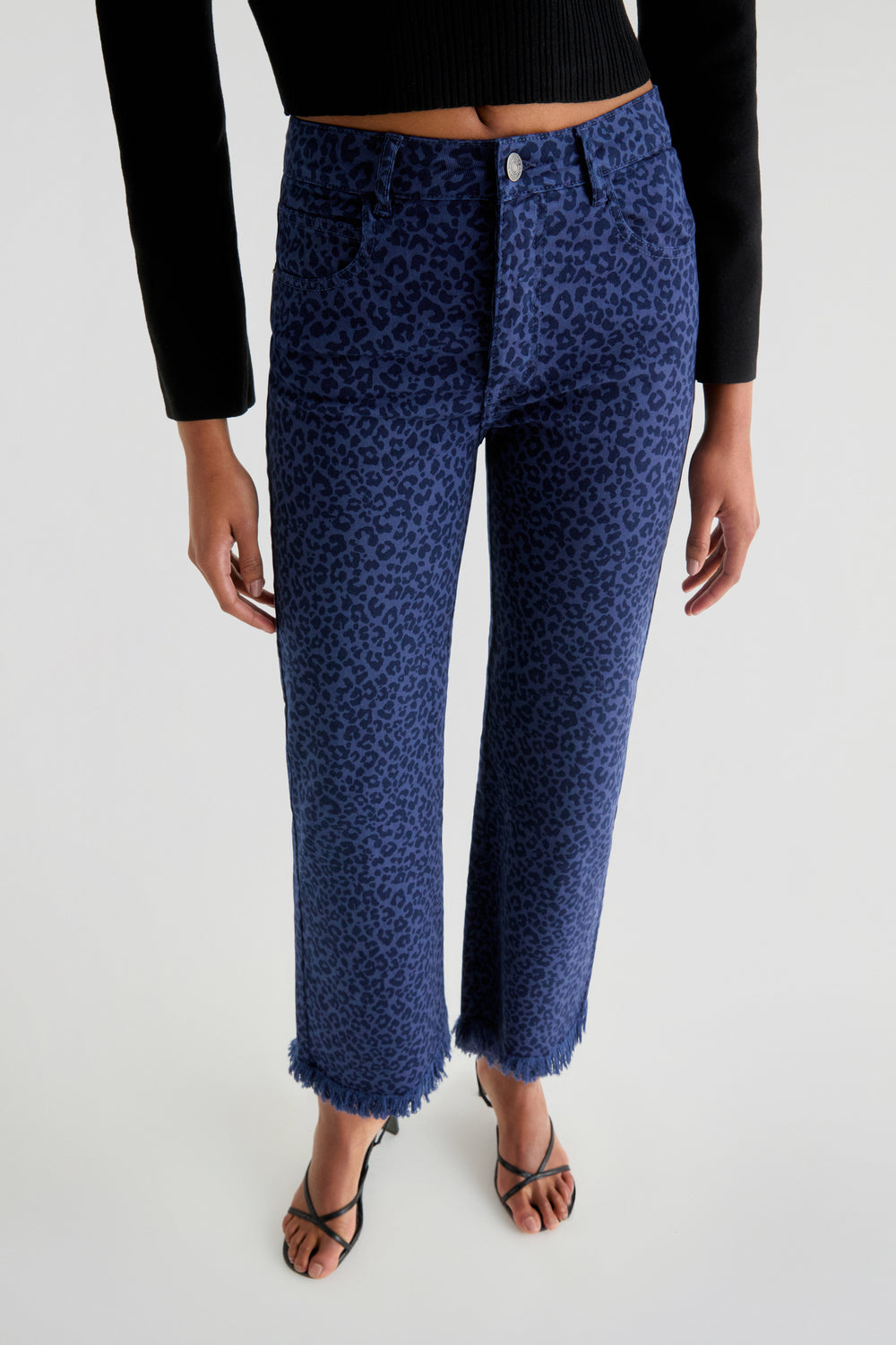 Pantalón con animal print confeccionado en algodón ligeramente elástico. Corte recto regular fit con tiro alto, cierre con botón y cremallera y bolsillos frontales y traseros. Trabillas en cintura y bajo desflecado.