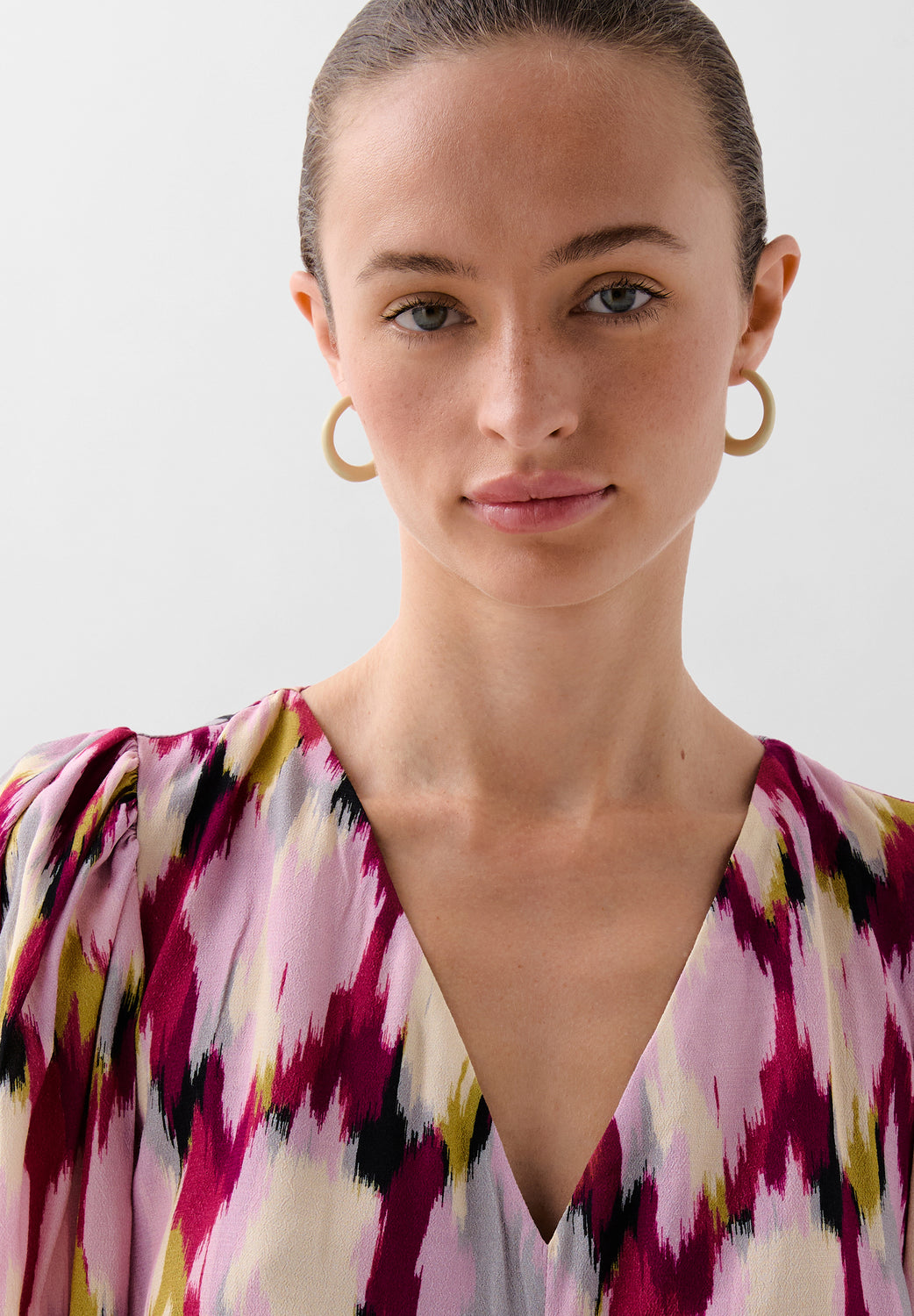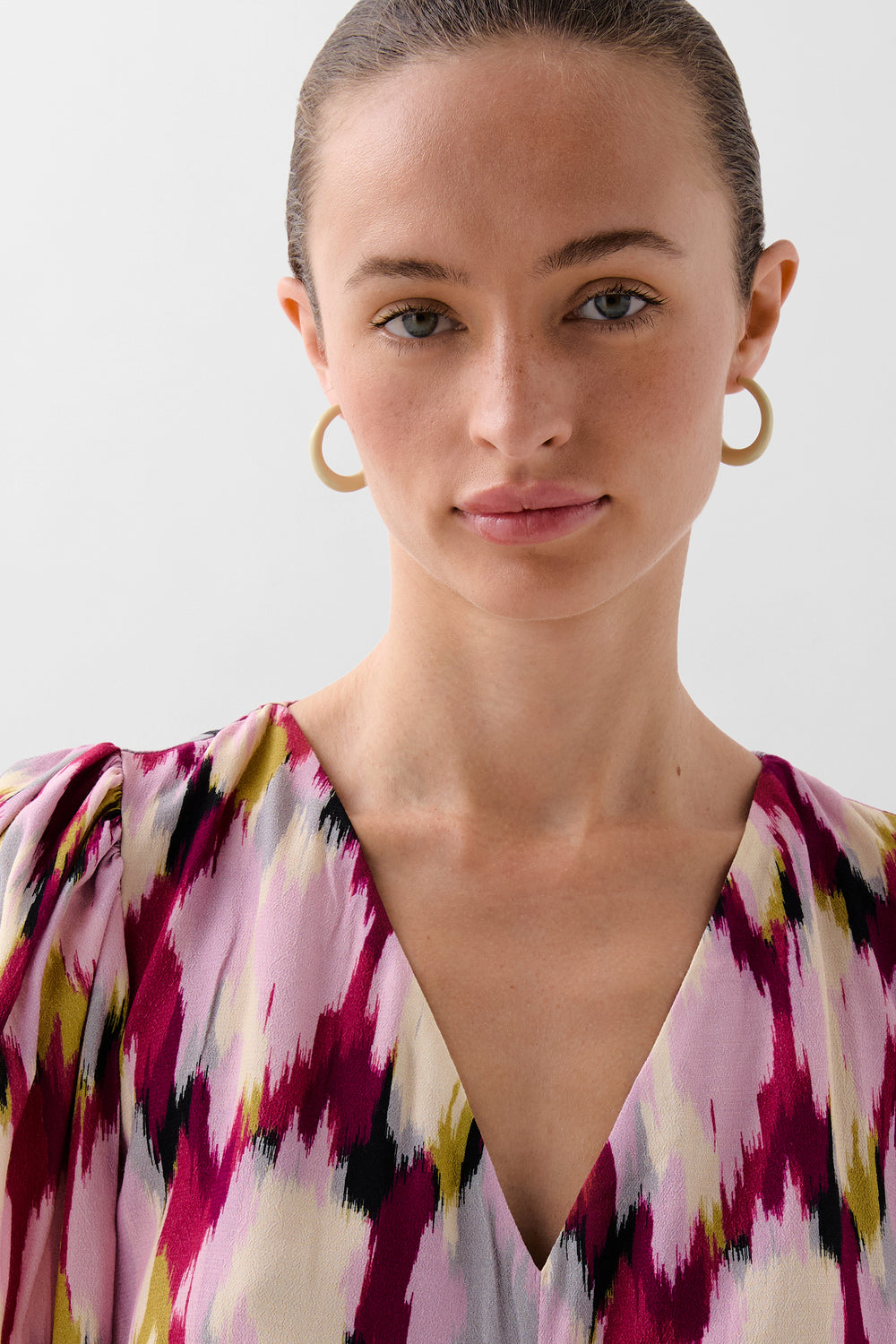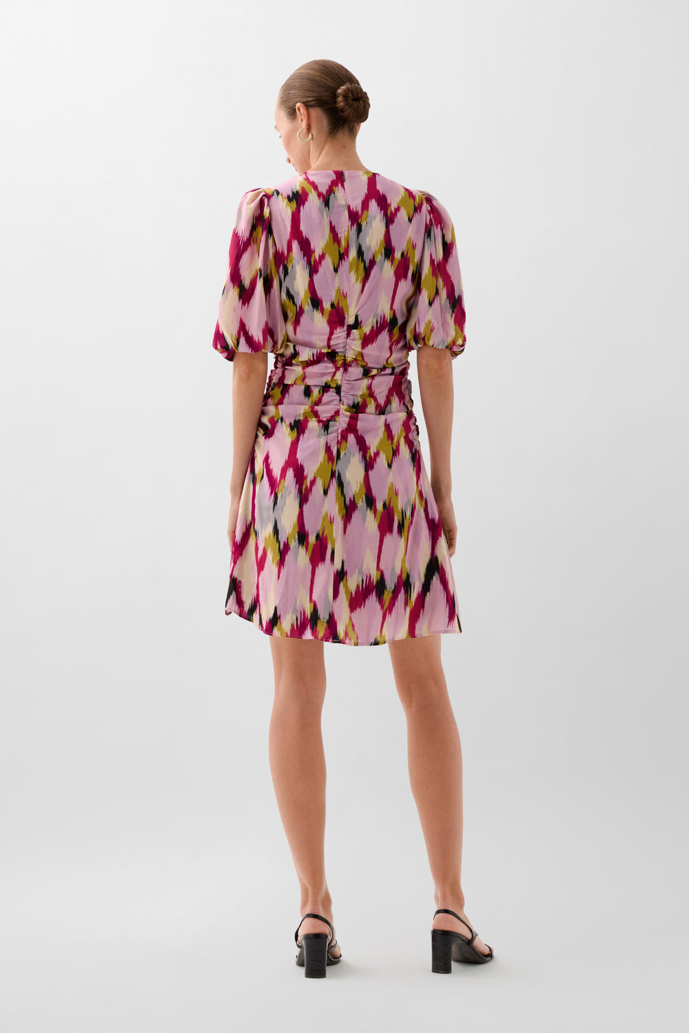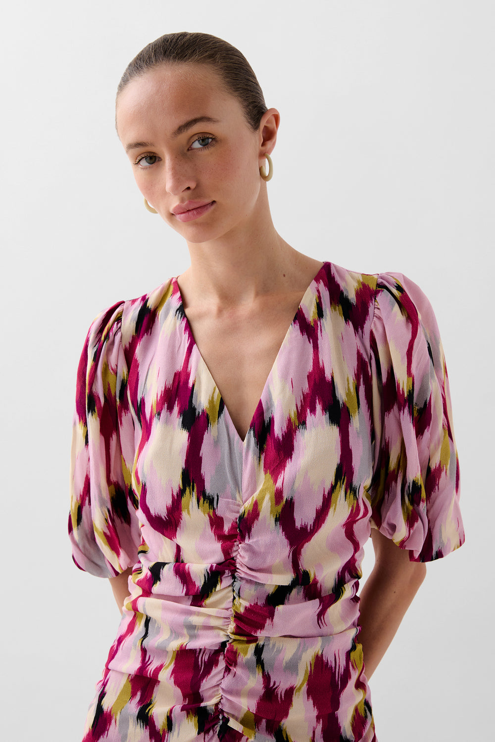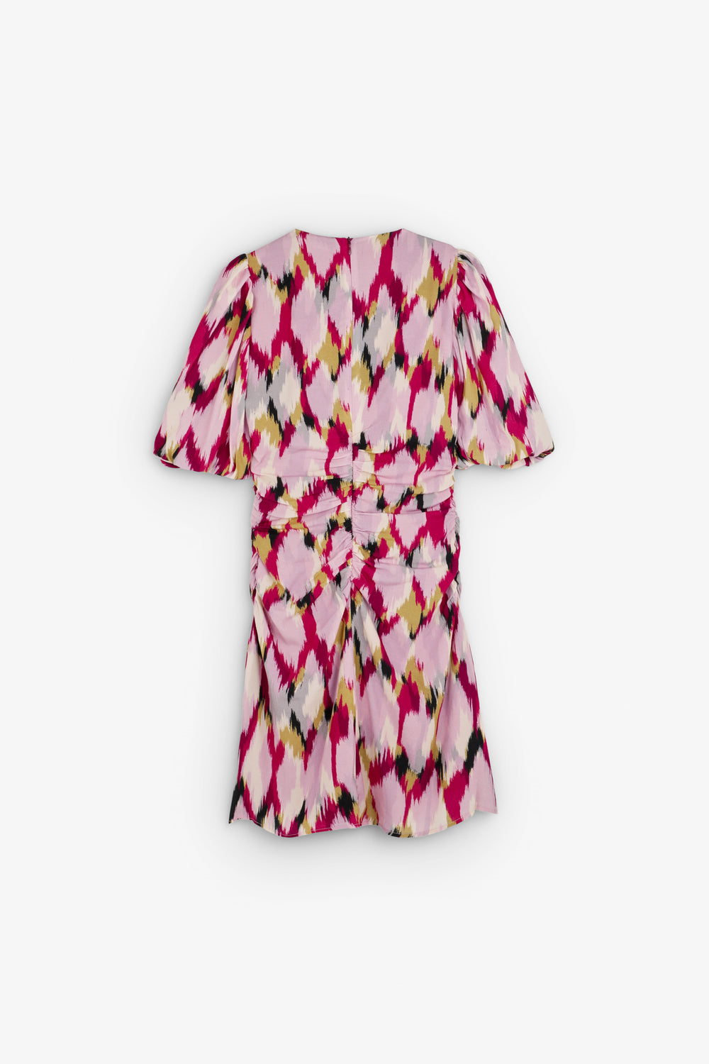 Vestido confeccionado en tejido fluido. Mini, corte Slim Fit, escote en V con frunces en cintura y manga corta abullonada. Forro interior y cierre trasero con cremallera oculta.