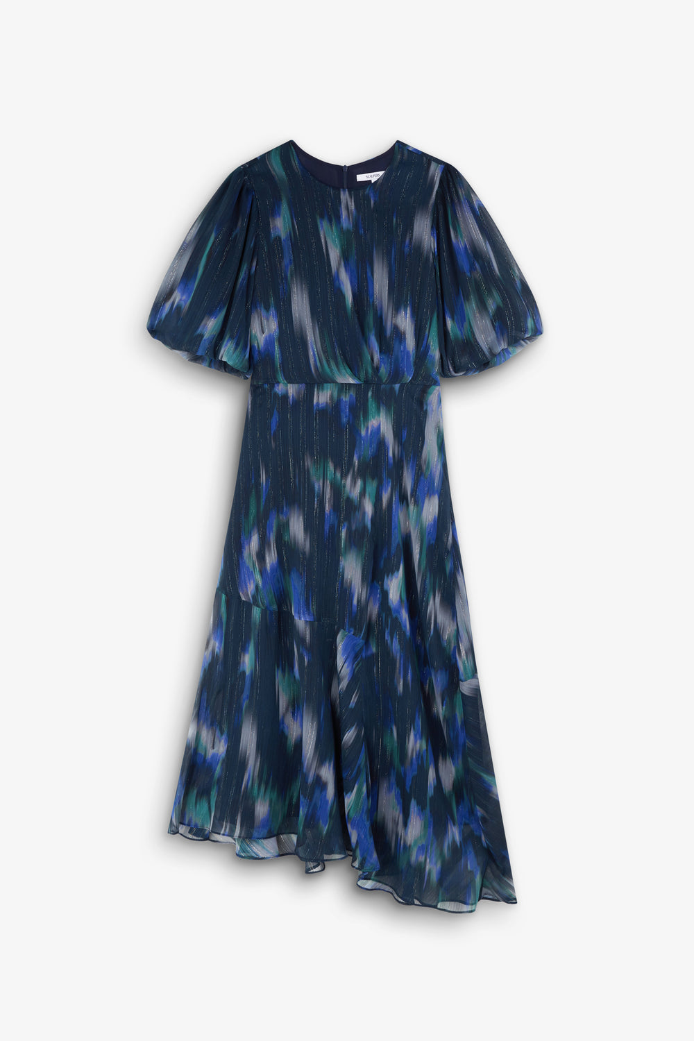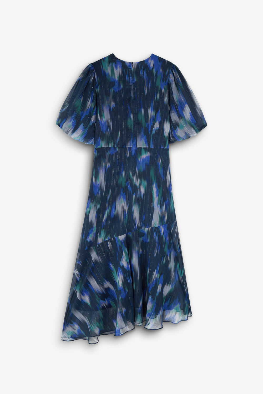 Vestido con print confeccionado en tejido fluido. Regular fit, cuello redondo y cierre con cremallera. Manga corta abullonada.