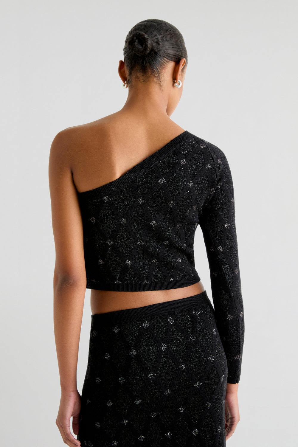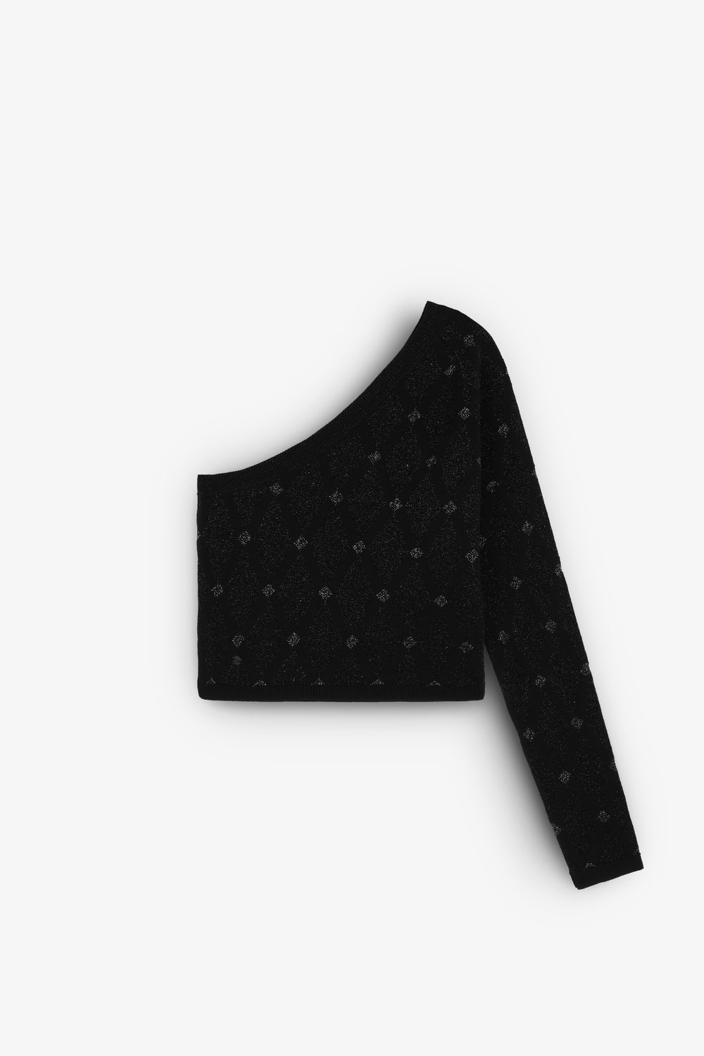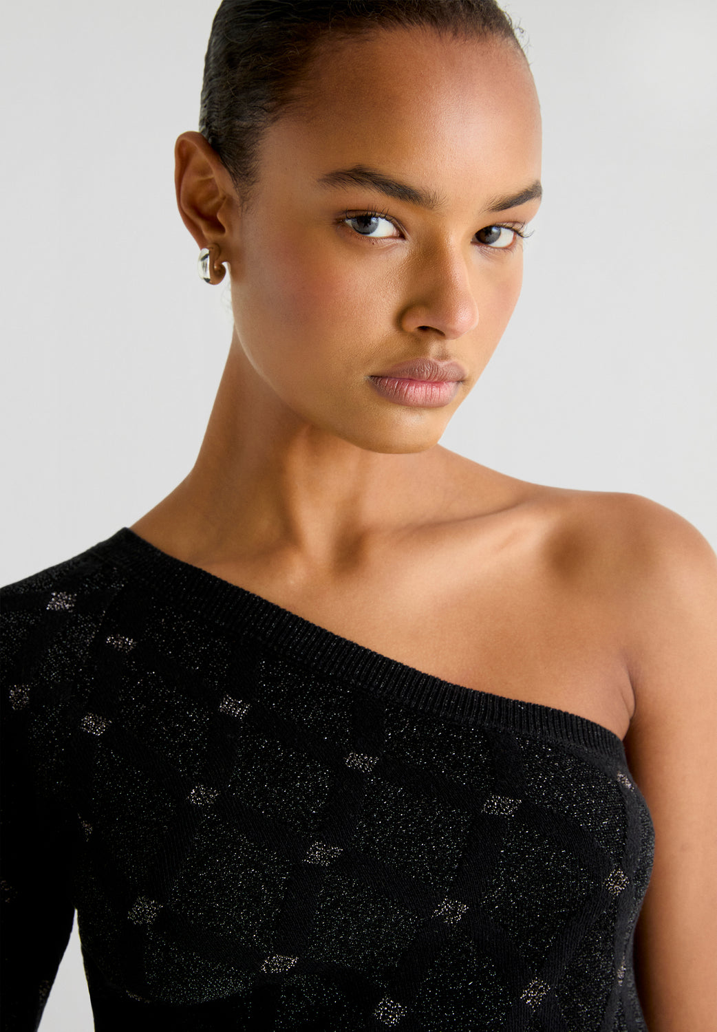 Top de punto con jacquard de rombos confeccionado en tejido con lurex. Slim fit, escote asimétrico y manga larga.
