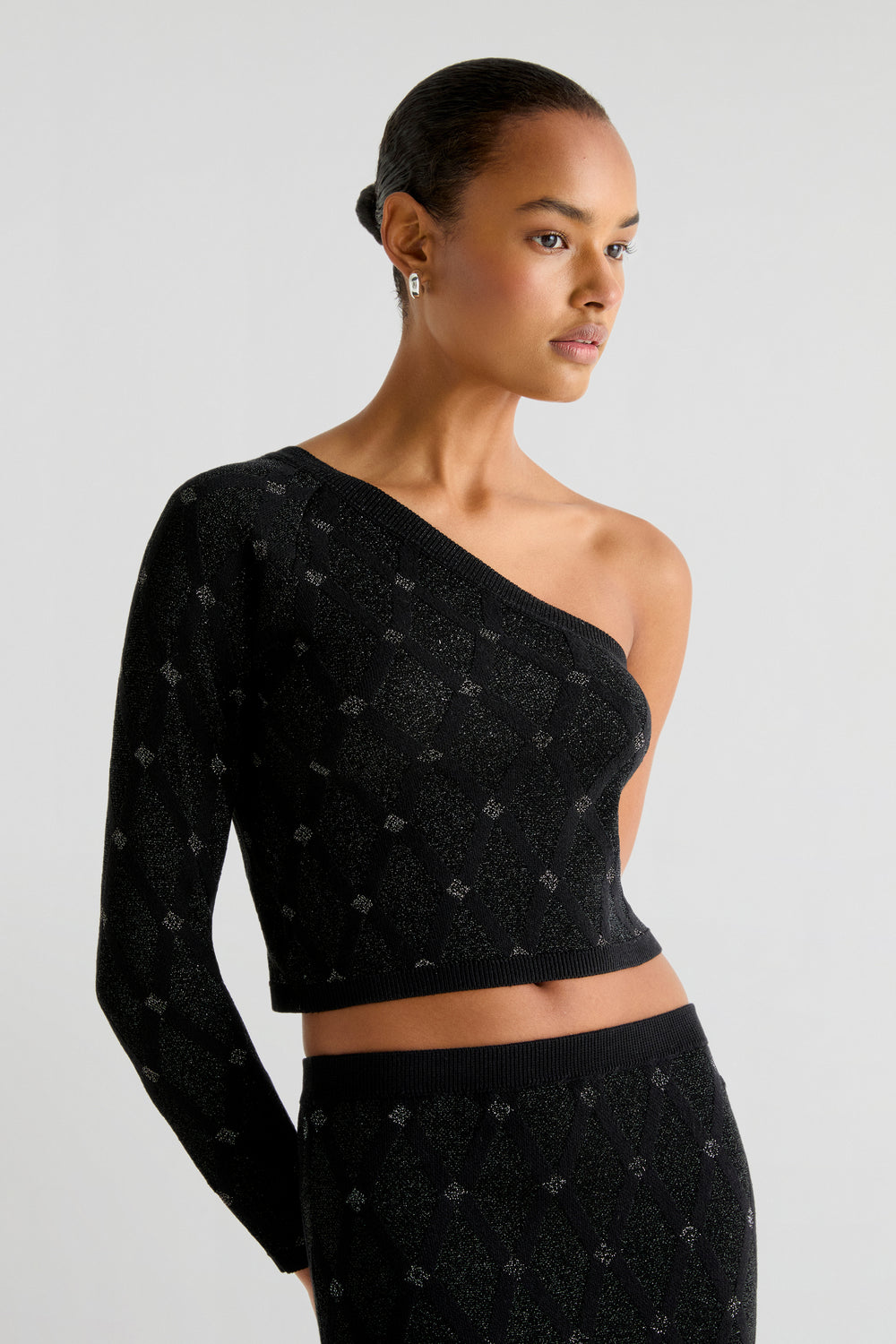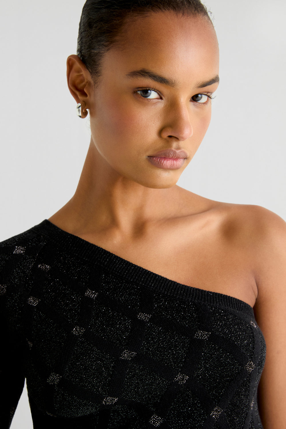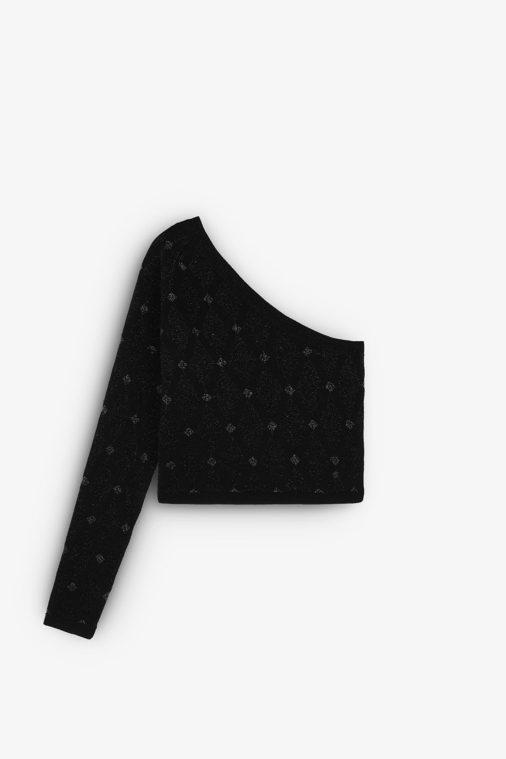 Top de punto con jacquard de rombos confeccionado en tejido con lurex. Slim fit, escote asimétrico y manga larga.