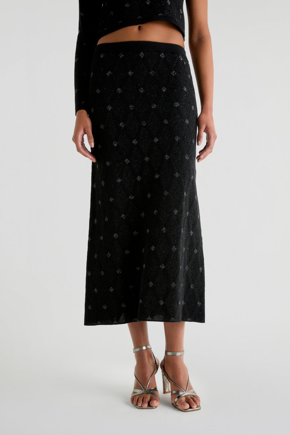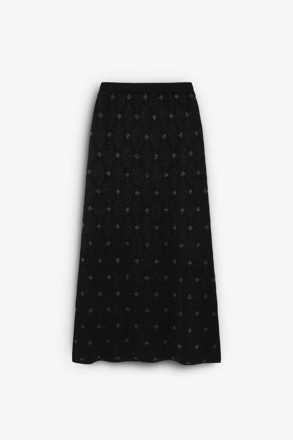 Falda midi de punto haciendo rombos confeccionada en lurex. Slim fit, cinturilla elástica.