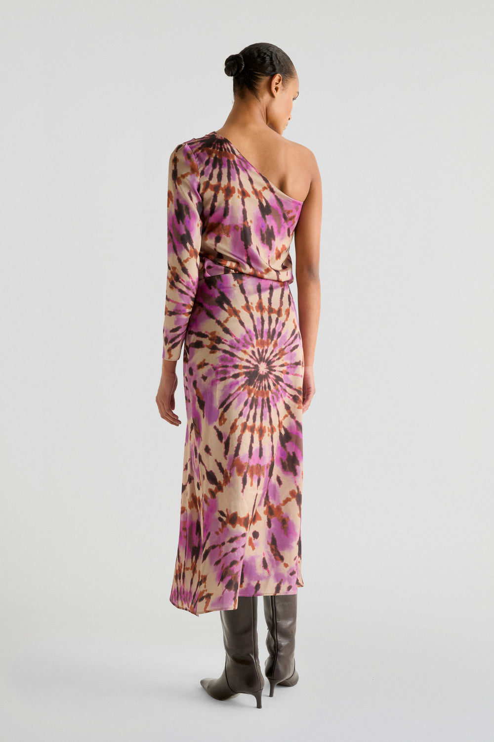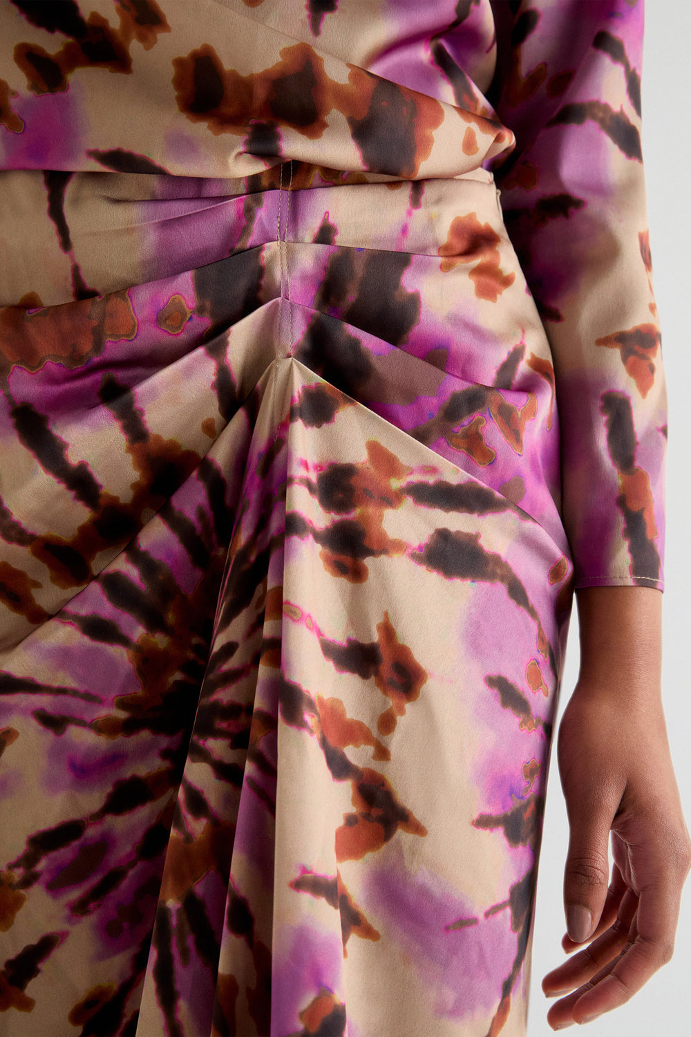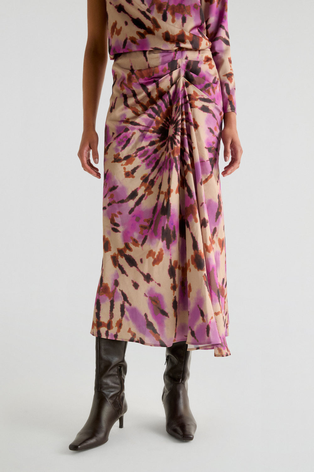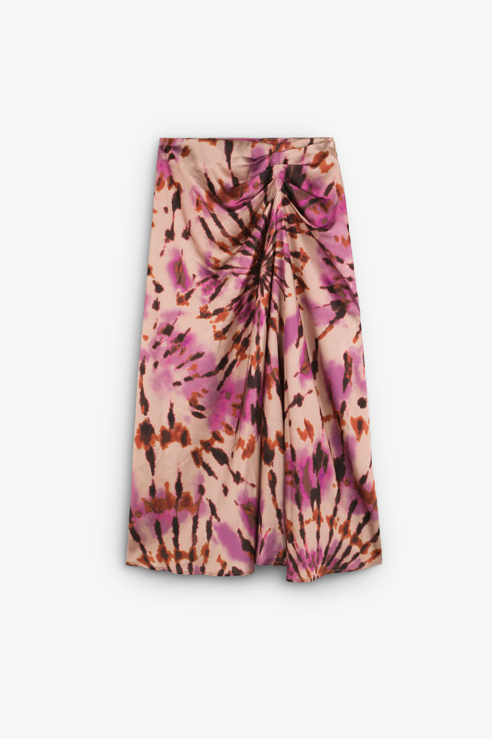 Falda midi con print tie dye confeccionada en tejido fluido. Regular fit con drapeado frontal y cierre lateral.