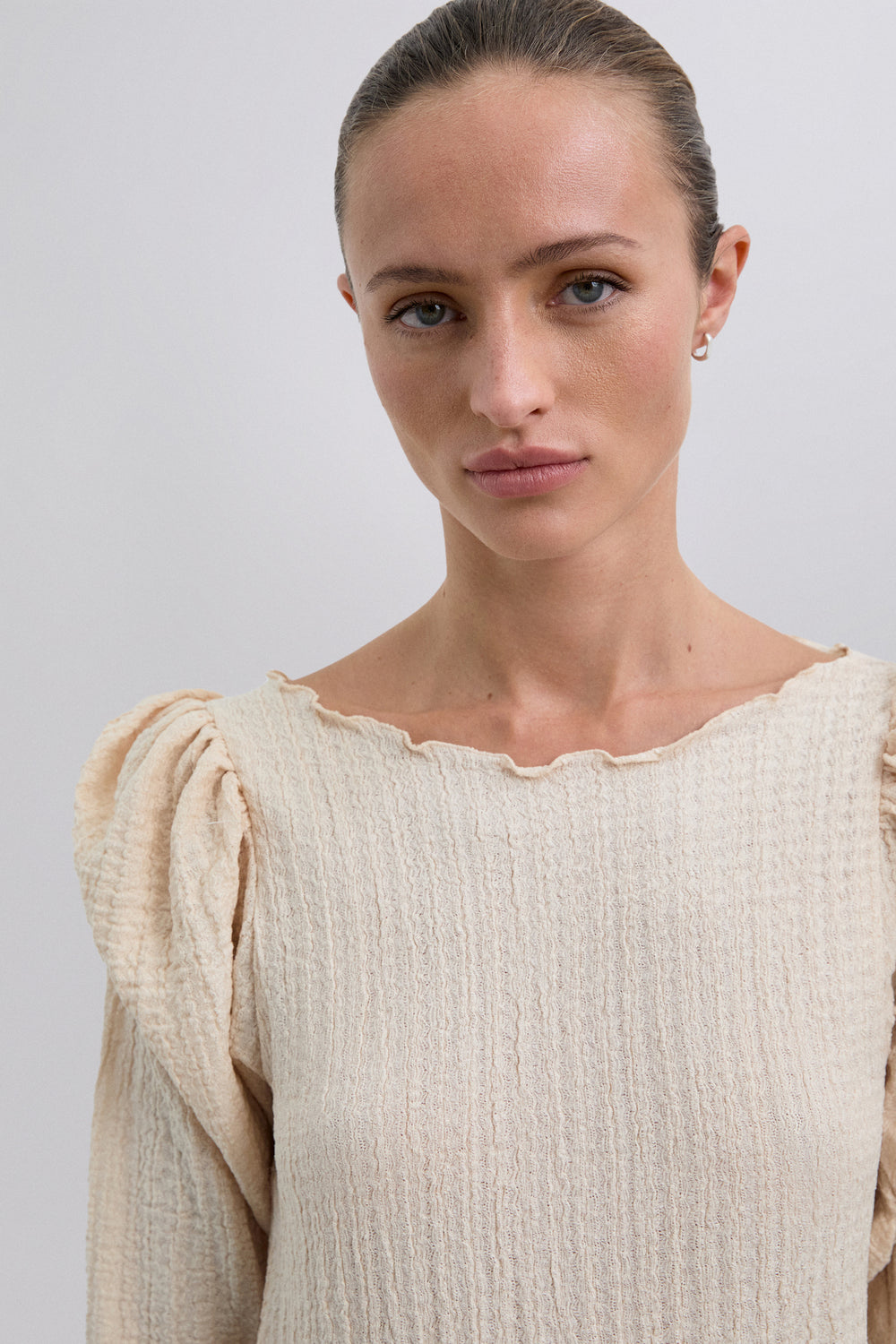 Camiseta confeccionada en tejido con textura ligeramente elástica. Manga larga. Cuello redondo. Volantes en hombros.