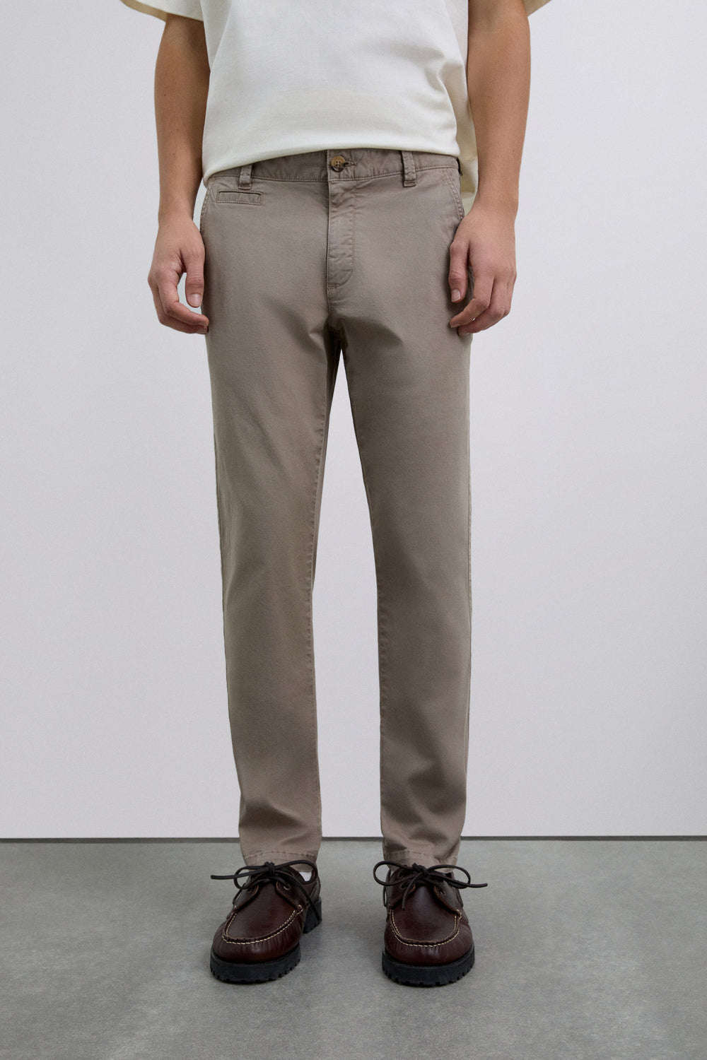 Pantalón chino casual confeccionado en mezcla de algodón ligeramente elástico. Cierre con botón y cremallera . Bolsillos laterales y traseros. Trabillas en cintura. Detalle de etiqueta interior con logo en cintura.