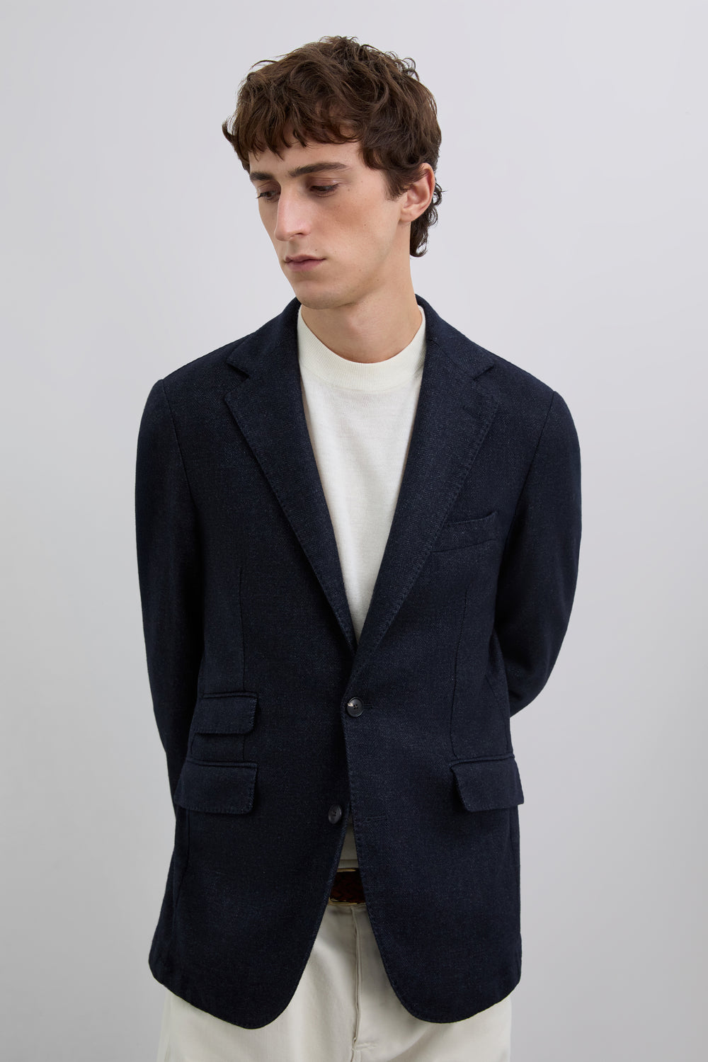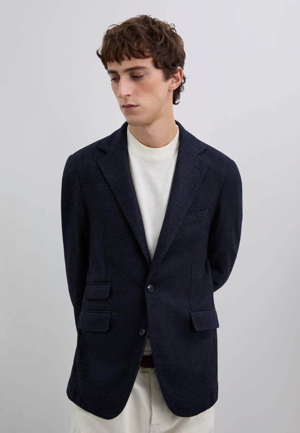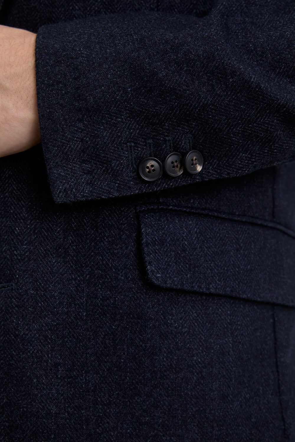 Americana confeccionada en lana con tejidos de la casa italiana Bellandi. Diseño en espiga. Tres bolsillos con solapa. Cierre de doble botón. Bolsillo de pecho con ribete. Manga larga.