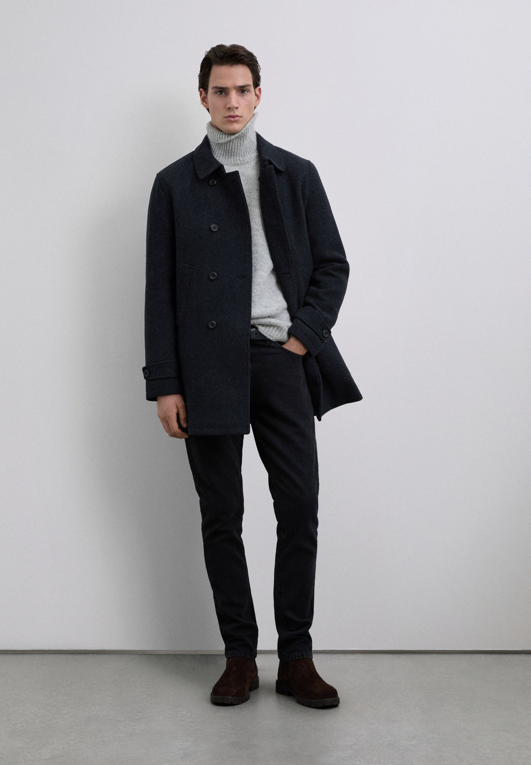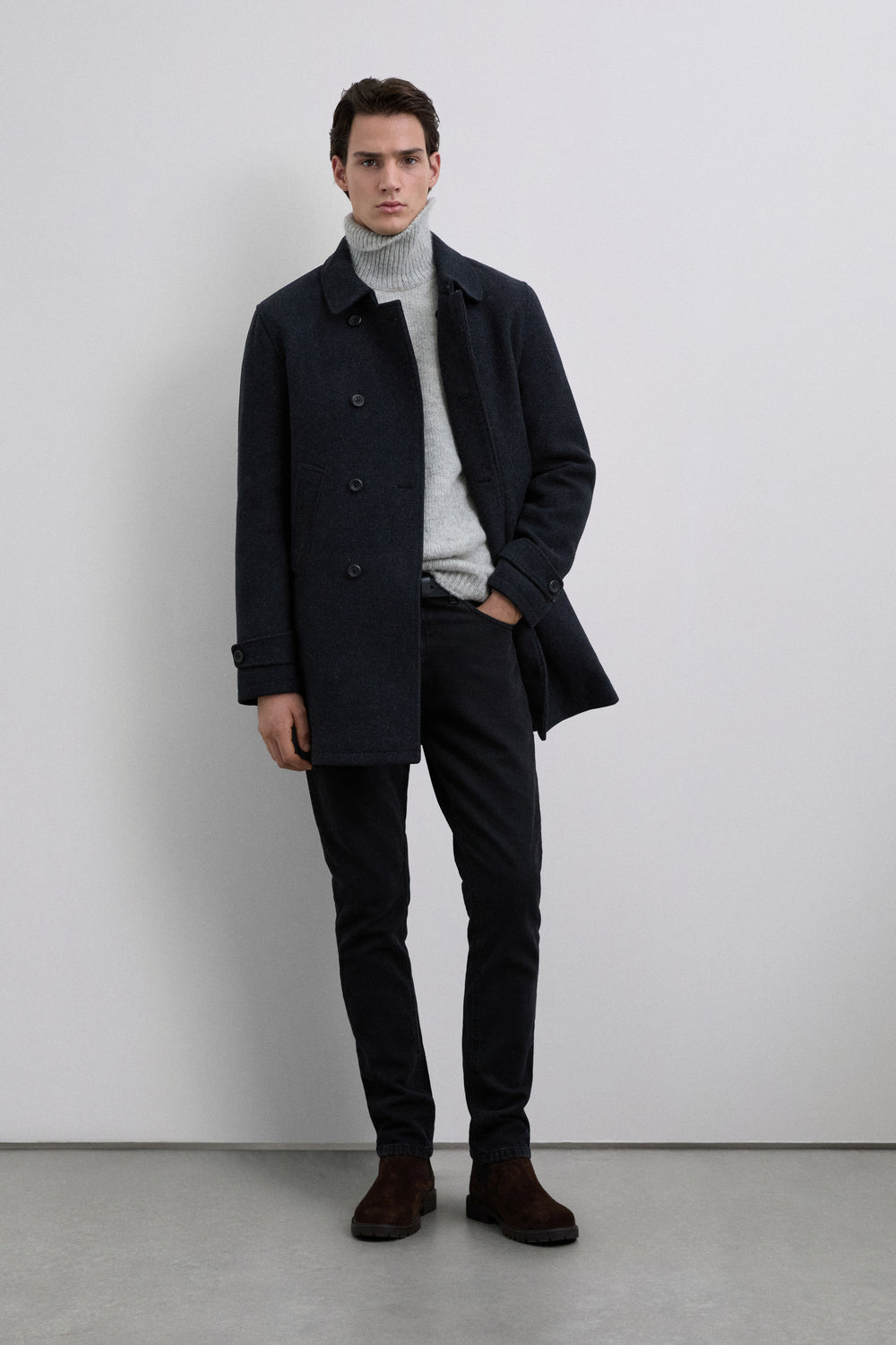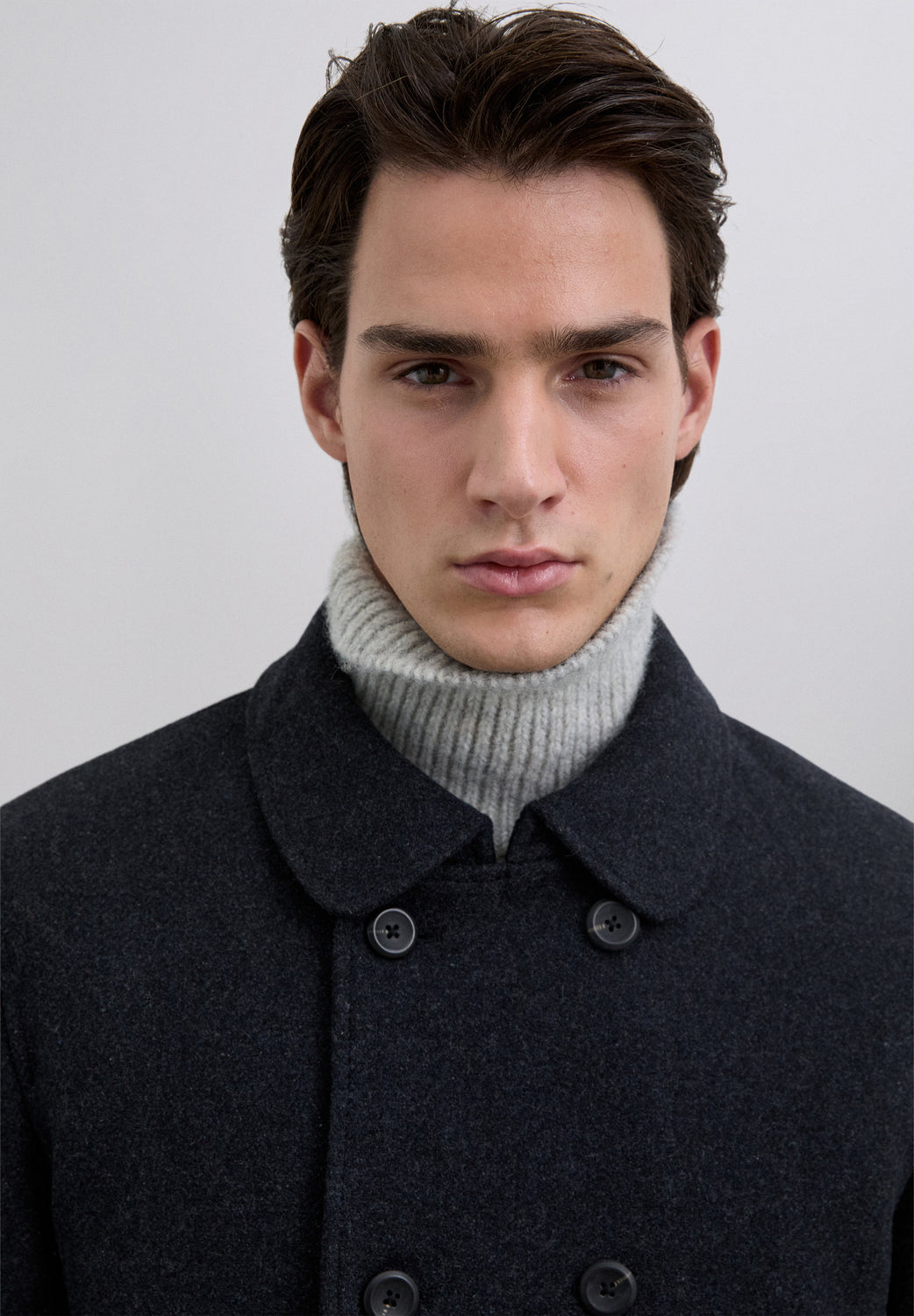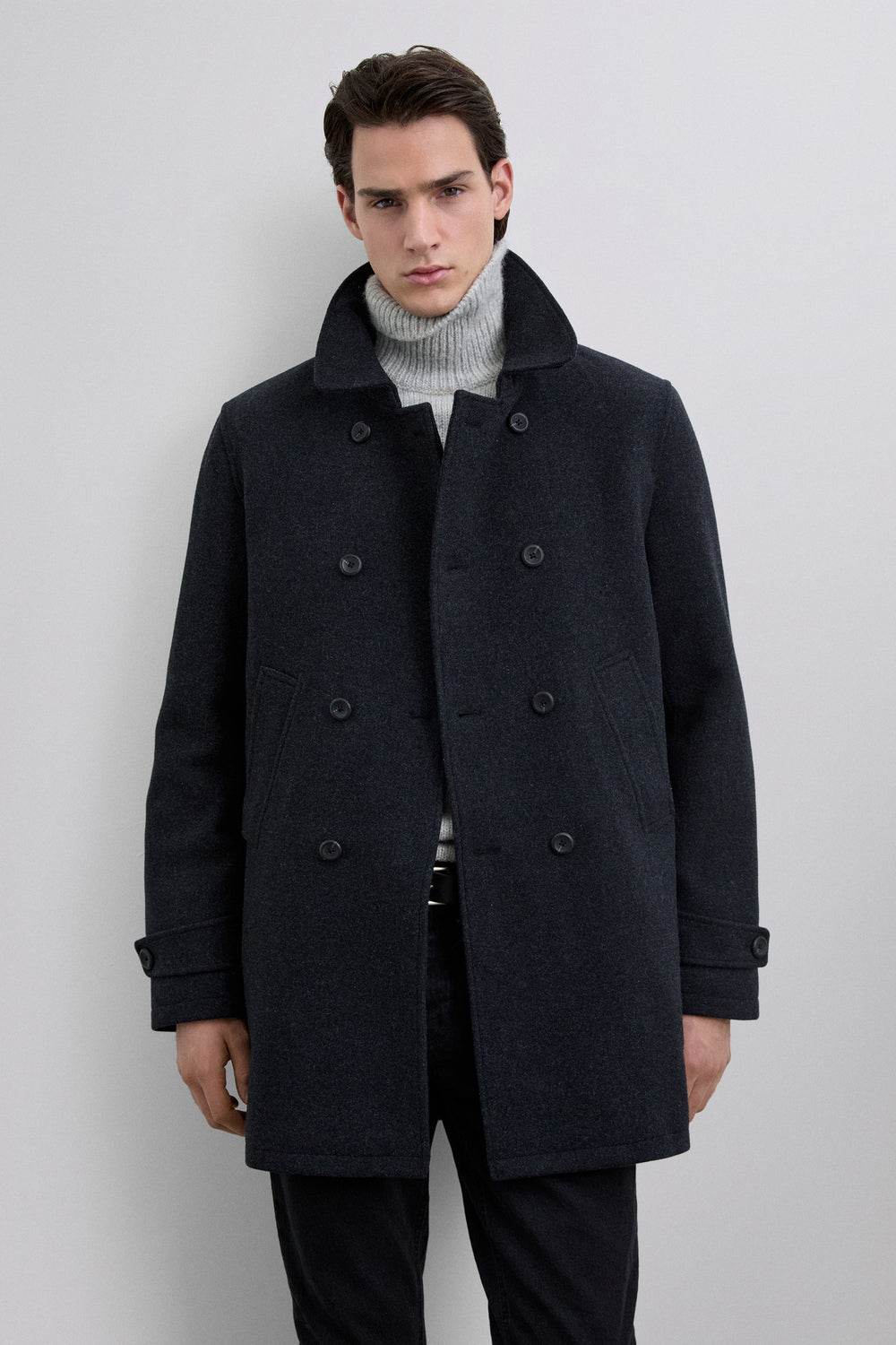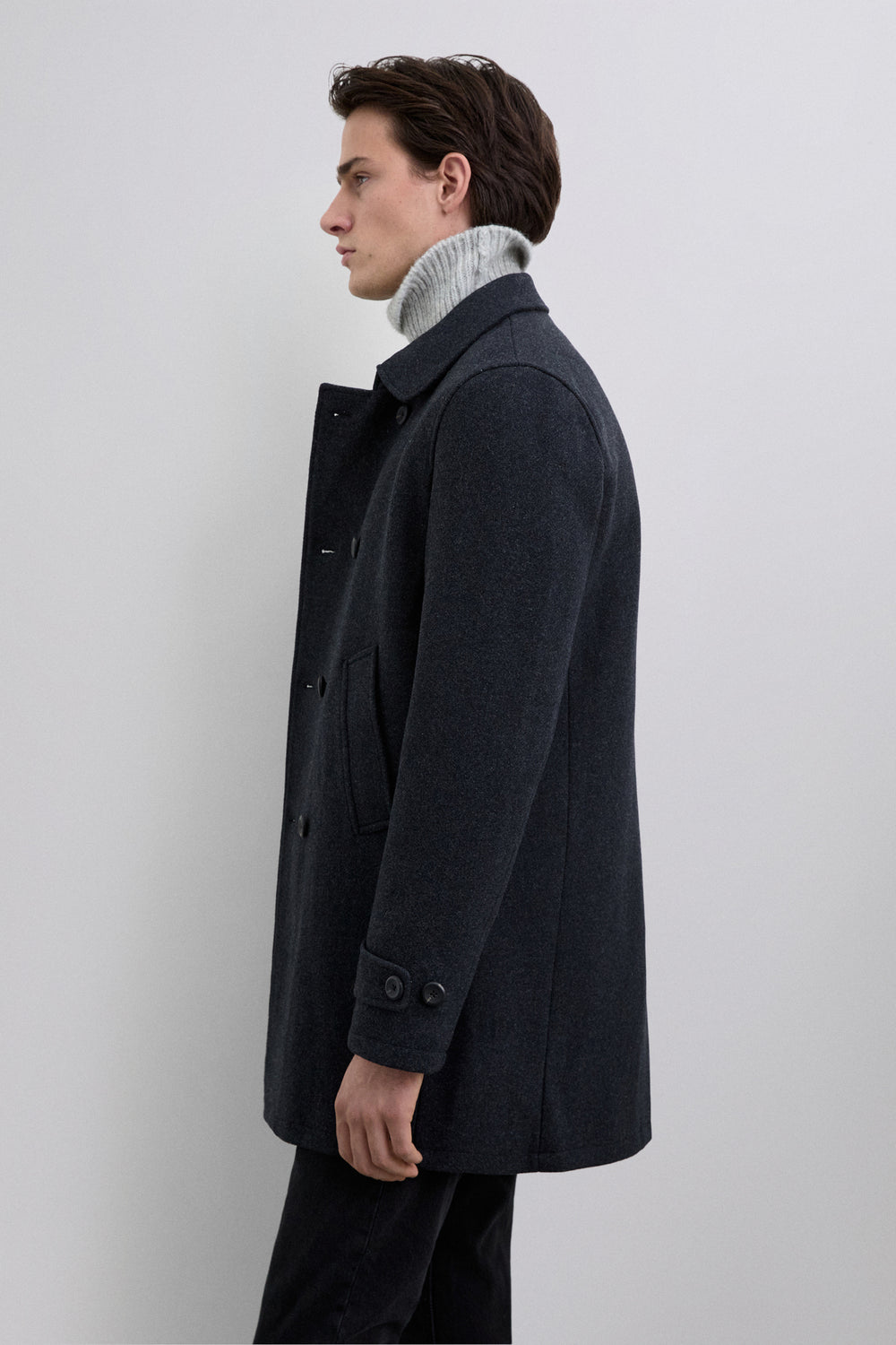 Abrigo cruzado confeccionado en mezcla de lana. Abotonadura en frontal. Bolsillos vivos inclinados en frontal. Bolsillo interior. Detalle de puño con trabillas.
