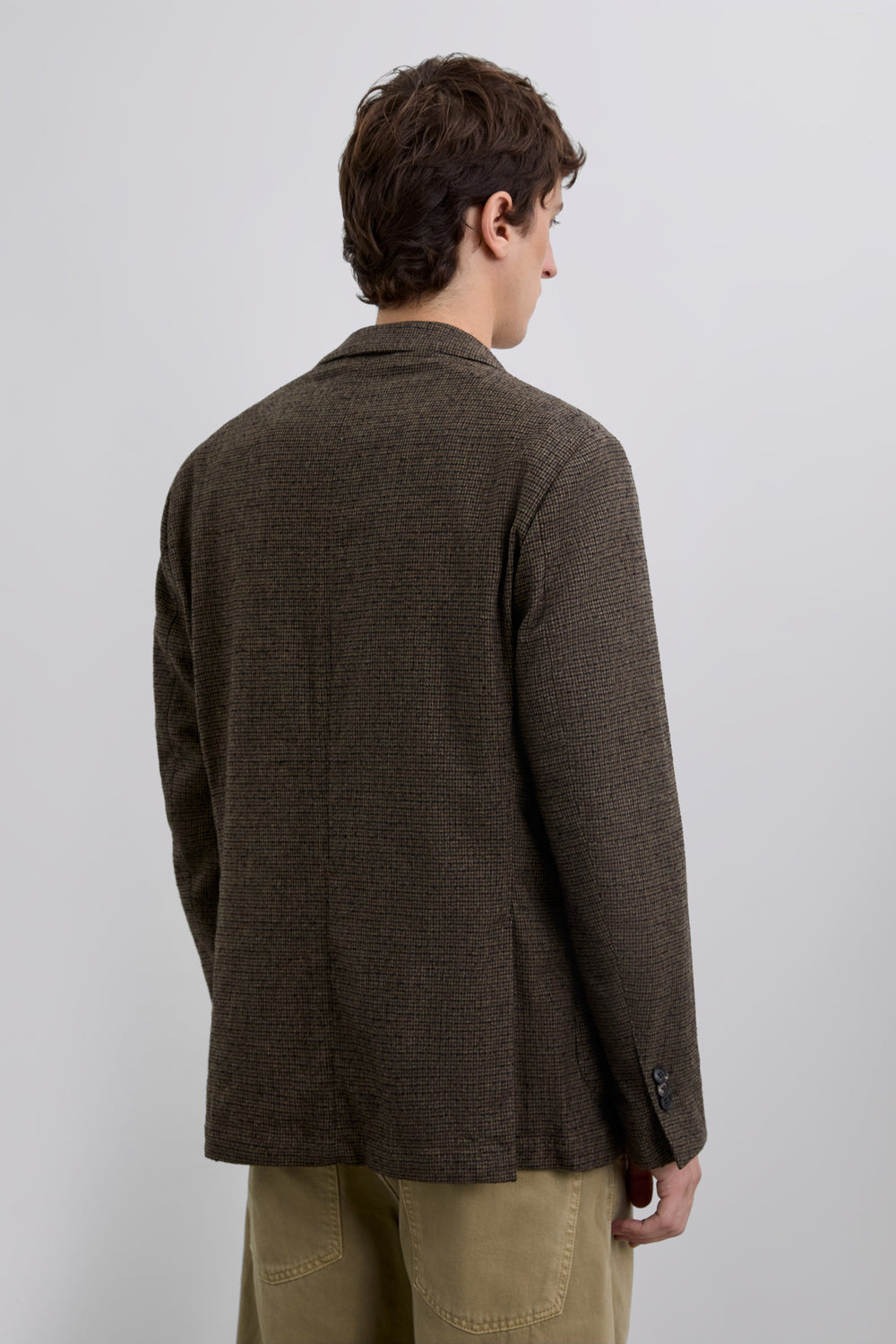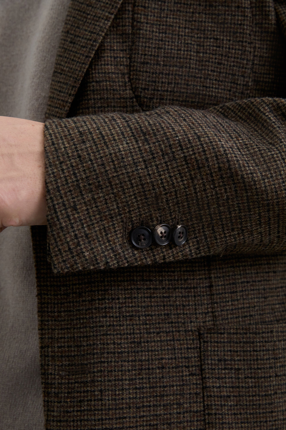 Americana de cuadros confeccionada en lana. Solapa regular. Tres bolsillos parche. Cierre frontal con dos botones. Manga larga.