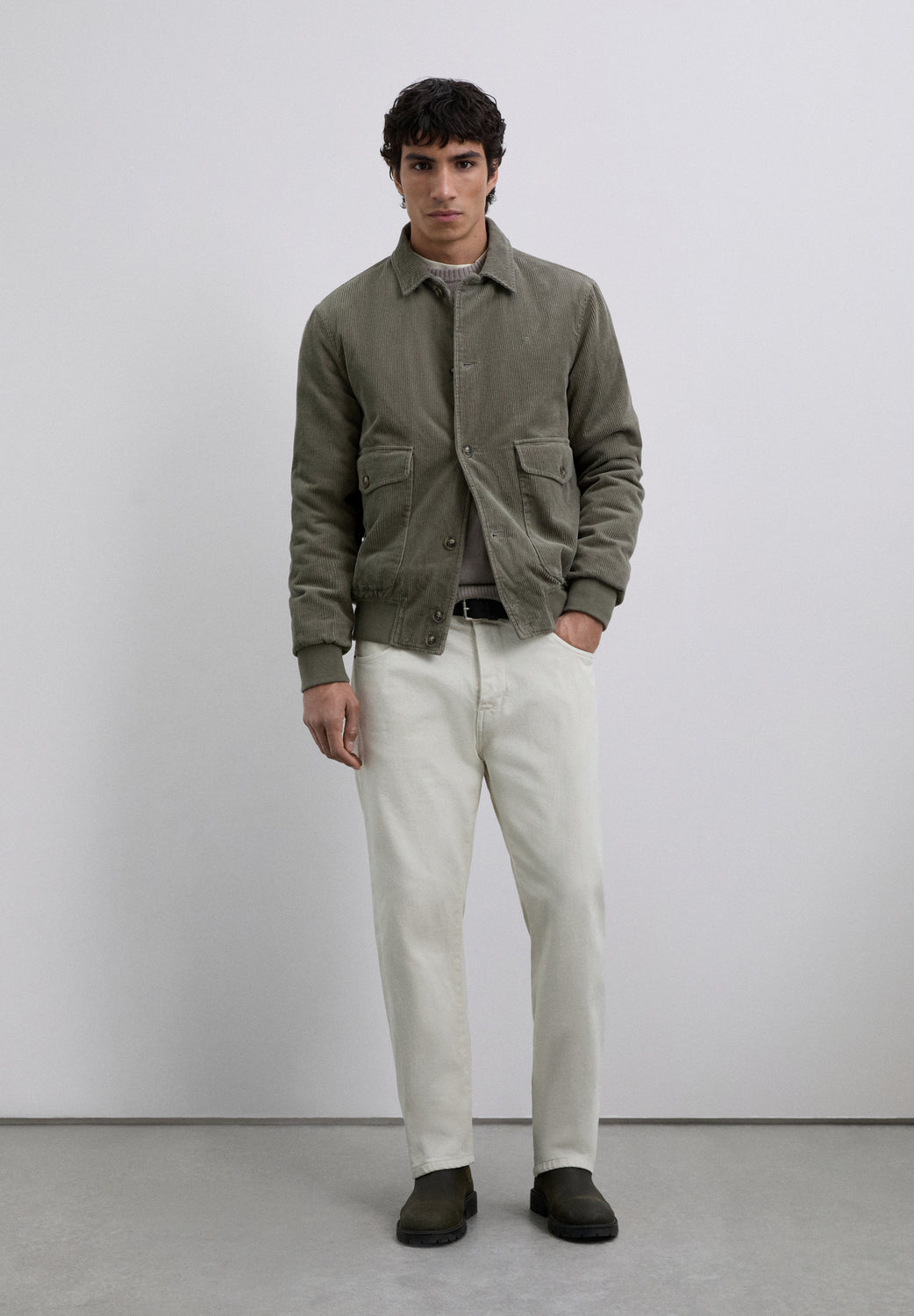 Chaqueta bomber de pana confeccionada en 100% algodón BCI. Cierre frontal mediante botones. Dobles bolsillos delanteros con cierre mediante botón. Puños y cintura acabados en rib. Detalle de logo bordado a tono en pecho.