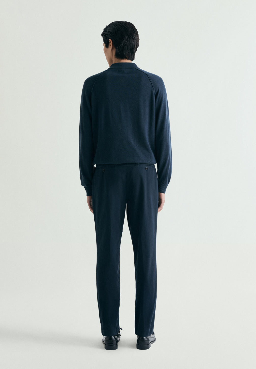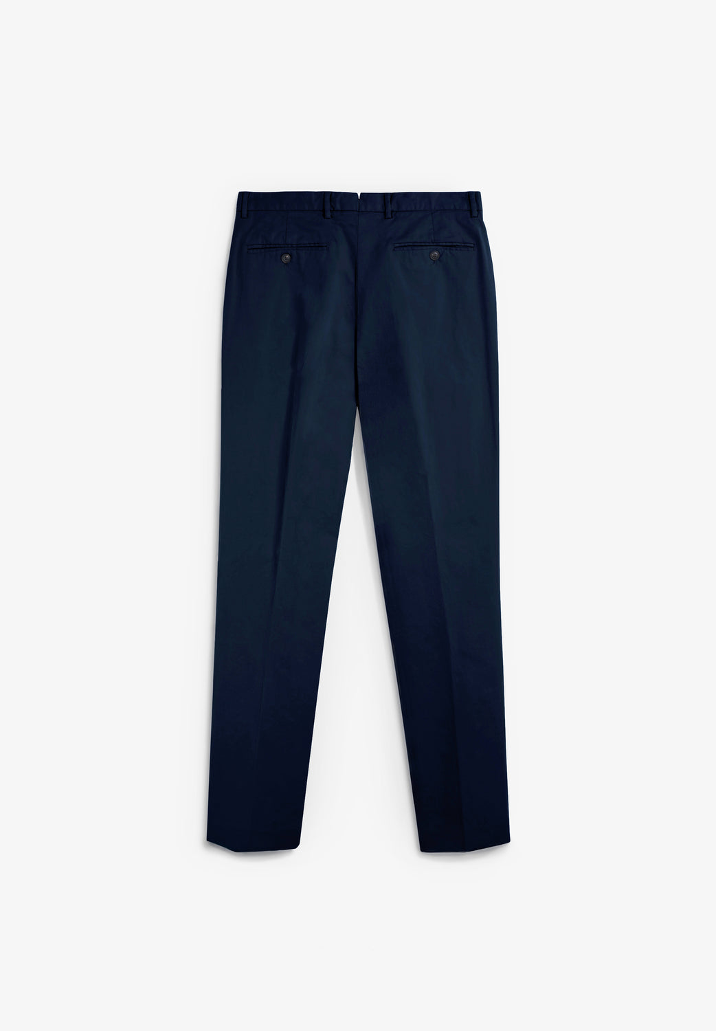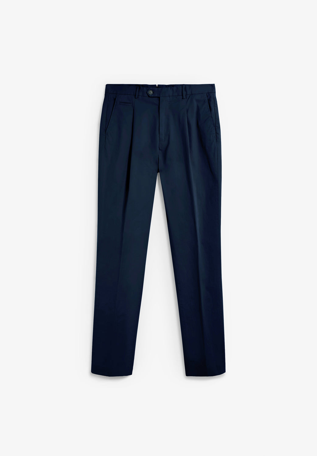 Pantalón confeccionado en mezcla de algodón. Pinzas frontales. Cierre frontal mediante botón prolongado en cintura. Trabillas en la cintura. Bolsillos traseros de doble vivo y botón.