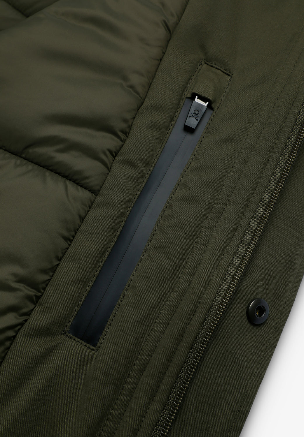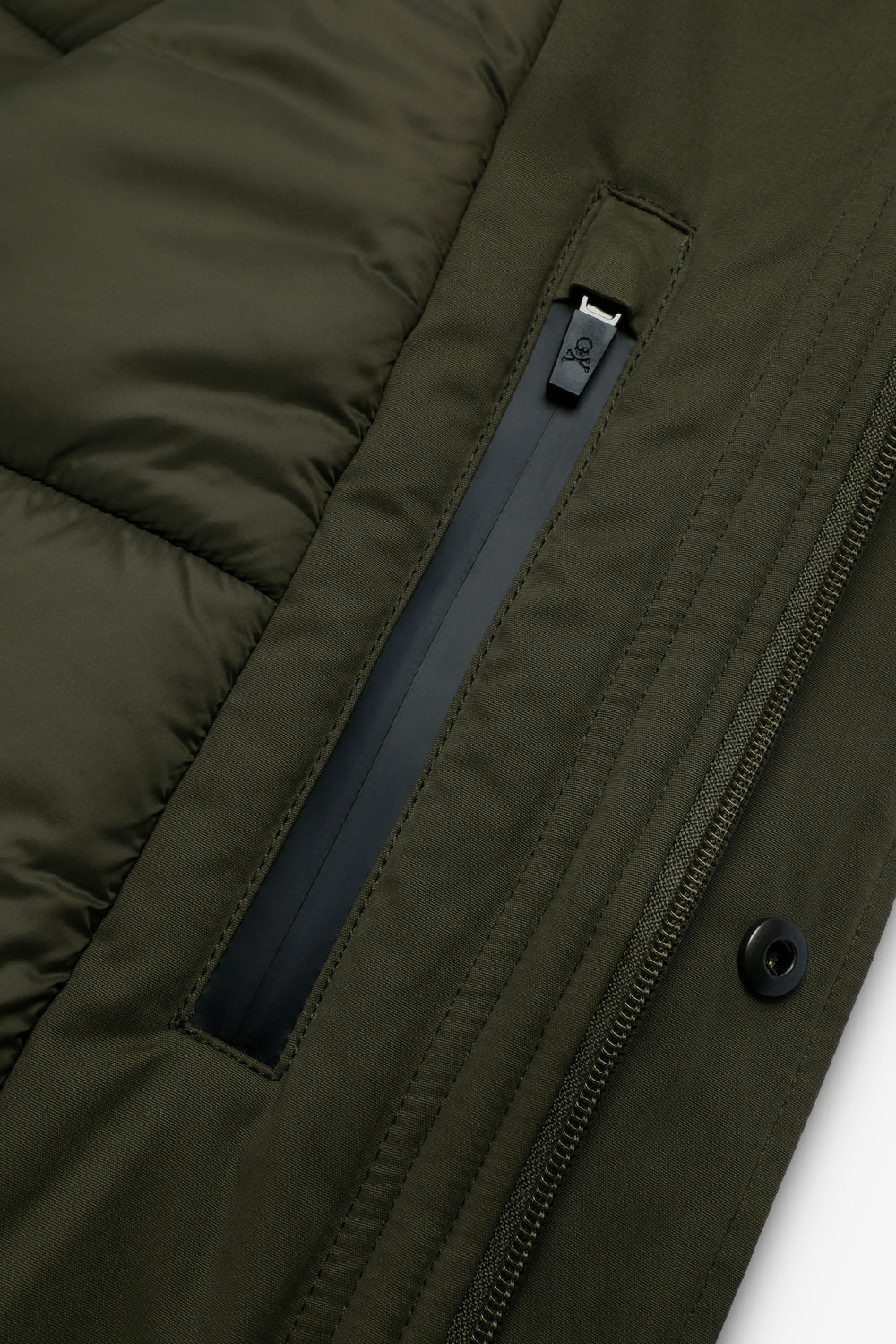 Parka confeccionada en algodón. Capucha desmontable con cordón ajustable. Bolsillos frontales con solapa. Relleno Thermolite®. Estampado de alta densidad en manga. Cierre mediante cremallera termosellada. Detalle de acabados en tiradores con logo.
