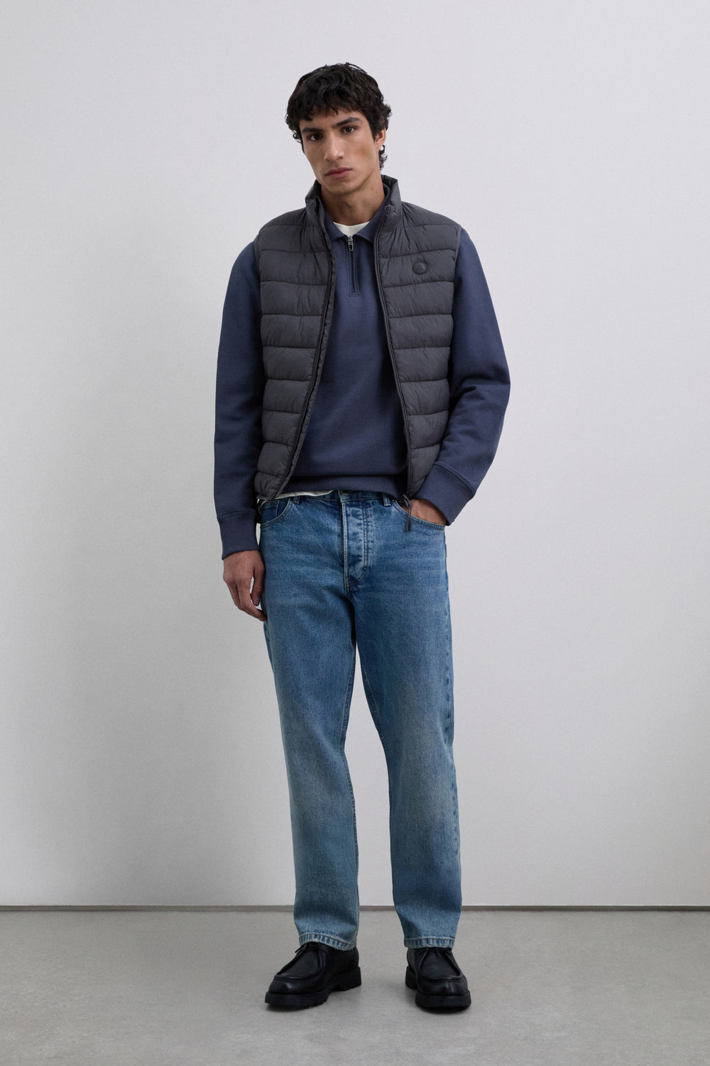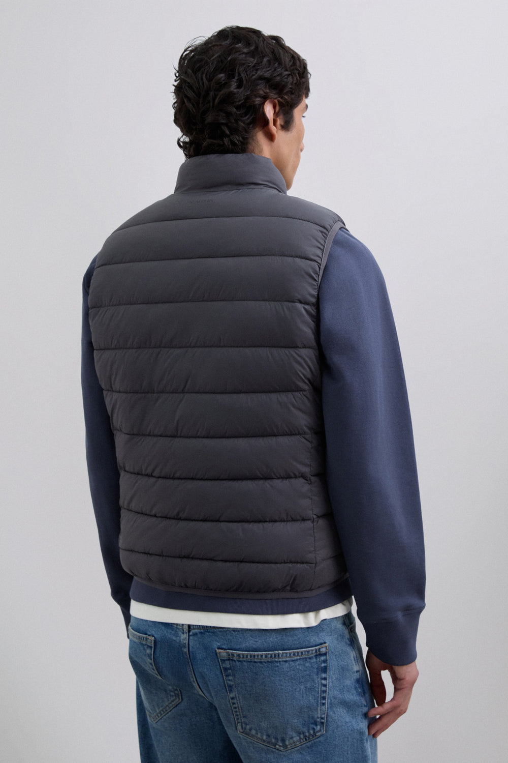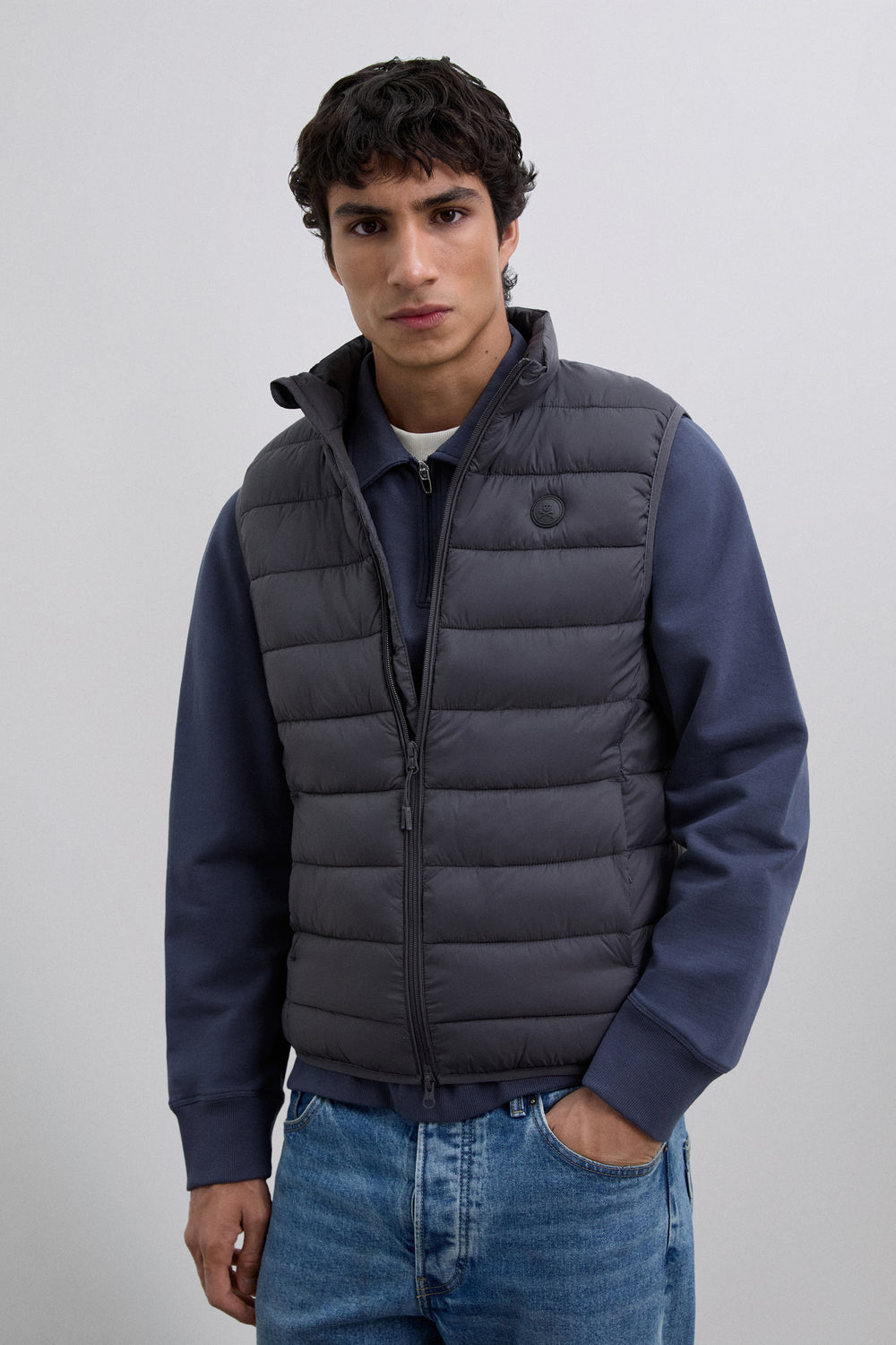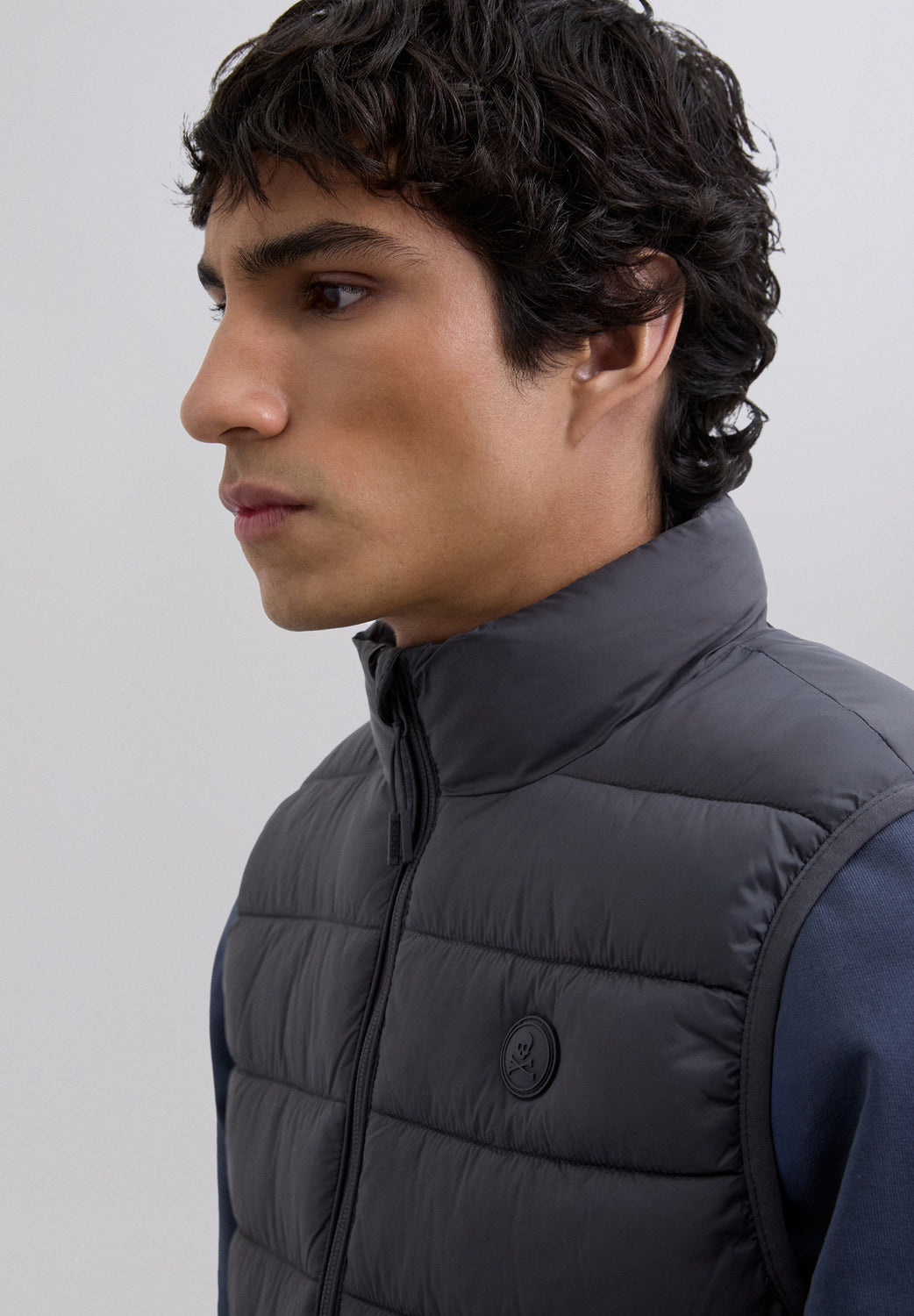 Chaleco acolchado. Repelente al agua. Forro interior confeccionado en tejido técnico. Bolsillos laterales ocultos con forro polar. Cierre mediante cremallera de doble carro grabada. Parche engomado con logotipo al tono en pecho.