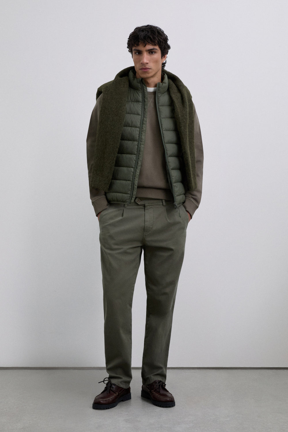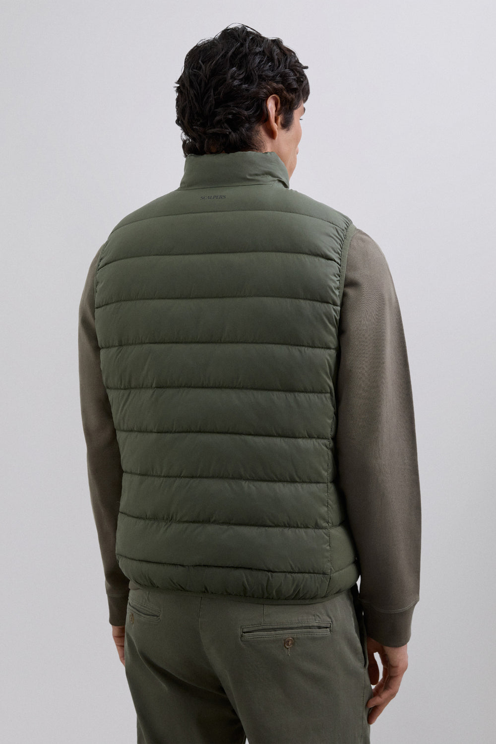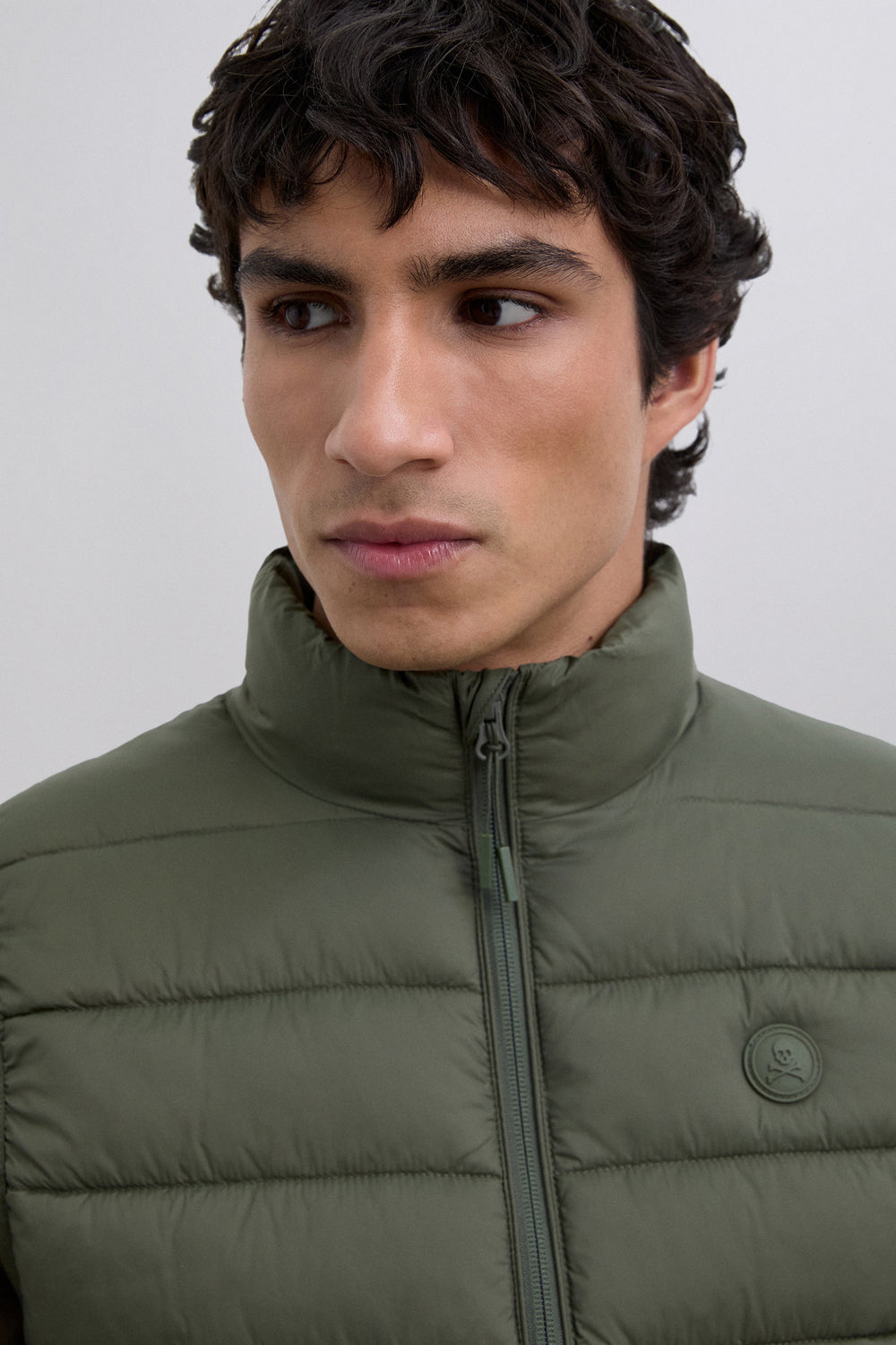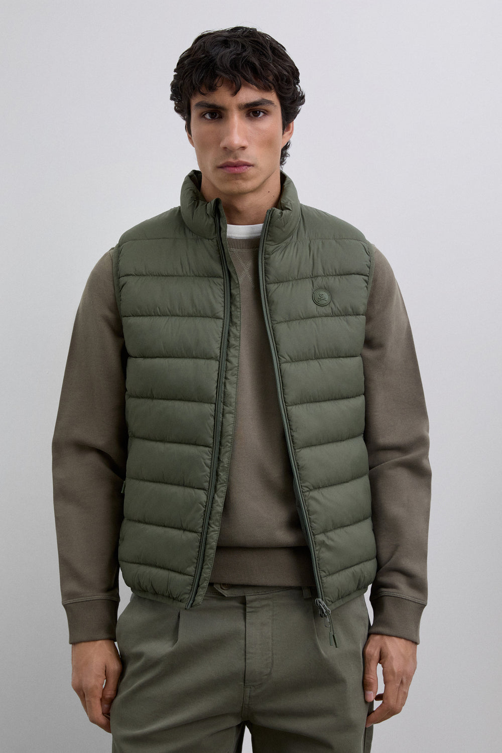 Chaleco acolchado. Repelente al agua. Forro interior confeccionado en tejido técnico. Bolsillos laterales ocultos con forro polar. Cierre mediante cremallera de doble carro grabada. Parche engomado con logotipo al tono en pecho.